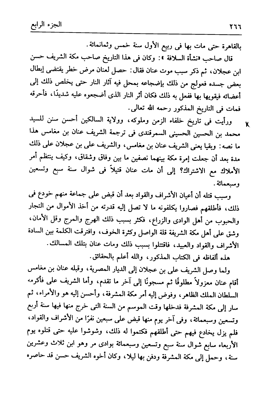 بِالْقَاهِرَةِ حَتَّى مَاتَ بهَا فِي ربيع الأول سنة خمس وَثَمَانمِائَة قَالَ صَاحب نشأة السلافة وَكَانَ فِي هَذَا التَّارِيخ صَاحب مَكَّة الشريف حسن ابْن عجلَان ثمَّ ذكر سَبَب موت عنان فَقَالَ حصل لعنان مرض خطر يَقْتَضِي إبِْطَال بعض جسده فعولج من ذَلِك بإضجاعه بِمحل فِيهِ آثَار النَّار حَتَّى يخلص ذَلِك إِلَى أَعْضَائِهِ فيقويها بهَا فَفعل بِهِ ذَلِك فَكَانَ أثر النَّار الَّذِي أضجعوه عَلَيْهِ شَدِيدا فأحرقه فَمَاتَ فِي التَّارِيخ الْمَذْكُور رَحمَه الله تَعَالَى وَرَأَيْت فِي تَارِيخ خلفاء الزَّمن وملوكه وَولَايَة السالكين أحسن سنَن للسَّيِّد مُحَمَّد بن الْحُسَيْن الْحُسَيْنِي السَّمرقَنْدِي فِي تَرْجَمَة الشريف عنان بن مغامس هَذَا مَا نَصه وبقيا يَعْنِي الشريف عنان بن مغامس والشريف عَليّ بن عجلَان على ذَلِك مُدَّة بعد أَن جعلت إمرة مَكَّة بَينهمَا نِصْفَيْنِ مَا بَين وفَاق وشقاق وَكَيف يَنْتَظِم أَمر الْأَمْلَاك مَعَ الِاشْتِرَاك إِلَى أَن مَاتَ عنان قَتِيلا فِي شَوَّال سنة سبع وَتِسْعين وَسَبْعمائة وَسبب قَتله أَن أَعْيَان الْأَشْرَاف والقواد بعد أَن قبض على جمَاعَة مِنْهُم خودع فِي ذَلِك فَأَطْلَقَهُمْ فصاروا يكلفونه مَا لَا تصل إِلَيْهِ قدرته من أَخذ الْأَمْوَال من التُّجَّار والحبوب من أهل الْوَادي والزراع فَكثر بِسَبَب ذَلِك الْهَرج والمرج وَقل الْأمان وشق على أهل مَكَّة الشَّرِيفَة قلَّة الْوَاصِل وَكَثْرَة الْخَوْف وافترقت الْكَلِمَة بَين السَّادة الْأَشْرَاف والقواد وَالْعَبِيد فَاقْتَتلُوا بِسَبَب ذَلِك وَمَات عنان بِتِلْكَ المسالك هَذِه أَلْفَاظه فِي الْكتاب الْمَذْكُور وَالله أعلم بالحقائق وَلما وصل الشريف عَليّ بن عجلَان إِلَى الديار المصرية وَقَبله عنان بن مغامس أَقَامَ عنان معزولاً مطلوقاً ثمَّ مسجوناً إِلَى آخر مَا تقدم وَأما الشريف عَليّ فَأكْرمه السُّلْطَان الْملك الظَّاهِر وفوض إِلَيْهِ أَمر مَكَّة المشرفة وَأحسن إِلَيْهِ هُوَ والأمراء ثمَّ سَار إِلَى مَكَّة المشرفة فَدَخلَهَا وَقت الْمَوْسِم من السّنة الَّتِي خرج مِنْهَا فِيهَا سنة أَربع وَتِسْعين وَسَبْعمائة وَفِي آخر يَوْم مِنْهَا قبض على سبعين نَفرا من الأِشراف والقواد فَلم يزل يُخَادع فيهم حَتَّى أطلقهُم فَكَتَمُوا لَهُ ذَلِك وشوشوا عَلَيْهِ حَتَّى قَتَلُوهُ يَوْم الْأَرْبَعَاء سَابِع شَوَّال سنة سبع وَتِسْعين وَسَبْعمائة بوادي مر وَهُوَ ابْن ثلاَث وَعشْرين سنة وَحمل إِلَى مَكَّة المشرفة وَدفن بهَا لَيْلًا وَكَانَ أَخُوهُ الشريف حسن قد حاصره