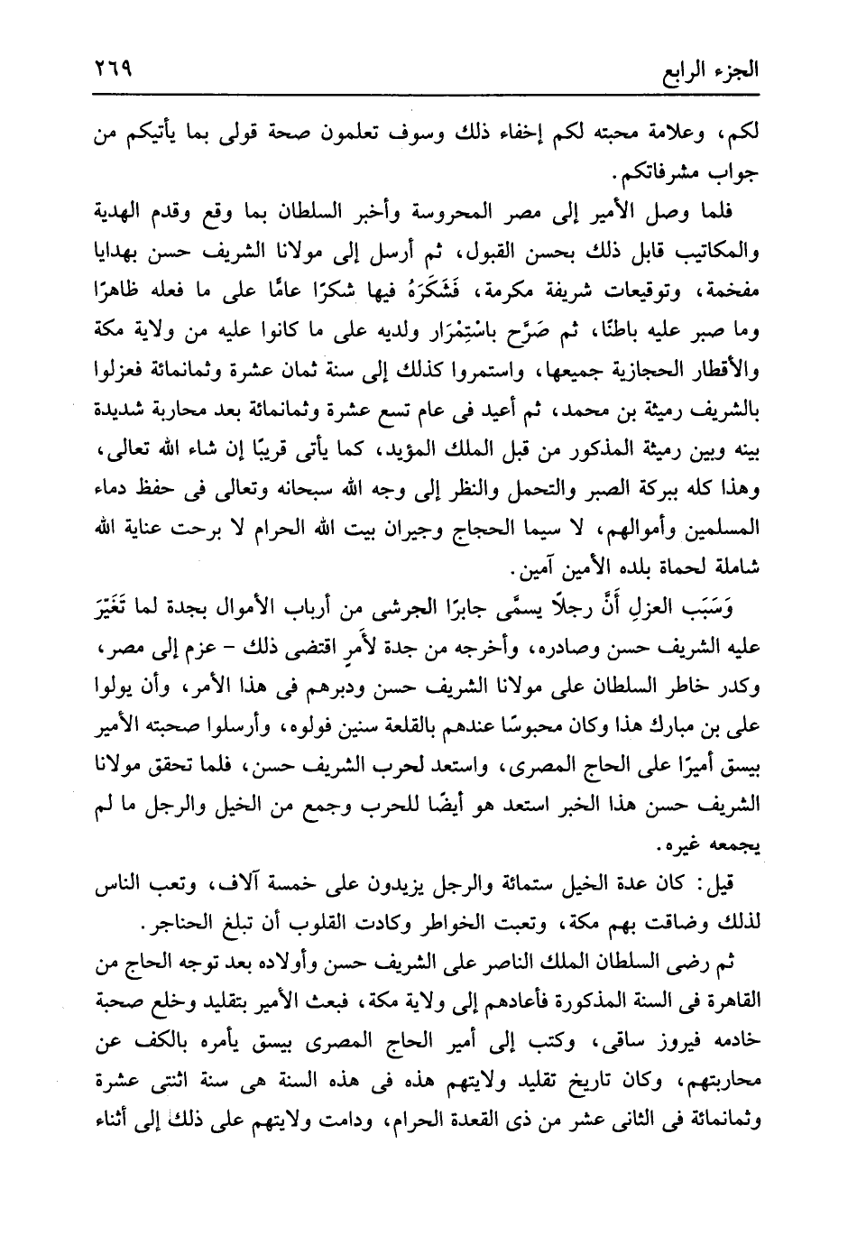 لكم وعلامة محبته لكم إخفاء ذَلِك وسوف تعلمُونَ صِحَة قولي بِمَا يأتيكم من جَوَاب مشرفاتكم فَلَمَّا وصل الْأَمِير إِلَى مصر المحروسة وَأخْبر السُّلْطَان بِمَا وَقع وَقدم الْهَدِيَّة والمكاتيب قَابل ذَلِك بِحسن الْقبُول ثمَّ أرسل إِلَى مَوْلَانَا الشريف حسن بِهَدَايَا مفخمة وتوقيعات شريفة مكرمَة فَشَكَرَه فِيهَا شكرا عَاما على مَا فعله ظَاهرا وَمَا صَبر عَلَيْهِ بَاطِنا ثمَّ صَرح باستِمرار ولديه على مَا كَانُوا عَلَيْهِ من ولَايَة مَكَّة والأقطار الحجازية جَمِيعهَا واستمروا كَذَلِك إِلَى سنة ثَمَان عشرَة وَثَمَانمِائَة فعزلوا بالشريف رميثة بن مُحَمَّد ثمَّ أُعِيد فِي عَام تسع عشرَة وَثَمَانمِائَة بعد محاربة شَدِيدَة بَينه وَبَين رميثة الْمَذْكُور من قبل الْملك الْمُؤَيد كَمَا يَأْتِي قَرِيبا إِن شَاءَ الله تَعَالَى وَهَذَا كُله ببركة الصَّبْر والتحمل وَالنَّظَر إِلَى وَجه الله سُبْحَانَهُ وَتَعَالَى فِي حفظ دِمَاء الْمُسلمين وَأَمْوَالهمْ لَا سِيمَا الْحجَّاج وجيران بَيت الله الْحَرَام لَا بَرحت عناية الله شَامِلَة لحماة بَلَده الْأمين آمين وَسبَب العزلِ أَن رجلا يُسمى جَابِرا الجرشِي من أَرْبَاب الْأَمْوَال بجدة لما تَغَيرَ عَلَيْهِ الشريف حسن وصادره وَأخرجه من جدة لأَمرٍ اقْتضى ذَلِك عزم إِلَى مصر وكدر خاطر السُّلْطَان على مَوْلَانَا الشريف حسن ودبرهم فِي هَذَا الْأَمر وَأَن يولوا عَليّ بن مبارك هَذَا وَكَانَ مَحْبُوسًا عِنْدهم بالقلعة سِنِين فولوه وَأَرْسلُوا صحبته الْأَمِير بيسق أَمِيرا على الْحَاج الْمصْرِيّ واستعد لِحَرْب الشريف حسن فَلَمَّا تحقق مَوْلَانَا الشريف حسن هَذَا الْخَبَر استعد هُوَ أَيْضا للحرب وَجمع من الْخَيل وَالرجل مَا لم يجمعه غَيره قيل كَانَ عدَّة الْخَيل سِتّمائَة وَالرجل يزِيدُونَ على خَمْسَة آلَاف وتعب النَّاس لذَلِك وَضَاقَتْ بهم مَكَّة وتعبت الخواطر وكادت الْقُلُوب أَن تبلغ الْحَنَاجِر ثمَّ رَضِي السُّلْطَان الْملك النَّاصِر على الشريف حسن وَأَوْلَاده بعد توجه الْحَاج من الْقَاهِرَة فِي السّنة الْمَذْكُورَة فأعادهم إِلَى ولَايَة مَكَّة فَبعث الْأَمِير بتقليد وخلع صُحْبَة خادمه فَيْرُوز ساقي وَكتب إِلَى أَمِير الْحَاج الْمصْرِيّ بيسق يَأْمُرهُ بالكف عَن محاربتهم وَكَانَ تَارِيخ تَقْلِيد ولايتهم هَذِه فِي هَذِه السنهَ هِيَ سنة اثْنَتَيْ عشرَة وَثَمَانمِائَة فِي الثَّانِي عشر من ذِي الْقعدَة الْحَرَام ودامت ولايتهم على ذَلِك إِلَى أثْنَاء