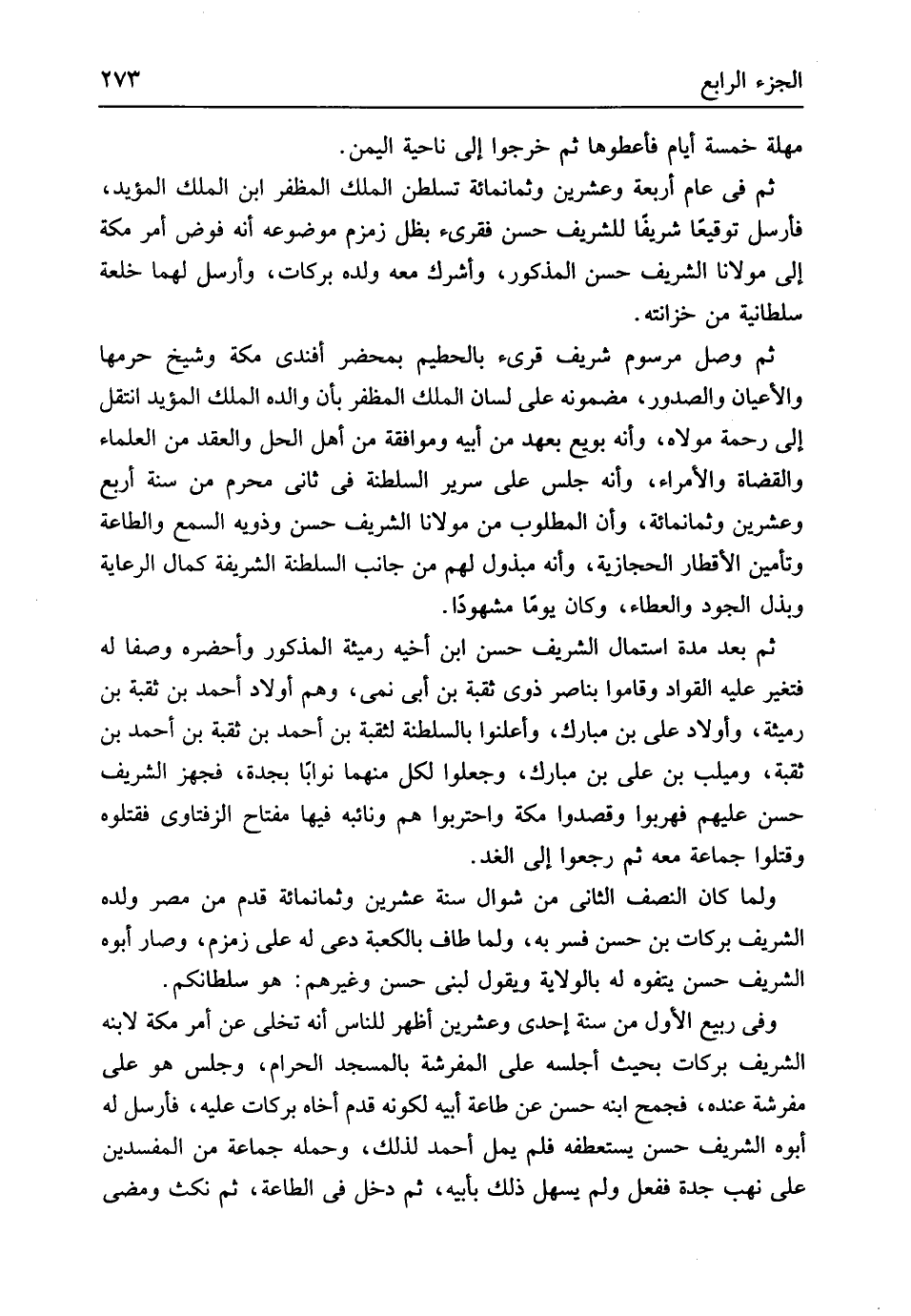 مهلة خَمْسَة أَيَّام فأعطوها ثمَّ خَرجُوا إِلَى نَاحيَة الْيمن ثمَّ فِي عَام أَرْبَعَة وَعشْرين وَثَمَانمِائَة تسلطن الْملك المظفر ابْن الْملك الْمُؤَيد فَأرْسل توقيعاً شريفاً للشريف حسن فقرئ بِظِل زَمْزَم مَوْضُوعه أَنه فوض أَمر مَكَّة إِلَى مَوْلَانَا الشريف حسن الْمَذْكُور وأشرك مَعَه وَلَده بَرَكَات وَأرْسل لَهما خلعة سلطانية من خزانته ثمَّ وصل مرسوم شرِيف قرئَ بِالْحَطِيمِ بِمحضر أَفَنْدِي مَكَّة وَشَيخ حرمهَا والأعيان والصدور مضمونه على لِسَان الْملك المظفر بِأَن وَالِده الْملك الْمُؤَيد انْتقل إِلَى رَحْمَة مَوْلَاهُ وَأَنه بُويِعَ بِعَهْد من أَبِيه وموافقة من أهل الْحل وَالْعقد من الْعلمَاء والقضاة والأمراء وَأَنه جلس على سَرِير السلطنة فِي ثَانِي محرم من سنة أَربع وَعشْرين وَثَمَانمِائَة وَأَن الْمَطْلُوب من مَوْلَانَا الشريف حسن وَذَوِيهِ السّمع وَالطَّاعَة وتأمين الأقطار الحجازية وَأَنه مبذول لَهُم من جَانب السلطنة الشَّرِيفَة كَمَال الرِّعَايَة وبذل الْجُود وَالعطَاء وَكَانَ يَوْمًا مشهوداً ثمَّ بعد مُدَّة استمال الشريف حسن ابْن أَخِيه رميثة الْمَذْكُور وأحضره وَصفا لَهُ فَتغير عَلَيْهِ القواد وَقَامُوا بناصر ذَوي ثقبة بن أبي نمي وهم أَوْلَاد أَحْمد بن ثقبة بن رميثة وَأَوْلَاد عَليّ بن مبارك وأعلنوا بالسلطنة لثقبة بن أَحْمد بن ثقبة بن أَحْمد بن ثقبة وميلب بن عَليّ بن مبارك وَجعلُوا لكل مِنْهُمَا نواباً بجدة فَجهز الشريف حسن عَلَيْهِم فَهَرَبُوا وقصدوا مَكَّة واحتربوا هم ونائبه فِيهَا مِفْتَاح الزفتاوي فَقَتَلُوهُ وَقتلُوا جمَاعَة مَعَه ثمَّ رجعُوا إِلَى الْغَد وَلما كَانَ النّصْف الثَّانِي من شَوَّال سنة عشْرين وَثَمَانمِائَة قدم من مصر وَلَده الشريف بَرَكَات بن حسن فسر بِهِ وَلما طَاف بِالْكَعْبَةِ دعى لَهُ على زَمْزَم وَصَارَ أَبوهُ الشريف حسن يتفوه لَهُ بِالْولَايَةِ وَيَقُول لبني حسن وَغَيرهم هُوَ سلطانكم وَفِي ربيع الأول من سنة إِحْدَى وَعشْرين أظهر للنَّاس أَنه تخلى عَن أَمر مَكَّة لِابْنِهِ الشريف بَرَكَات بِحَيْثُ أجلسه على المفرشة بِالْمَسْجِدِ الْحَرَام وَجلسَ هُوَ على مفرشة عِنْده فَجمع ابْنه حسن عَن طَاعَة أَبِيه لكَونه قدم أَخَاهُ بَرَكَات عَلَيْهِ فَأرْسل لَهُ أَبوهُ الشريف حسن يستعطفه فَلم يمل أَحْمد لذَلِك وَحمله جمَاعَة من المفسدين على نهب جدة فَفعل وَلم يسهل ذَلِك بِأَبِيهِ ثمَّ دخل فِي الطَّاعَة ثمَّ نكث وَمضى