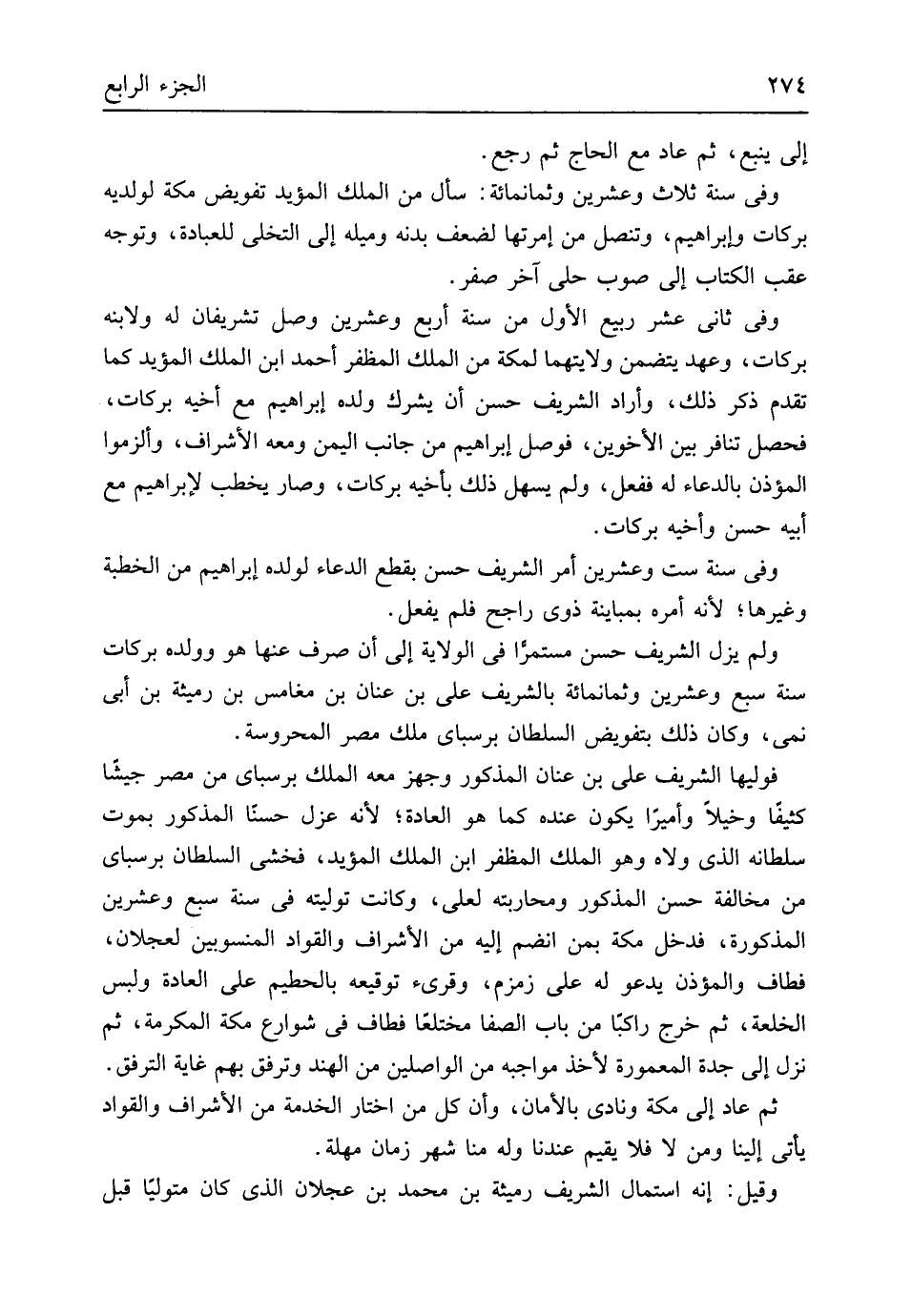 إِلَى يببع ثمَّ عَاد مَعَ الْحَاج ثمَّ رَجَعَ وَفِي سنة ثَلَاث وَعشْرين وَثَمَانمِائَة سَأَلَ من الْملك الْمُؤَيد تَفْوِيض مَكَّة لِوَلَدَيْهِ بَرَكَات وَإِبْرَاهِيم وتنصل من إمرتها لضعف بدنه وميله إِلَى التخلي لِلْعِبَادَةِ وَتوجه عقب الْكتاب إِلَى صوب حلى آخر صفر وَفِي ثَانِي عشر ربيع الأول من سنة أَربع وَعشْرين وصل تشريفان لَهُ ولابنه بَرَكَات وعهد يتَضَمَّن ولايتهما لمَكَّة من الْملك المظفر أَحْمد ابْن الْملك الْمُؤَيد كَمَا تقدم ذكر ذَلِك وَأَرَادَ الشريف حسن أَن يُشْرك وَلَده إِبْرَاهِيم مَعَ أَخِيه بَرَكَات فَحصل تنافر بَين الْأَخَوَيْنِ فوصل إِبْرَاهِيم من جَانب الْيمن وَمَعَهُ الْأَشْرَاف وألزموا الْمُؤَذّن بِالدُّعَاءِ لَهُ فَفعل وَلم يسهل ذَلِك بأَخيه بَرَكَات وَصَارَ يخْطب لإِبْرَاهِيم مَعَ أَبِيه حسن وأخيه بَرَكَات وَفِي سنة سِتّ وَعشْرين أَمر الشريف حسن بِقطع الدُّعَاء لوَلَده إِبْرَاهِيم من الْخطْبَة وَغَيرهَا لِأَنَّهُ أمره بمباينة ذَوي رَاجِح فَلم يفعل وَلم يزل الشريف حسن مستمراً فِي الْولَايَة إِلَى أَن صرف عَنْهَا هُوَ وَولده بَرَكَات سنة سبع وَعشْرين وَثَمَانمِائَة بالشريف عَليّ بن عنان بن مغامس بن رميثة بن أبي نمي وَكَانَ ذَلِك بتفويض السُّلْطَان برسباي ملك مصر المحروسة فوليها الشريف عَليّ بن عنان الْمَذْكُور وجهز مَعَه الْملك برسباي من مصر جَيْشًا كثيفاً وخيلاً وأميراً يكون عِنْده كَمَا هُوَ الْعَادة لِأَنَّهُ عزل حسنا الْمَذْكُور بِمَوْت سُلْطَانه الَّذِي ولاه وَهُوَ الْملك المظفر ابْن الْملك الْمُؤَيد فخشي السُّلْطَان برسباي من مُخَالفَة حسن الْمَذْكُور ومحاربته لعَلي وَكَانَت تَوليته فِي سنة سبع وَعشْرين الْمَذْكُورَة فَدخل مَكَّة بِمن انْضَمَّ إِلَيْهِ من الْأَشْرَاف والقواد المنسوبين لعجلان فَطَافَ والمؤذن يَدْعُو لَهُ على زَمْزَم وَقُرِئَ توقيعه بِالْحَطِيمِ على الْعَادة وَلبس الخلعة ثمَّ خرج رَاكِبًا من بَاب الصَّفَا مختلعاً فَطَافَ فِي شوارع مَكَّة المكرمة ثمَّ نزل إِلَى جدة المعمورة لأخذ مواجبه من الواصلين من الْهِنْد وترفق بهم غَايَة الترفق ثمَّ عَاد إِلَى مَكَّة ونادى بالأمان وَأَن كل من اخْتَار الْخدمَة من الْأَشْرَاف والقواد يَأْتِي إِلَيْنَا وَمن لَا فَلَا يُقيم عندنَا وَله منا شهر زمَان مهلة وَقيل إِنَّه استمال الشريف رميثة بن مُحَمَّد بن عجلَان الَّذِي كَانَ مُتَوَلِّيًا قبل