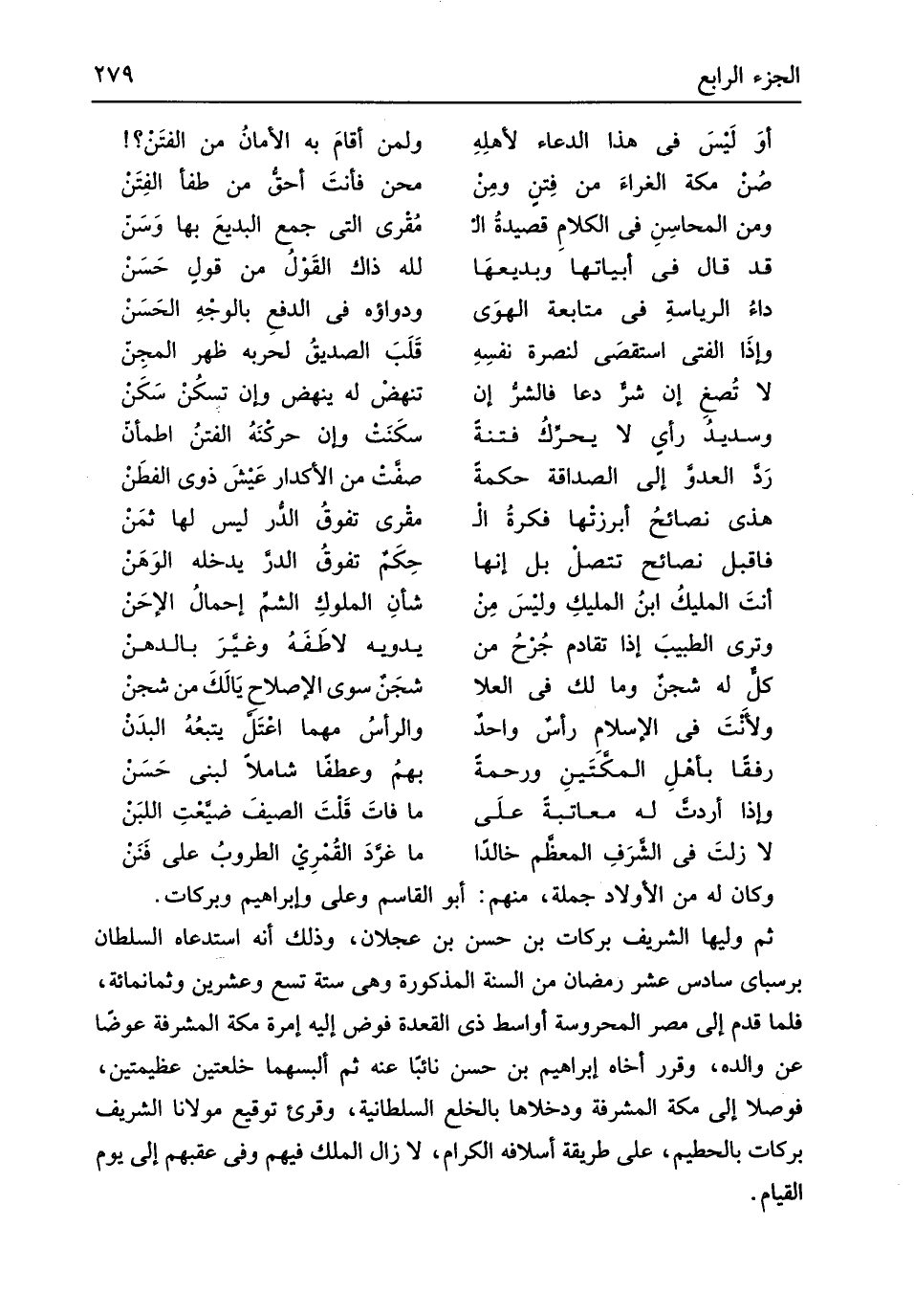 وَكَانَ لَهُ من الْأَوْلَاد جملَة مِنْهُم أَبُو الْقَاسِم وَعلي وَإِبْرَاهِيم وبركات ثمَّ وَليهَا الشريف بَرَكَات بن حسن بن عجلَان وَذَلِكَ أَنه استدعاه السُّلْطَان برسباي سادس عشر رَمَضَان من السّنة الْمَذْكُورَة وَهِي سِتَّة تسع وَعشْرين وَثَمَانمِائَة فَلَمَّا قدم إِلَى مصر المحروسة أواسط ذِي الْقعدَة فوض إِلَيْهِ إمرة مَكَّة المشرفة عوضا عَن وَالِده وَقرر أَخَاهُ إِبْرَاهِيم بن حسن نَائِبا عَنهُ ثمَّ ألبسهما خلعتين عظيمتين فوصلا إِلَى مَكَّة المشرفة ودخلها بِالْخلْعِ السُّلْطَانِيَّة وَقُرِئَ توقيع مولأنا الشريف بَرَكَات بِالْحَطِيمِ على طَريقَة أسلافه الْكِرَام لَا زَالَ الْملك فيهم وَفِي عقبهم إِلَى يَوْم الْقيام