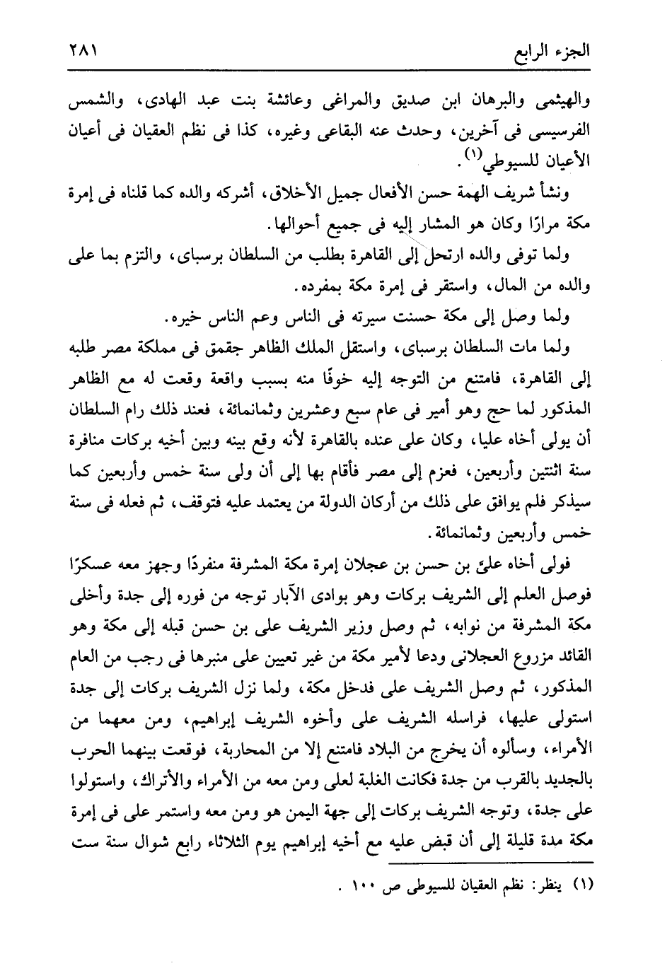 والهيثمي والبرهان ابْن صديق والمراغي وَعَائِشَة بنت عبد الْهَادِي وَالشَّمْس الفرسيسي فِي آخَرين وَحدث عَنهُ البقاعي وَغَيره كَذَا فِي نظم العقيان فِي أَعْيَان الْأَعْيَان للسيوطي وَنَشَأ شرِيف الهمة حسن الْأَفْعَال جميل الْأَخْلَاق أشركه وَالِده كَمَا قُلْنَاهُ فِي إمرة مَكَّة مرَارًا وَكَانَ هُوَ الْمشَار إِلَيْهِ فِي جَمِيع أحوالها وَلما توفّي وَالِده ارتحل إِلَى الْقَاهِرَة بِطَلَب من السُّلْطَان برسباي وَالْتزم بِمَا على وَالِده من المَال وَاسْتقر فِي إمرة مَكَّة بمفرده وَلما وصل إِلَى مَكَّة حسنت سيرته فِي النَّاس وَعم النَّاس خَيره وَلما مَاتَ السُّلْطَان برسباي واستقل الْملك الظَّاهِر جقمق فِي مملكة مصر طلبه إِلَى الْقَاهِرَة فَامْتنعَ من التَّوَجُّه إِلَيْهِ خوفًا مِنْهُ بِسَبَب وَاقعَة وَقعت لَهُ مَعَ الظَّاهِر الْمَذْكُور لما حج وَهُوَ أَمِير فِي عَام سبع وَعشْرين وَثَمَانمِائَة فَعِنْدَ ذَلِك رام السُّلْطَان أَن يولي أَخَاهُ عليا وَكَانَ عَليّ عِنْده بِالْقَاهِرَةِ لِأَنَّهُ وَقع بَينه وَبَين أَخِيه بَرَكَات منافرة سنة اثْنَتَيْنِ وَأَرْبَعين فعزم إِلَى مصر فَأَقَامَ بهَا إِلَى أَن ولي سنة خمس وَأَرْبَعين كَمَا سَيذكرُ فَلم يُوَافق على ذَلِك من أَرْكَان الدولة من يعْتَمد عَلَيْهِ فتوقف ثمَّ فعله فِي سنة خمس وَأَرْبَعين وَثَمَانمِائَة فولى أَخَاهُ عَليّ بن حسن بن عجلَان إمرة مَكَّة المشرفة مُنْفَردا وجهز مَعَه عسكراً فوصل الْعلم إِلَى الشريف بَرَكَات وَهُوَ بوادي الْآبَار توجه من فوره إِلَى جدة وأخلى مَكَّة المشرفة من نوابه ثمَّ وصل وَزِير الشريف عَليّ بن حسن قبله إِلَى مَكَّة وَهُوَ الْقَائِد مزروع الْعجْلَاني ودعا لأمير مَكَّة من غير تعْيين على منبرها فِي رَجَب من الْعَام الْمَذْكُور ثمَّ وصل الشريف عَليّ فَدخل مَكَّة وَلما نزل الشريف بَرَكَات إِلَى جدة استولى عَلَيْهَا فراسله الشريف عَليّ وَأَخُوهُ الشريف إِبْرَاهِيم وَمن مَعَهُمَا من الْأُمَرَاء وسألوه أَن يخرج من الْبِلَاد فَامْتنعَ أَلا من الْمُحَاربَة فَوَقَعت بَينهمَا الْحَرْب بالجديد بِالْقربِ من جدة فَكَانَت الْغَلَبَة لعَلي وَمن مَعَه من الْأُمَرَاء والأتراك واستولوا على جدة وَتوجه الشريف بَرَكَات إِلَى جِهَة الْيمن هُوَ وَمن مَعَه وَاسْتمرّ عَليّ فِي إمرة مَكَّة مُدَّة قَليلَة إِلَى أَن قبض عَلَيْهِ مَعَ أَخِيه إِبْرَاهِيم يَوْم الثُّلَاثَاء رَابِع شَوَّال سنة سِتّ