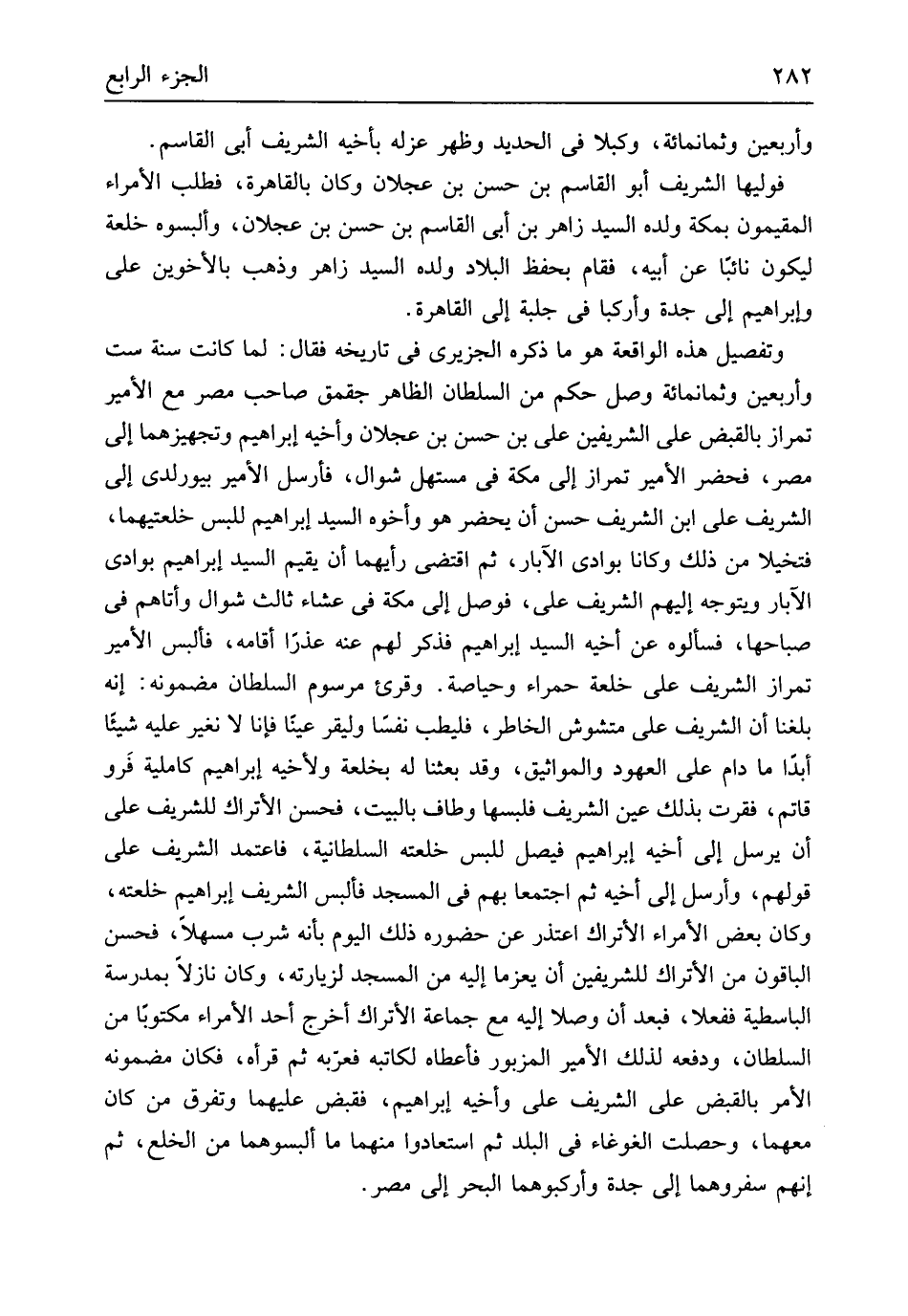 وَأَرْبَعين وَثَمَانمِائَة وكبلا فِي الْحَدِيد وَظهر عَزله بأَخيه الشريف أبي الْقَاسِم فوليها الشريف أَبُو الْقَاسِم بن حسن بن عجلَان وَكَانَ بِالْقَاهِرَةِ فَطلب الْأُمَرَاء المقيمون بِمَكَّة وَلَده السَّيِّد زَاهِر بن أبي الْقَاسِم بن حسن بن عجلَان وألبسوه خلعة ليَكُون نَائِبا عَن أَبِيه فَقَامَ بِحِفْظ الْبِلَاد وَلَده السَّيِّد زَاهِر وَذهب بالأخوين عَليّ وَإِبْرَاهِيم إِلَى جدة وأركبا فِي جلبة إِلَى الْقَاهِرَة وتفصيل هَذِه الْوَاقِعَة هُوَ مَا ذكره الجزيري فِي تَارِيخه فَقَالَ لما كَانَت سنة سِتّ وَأَرْبَعين وَثَمَانمِائَة وصل حكم من السُّلْطَان الظَّاهِر جقمق صَاحب مصر مَعَ الْأَمِير تمراز بِالْقَبْضِ على الشريفين عَليّ بن حسن بن عجلَان وأخيه إِبْرَاهِيم وتجهيزهما إِلَى مصر فَحَضَرَ الْأَمِير تمراز إِلَى مَكَّة فِي مستهل شَوَّال فَأرْسل الْأَمِير بيورلدي إِلَى الشريف عَليّ ابْن الشريف حسن أَن يحضر هُوَ وَأَخُوهُ السَّيِّد إِبْرَاهِيم للبس خلعتيهما فتخيلا من ذَلِك وَكَانَا بوادي الْآبَار ثمَّ اقْتضى رأيهما أَن يُقيم السَّيِّد إِبْرَاهِيم بوادى الْآبَار وَيتَوَجَّهُ إِلَيْهِم الشريف عَليّ فوصل إِلَى مَكَّة فِي عشَاء ثَالِث شَوَّال وأتاهم فِي صباحها فَسَأَلُوهُ عَن أَخِيه السَّيِّد إِبْرَاهِيم فَذكر لَهُم عَنهُ عذرا أَقَامَهُ فألبس الْأَمِير تمراز الشريف عَليّ خلعة حَمْرَاء وحياصة وَقُرِئَ مرسوم السُّلْطَان مضمونه إِنَّه بلغنَا أَن الشريف عَليّ متشوش الخاطر فليطب نفسا وليقر عينا فَإنَّا لَا نغير عَلَيْهِ شَيْئا أبدا مَا دَامَ على العهو والمواثيق وَقد بعثنَا لَهُ بخلعة ولأخيه إِبْرَاهِيم كاملية فَرو قاتم فقرت بذلك عين الشريف فلبسها وَطَاف بِالْبَيْتِ فَحسن الأتراك للشريف عَليّ أَن يُرْسل إِلَى أَخِيه إِبْرَاهِيم فيصل للبس خلعته السُّلْطَانِيَّة فاعتمد الشريف عَليّ قَوْلهم وَأرْسل إِلَى أَخِيه ثمَّ اجْتمعَا بهم فِي الْمَسْجِد فألبس الشريف إِبْرَاهِيم خلعته وَكَانَ بعض الْأُمَرَاء الأتراك اعتذر عَن حُضُوره ذَلِك الْيَوْم بِأَنَّهُ شرب مسهلاً فَحسن الْبَاقُونَ من الأتراك للشريفين أَن يعزما إِلَيْهِ من الْمَسْجِد لزيارته وَكَانَ نازلاً بمدرسة الباسطية ففعلا فَبعد أَن وصلا إِلَيْهِ مَعَ جمَاعَة الأتراك أخرج أحد الْأُمَرَاء مَكْتُوبًا من السُّلْطَان وَدفعه لذَلِك الْأَمِير الْمَزْبُور فَأعْطَاهُ لكَاتبه فعّربه ثمَّ قَرَأَهُ فَكَانَ مضمونه الْأَمر بِالْقَبْضِ على الشريف عَليّ وأخيه إِبْرَاهِيم فَقبض عَلَيْهِمَا وتفرق من كَانَ مَعَهُمَا وحصلت الغوغاء فى الْبَلَد ثمَّ استعادوا مِنْهَا مَا ألبسوهما من الْخلْع ثمَّ إِنَّهُم سفروهما إِلَى جدة وأركبوهما الْبَحْر إِلَى مصر
