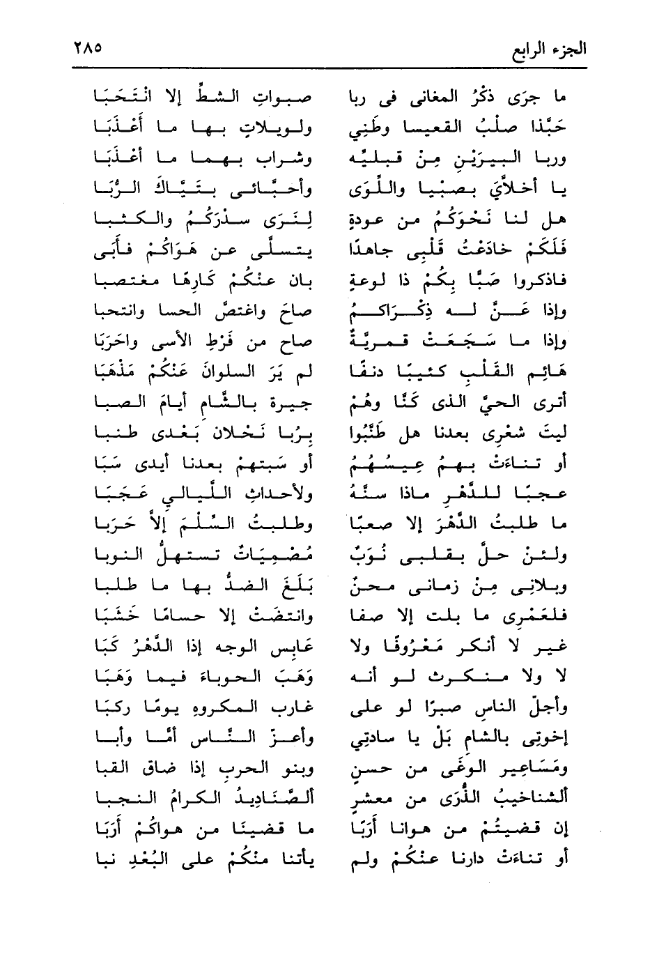 (مَا جرَى ذكْرُ المغإني فِي رَبًّا ... صبواتِ الشطِّ أَلا انْتَحَبَا)