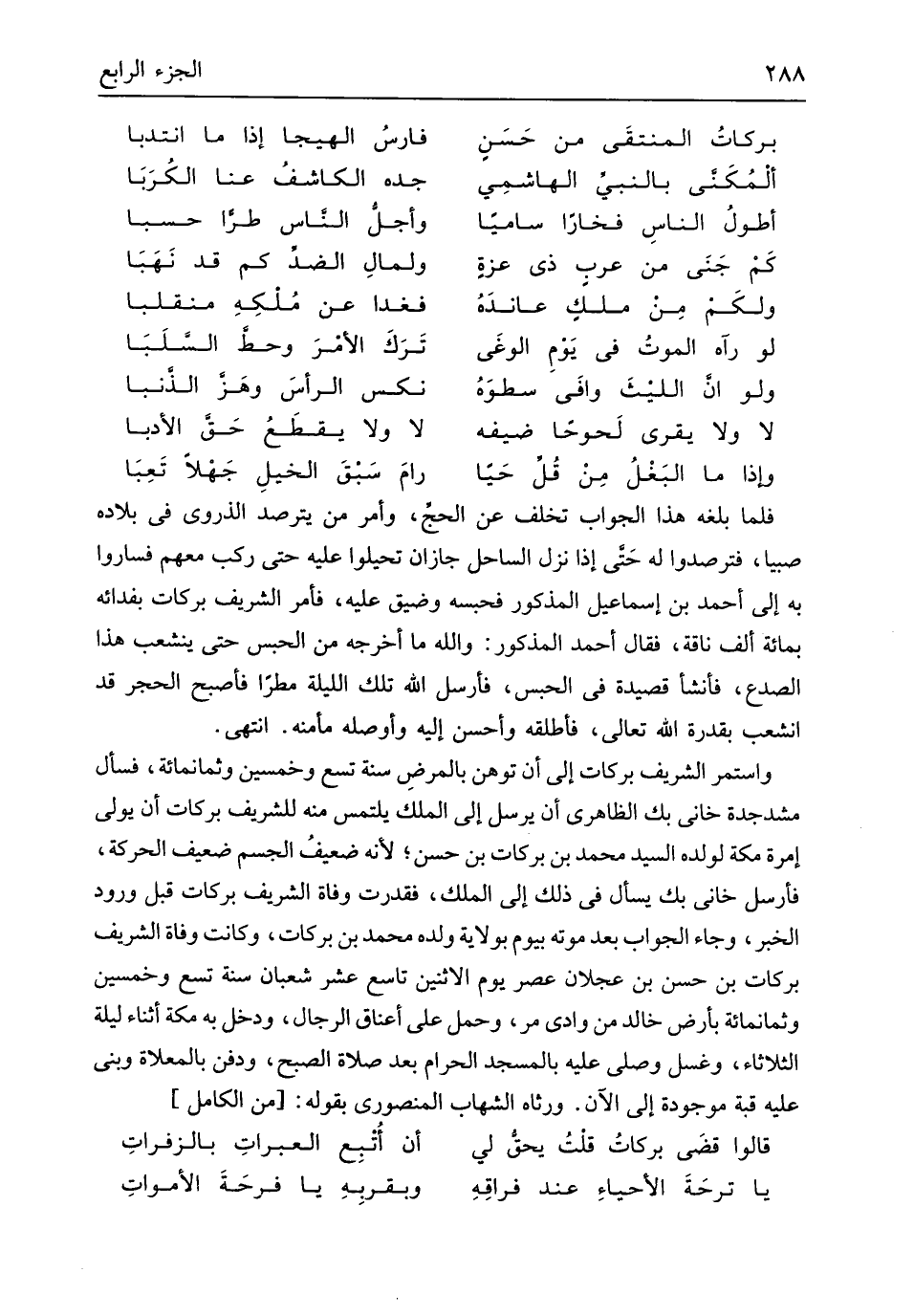 فَلَمَّا بلغه هَذَا الْجَواب تخلف عَن الْحَج وَأمر من يترصد الذروى فِي بِلَاده صَبيا فترصدوا لَهُ حَتَّى إِذا نزل السَّاحِل جازان تحيلوا عَلَيْهِ حَتَّى ركب مَعَهم فَسَارُوا بِهِ إِلَى أَحْمد بن إِسْمَاعِيل الْمَذْكُور فحسبه وضيق عَلَيْهِ فَأمر الشريف بَرَكَات بفدائه بِمِائَة ألف نَاقَة فَقَالَ أَحْمد الْمَذْكُور وَالله مَا أخرجه من الْحَبْس حَتَّى ينشعب هَذَا الصدع فَأَنْشَأَ قصيدة فِي الْحَبْس فَأرْسل الله تِلْكَ اللَّيْلَة مَطَرا فَأصْبح الْحجر قد انشعب بقدرة الله تَعَالَى فَأَطْلقهُ وَأحسن إِلَيْهِ وأوصله مأمنه انْتهى وَاسْتمرّ الشريف بَرَكَات إِلَى أَن توهن بالمرضِ سنة تسع وَخمسين وَثَمَانمِائَة فَسَأَلَ مشدجدة خاني بك الظَّاهِرِيّ أَن يُرْسل إِلَى الْملك يلْتَمس مِنْهُ للشريف بَرَكَات أَن يولي إمرة مَكَّة لوَلَده السَّيِّد مُحَمَّد بن بَرَكَات بن حسن لِأَنَّهُ ضعيفُ الْجِسْم ضَعِيف الْحَرَكَة فَأرْسل خاني بك يسْأَل فِي ذَلِك إِلَى الْملك فقدرت وَفَاة الشريف بَرَكَات قبل وُرُود الْخَبَر وَجَاء الْجَواب بعد مَوته بِيَوْم بِولَايَة وَلَده مُحَمَّد بن بَرَكَات وَكَانَت وَفَاة الشريف بَرَكَات بن حسن بن عجلَان عصر يَوْم الِاثْنَيْنِ تَاسِع عشر شعْبَان سنة تسع وَخمسين وَثَمَانمِائَة بِأَرْض خَالِد من وَادي مر وَحمل على أَعْنَاق الرِّجَال وَدخل بِهِ مَكَّة أثْنَاء لَيْلَة الثُّلَاثَاء وَغسل وَصلي عَلَيْهِ بِالْمَسْجِدِ الْحَرَام بعد صَلَاة الصُّبْح وَدفن بالمعلاة وَبني عَلَيْهِ قبَّة مَوْجُودَة إِلَى الْآن ورثاه الشهَاب المنصوري بقوله // (من الْكَامِل) //