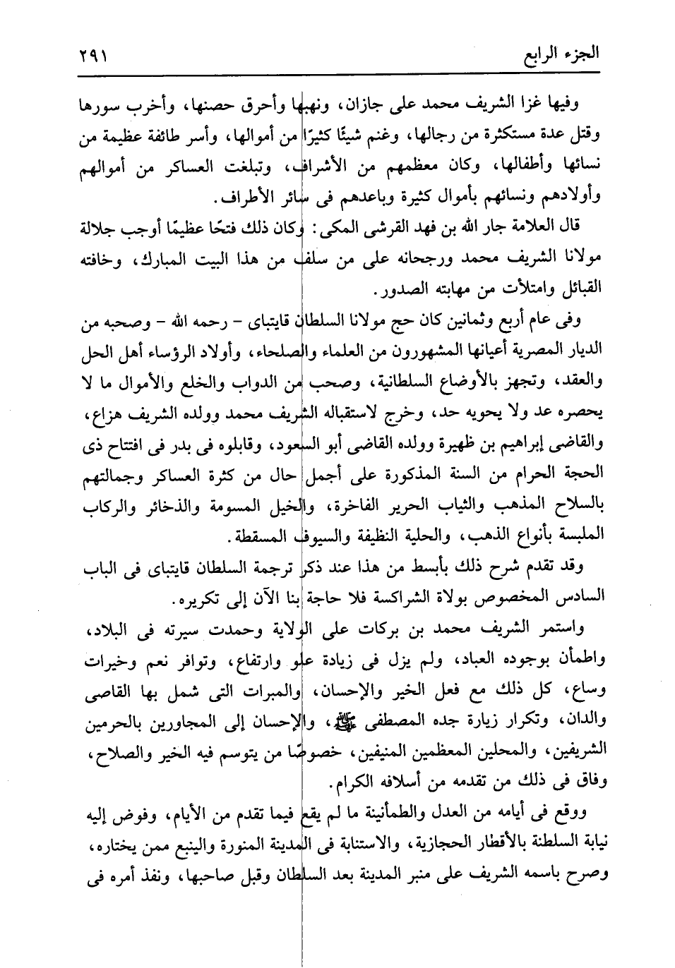 وفيهَا غزا الشريف مُحَمَّد على جازان ونهبها وأحرق حصنها وأخرب سورها وَقتل عدَّة مستكثرة من رجالها وغنم شَيْئا كثيرا من أموالها وأٍ سر طَائِفَة عَظِيمَة من نسائها وأطفالها وَكَانَ معظمهم من الْأَشْرَاف وتبلغت العساكر من أَمْوَالهم وَأَوْلَادهمْ وَنِسَائِهِمْ بأموال كَثِيرَة وباعدهم فِي سَائِر الْأَطْرَاف قَالَ الْعَلامَة جَار الله بن فَهد الْقرشِي الْمَكِّيّ وَكَانَ ذَلِك فتحا عَظِيما أوجب جلالة مَوْلَانَا الشريف مُحَمَّد ورجحانه على من سلف من هَذَا الْبَيْت الْمُبَارك وخافته الْقَبَائِل وامتلأت من مهابته الصُّدُور وَفِي عَام أَربع وَثَمَانِينَ كَانَ حج مَوْلَانَا السُّلْطَان قايتباي رَحمَه الله وَصَحبه من الديار المصرية أعيانها المشهورون من الْعلمَاء والصلحاء وَأَوْلَاد الرؤساء أهل الْحل وَالْعقد وتجهز بالأوضاع السُّلْطَانِيَّة وَصَحب من الدَّوَابّ وَالْخلْع وَالْأَمْوَال مَا لَا يحصره عد وَلَا يحويه حد وَخرج لاستقباله الشريف مُحَمَّد وَولده الشريف هزاع وَالْقَاضِي إِبْرَاهِيم بن ظهيرة وَولده القَاضِي أَبُو السُّعُود وقابلوه فِي بدر فِي افْتِتَاح ذِي الْحجَّة الْحَرَام من السّنة الْمَذْكُورَة على أجمل حَال من كَثْرَة العساكر وجمالتهم بِالسِّلَاحِ الْمَذْهَب وَالثيَاب الْحَرِير الفاخرة وَالْخَيْل المسومة والذخائر والركاب الملبسة بأنواع الذَّهَب والحلية النظيفة وَالسُّيُوف المسقطة وَقد تقدم شرح ذَلِك بأبسط من هَذَا عِنْد ذكر تَرْجَمَة السُّلْطَان قايتباي فِي الْبَاب السَّادِس الْمَخْصُوص بولاة الشراكسة فَلَا حَاجَة بِنَا الْآن إِلَى تكريره وَاسْتمرّ الشريف مُحَمَّد بن بَرَكَات على الْولَايَة وحمدت سيرته فِي الْبِلَاد وَاطْمَأَنَّ بِوُجُودِهِ الْعباد وَلم يزل فِي زِيَادَة علو وارتفاع وتوافر نعم وخيرات وساع كل ذَلِك مَعَ فعل الْخَيْر وَالْإِحْسَان والمبرات الَّتِى شَمل بهَا القاضى والدان وتكرار زِيَارَة جده الْمُصْطَفى