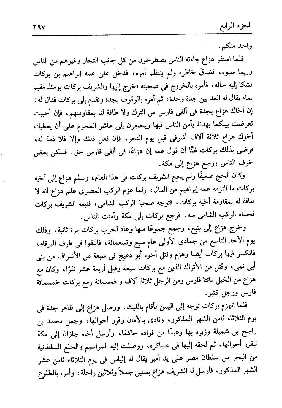 وَاحِد مِنْكُم فَلَمَّا اسْتَقر هزاع جَاءَتْهُ النَّاس يصطرخون من كل جَانب التُّجَّار وَغَيرهم من النَّاس وَرُبمَا سبوه فَضَاقَ خاطره وَلم يَنْتَظِم أمره فَدخل على عَمه إِبْرَاهِيم بن بَرَكَات فَشَكا إِلَيْهِ حَاله فَأمره بِالْخرُوجِ فِي صحبته فَخرج إِلَيْهَا والشريف بَرَكَات يَوْمئِذٍ مُقيم بِمَاء يُقَال لَهُ الْعد بَين جدة وحدة ثمَّ أمره بِالْوُقُوفِ بجدة وَتقدم إِلَى بَرَكَات فَقَالَ لَهُ إِن أَخَاك هزاع بجدة فِي ألفي فَارس من التّرْك وَلَا طَاقَة لنا بمقاومتهم فَإِن أَحْبَبْت تعرضت بَيْنكُمَا بهدنة يَأْمَن النَّاس فِيهَا ويحجون إِلَى عَاشر الْمحرم على أَن يعطيك أَخُوك هزاع ثَلَاثَة آلَاف أشرفي قبل يَوْم النَّحْر فَإِن فعل ذَلِك وَإِلَّا فَلَا ذمَّة لَهُ فَرضِي بذلك بَرَكَات ظنا أَن قَول عَمه إِن هزاعاً فِي ألفي فَارس حق فسكن بعض خوف النَّاس وَرجع هزاع إِلَى مَكَّة وَكَانَ الْحَج ضَعِيفا وَلم يحجّ الشريف بَرَكَات فِي هَذَا الْعَام وَسلم هزاع إِلَى أَخِيه بَرَكَات مَا الْتَزمهُ عَمه إِبْرَاهِيم من المَال وَلما عزم الركب الْمصْرِيّ علم هزاع أَنه لَا طَاقَة لَهُ بمقاومة أَخِيه بَرَكَات فَتوجه صُحْبَة الركب الشَّامي فَتَبِعَهُ الشريف بَرَكَات فحماه الركب الشَّامي مِنْهُ فَرجع بَرَكَات إِلَى مَكَّة وَأمنت النَّاس وَخرج هزاع إِلَى يَنْبع وَجمع جموعاً مِنْهَا وَعَاد لِحَرْب بَرَكَات مرّة ثَانِيَة وَذَلِكَ يَوْم الْأَحَد التَّاسِع من جُمَادَى الأولى عَام سبع وَتِسْعمِائَة فَالْتَقوا فِي طرف البرقاء فانكسر فِيهَا بَرَكَات أَيْضا وَهزمَ وَقتل أَخُوهُ أَبُو دعيج فِي سَبْعَة من الْأَشْرَاف من بني أبي نمي وَقتل من الأتراك الَّذين مَعَ بَرَكَات سَبْعَة وَقيل أَرْبَعَة عشر نَفرا وَكَانَ مَعَ هزاع من الْخَيل مِائَتَا فَارس وَمن الرجل ثَلَاثَة آلَاف وَخَمْسمِائة وَمَعَ بَرَكَات خَمْسمِائَة فَارس وَرجل كثير فَلَمَّا انهزم بَرَكَات توجه إِلَى الْيمن فَأَقَامَ بالليث وَوصل هزاع إِلَى ظَاهر جدة فِي يَوْم الثُّلَاثَاء ثامن الشَّهْر الْمَذْكُور ونادى بالأمان وَقرر أحوالها وَجعل مُحَمَّد بن رَاجِح بن شميلة وزيره بهَا وعبداً من قواده حَاكما وَأرْسل أَخَاهُ جازان إِلَى مَكَّة ليقرر أحوالها ثمَّ لحقه إِلَيْهَا فِي عساكره ووصلت إِلَيْهِ المراسيم وَالْخلْع السُّلْطَانِيَّة من الْبَحْر من سُلْطَان مصر على يَد أَمِير يُقَال لَهُ إلْيَاس فِي يَوْم الثُّلَاثَاء ثامن عشر الشَّهْر الْمَذْكُور فَأرْسل لَهُ الشريف هزاع بستين جملا وَثَلَاثِينَ رَاحِلَة وَأمره بالطلوع