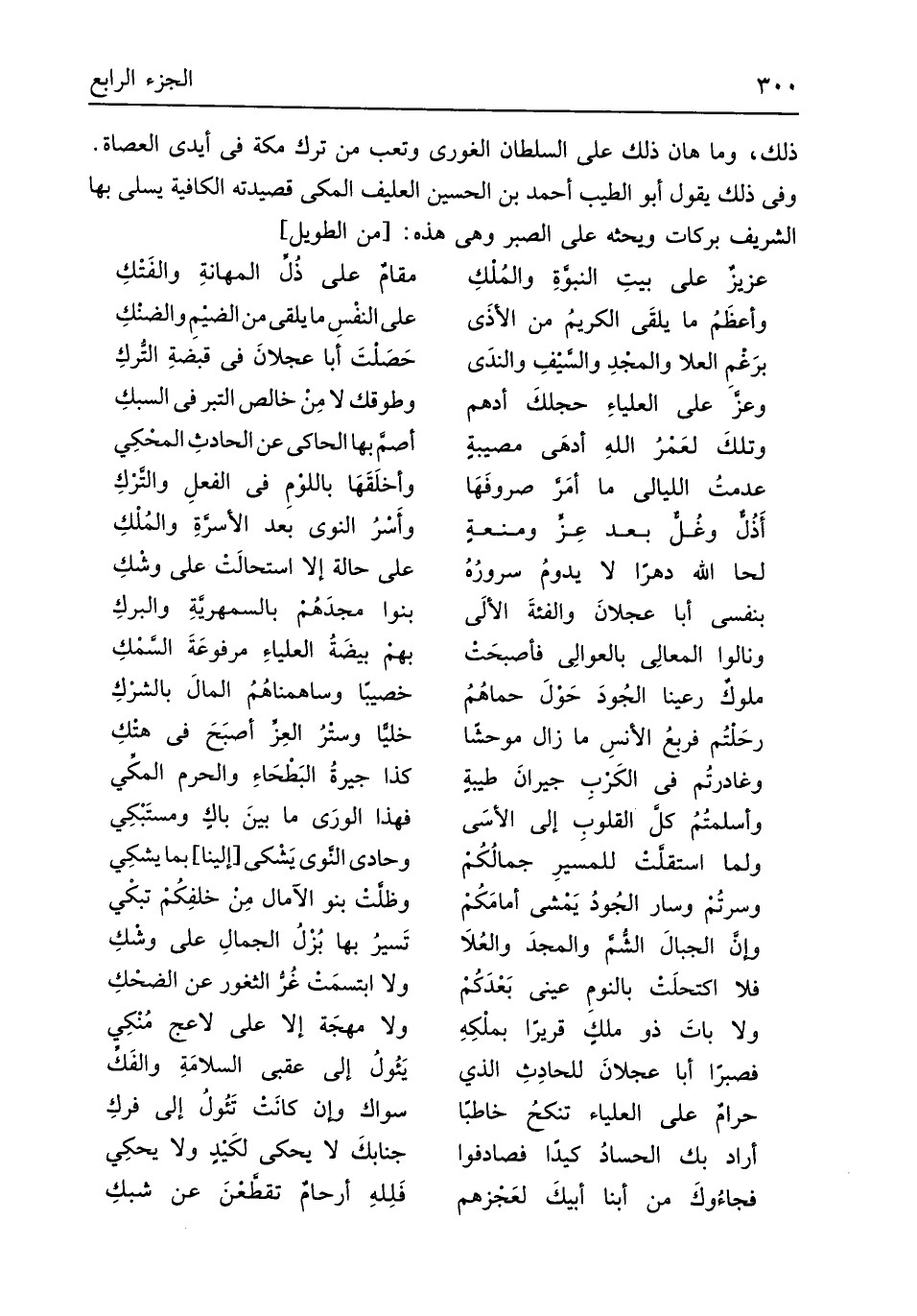 ذَلِك وَمَا هان ذَلِك على السُّلْطَان الغوري وتعب من ترك مكهَ فِي أَيدي العصاة وَفِي ذَلِك يَقُول أَبُو الطّيب أَحْمد بن الْحُسَيْن العليف الْمَكِّيّ قصيدته الكافية يسلي بهَا الشريف بَرَكَات ويحثه على الصَّبْر وَهِي هَذِه // (من الطَّوِيل) //
