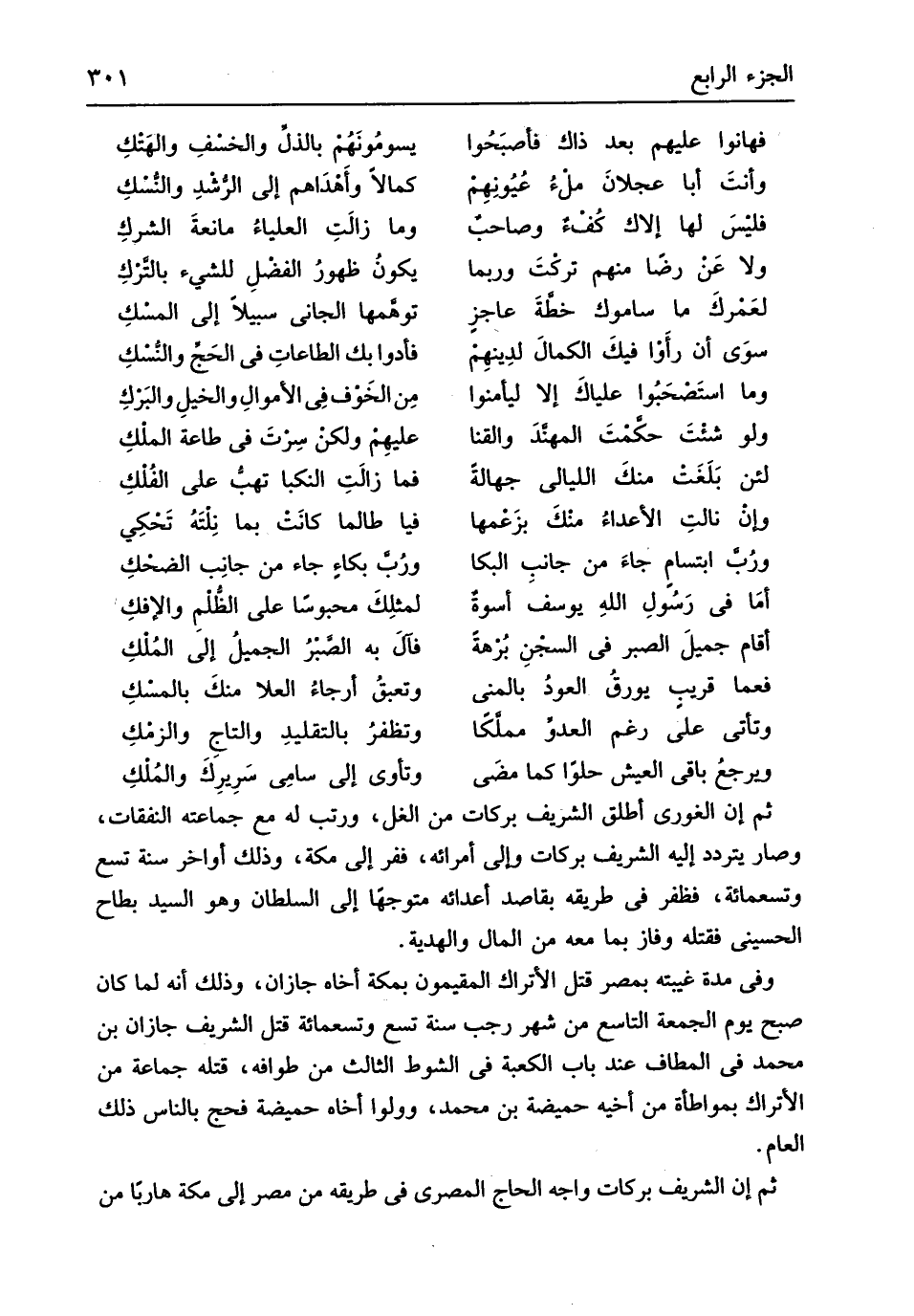 ثمَّ إِن الغوري أطلق الشريف بَرَكَات من الغل ورتب لَهُ مَعَ جماعته النَّفَقَات وَصَارَ يتَرَدَّد إِلَيْهِ الشريف بَرَكَات وَإِلَى أمرائه ففر إِلَى مَكَّة وَذَلِكَ أَوَاخِر سنة تسع وَتِسْعمِائَة فظفر فِي طَرِيقه بقاصد أعدائه مُتَوَجها إِلَى السُّلْطَان وَهُوَ السَّيِّد بطاح الْحُسَيْنِي فَقتله وفاز بِمَا مَعَه من المَال والهدية وَفِي مُدَّة غيِبته بِمصْر قتل الأتراك المقيمون بِمَكَّة أَخَاهُ جازان وَذَلِكَ أَنه لما كَانَ صبح يَوْم الْجُمُعَة التَّاسِع من شهر رَجَب سنة تسع وَتِسْعمِائَة قتل الشريف جازان بن مُحَمَّد فِي المطاف عِنْد بَاب الْكَعْبَة فِي الشوط الثَّالِث من طَوَافه قَتله جمَاعَة من الأتراك بمواطأة من أَخِيه حميضة بن مُحَمَّد وولوا أَخَاهُ حميضة فحج بِالنَّاسِ ذَلِك الْعَام ثمَّ إِن الشريف بَرَكَات واجه الْحَاج الْمصْرِيّ فِي طَرِيقه من مصر إِلَى مَكَّة هَارِبا من
