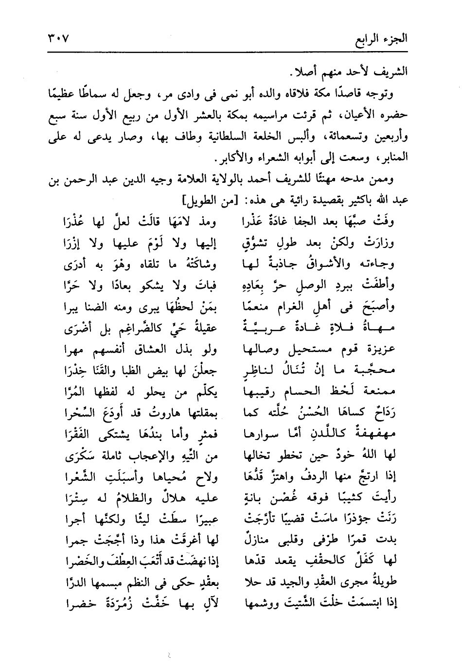 الشريف لأحد مِنْهُم أصلا وَتوجه قَاصِدا مَكَّة فلاقاه وَالِده أَبُو نمي فِي وَادي مر وَجعل لَهُ سماطاً عَظِيما حَضَره الْأَعْيَان ثمَّ قُرِئت مراسيمه بِمَكَّة بالعشر الأول من ربيع الأول سنة سبع وَأَرْبَعين وَتِسْعمِائَة وألبس الخلعة السلطانة وَطَاف بهَا وَصَارَ يَدعِي لَهُ على المنابر وسعت إِلَى أبوابه الشُّعَرَاء والأكابر وَمِمَّنْ مدحه مهنئاً للشريف أَحْمد بِالْولَايَةِ الْعَلامَة وجيه الدّين عبد الرَّحْمَن بن عبد الله باكثير بقصيدة راتية هِيَ هَذِه // (من الطَّوِيل) //
