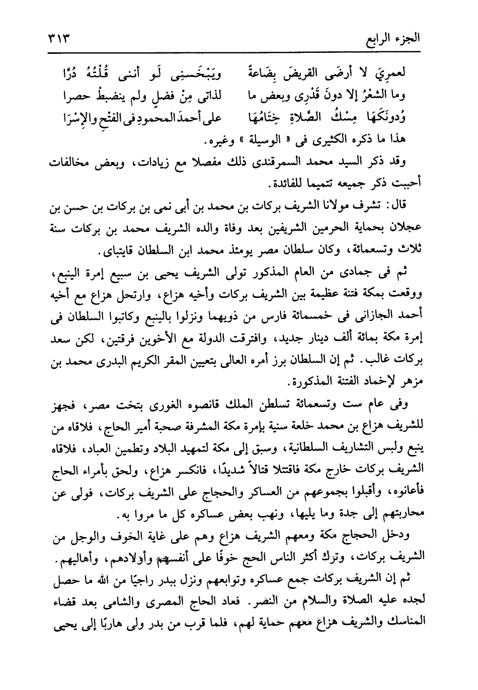 هَذَا مَا ذكره الكثيري فِي الْوَسِيلَة وَغَيره وَقد ذكر السَّيِّد مُحَمَّد السَّمرقَنْدِي ذَلِك مفصلا مَعَ زيادات وَبَعض مخالفات أَحْبَبْت ذكر جَمِيعه تتميماً للفائدة قَالَ تشرف مَوْلَانَا الشريف بَرَكَات بن مُحَمَّد بن أبي نمي بن بَرَكَات بن حسن بن عجلَان بحماية الْحَرَمَيْنِ الشريفين بعد وَفَاة وَالِده الشريف مُحَمَّد بن بَرَكَات سنة ثَلَاث وَتِسْعمِائَة وَكَانَ سُلْطَان مصر يَوْمئِذٍ مُحَمَّد ابْن السُّلْطَان قايتباي ثمَّ فِي جُمَادَى من الْعَام الْمَذْكُور تولى الشريف يحيى بن سبيع إمرة الينبع وَوَقعت بِمَكَّة فتْنَة عَظِيمَة بَين الشريف بَرَكَات وأخيه هزاع وارتحل هزاع مَعَ أَخِيه أَحْمد الجازاني فِي خَمْسمِائَة فَارس من ذويهما ونزلوا بالينبع وكاتبوا السُّلْطَان فِي إمرة مَكَّة بِمِائَة ألف دِينَار جَدِيد وافترقت الدولة مَعَ الْأَخَوَيْنِ فرْقَتَيْن لَكِن سعد بَرَكَات غَالب ثمَّ إِن السُّلْطَان برز أمره العالي بِتَعْيِين الْمقر الْكَرِيم البدري مُحَمَّد بن مزهر لإخماد الْفِتْنَة الْمَذْكُورَة وَفِي عَام سِتّ وَتِسْعمِائَة تسلطن الْملك قانصوه الغوري بتخت مصر فَجهز للشريف هزاع بن مُحَمَّد خلعة سنية بإمرة مَكَّة المشرفة صُحْبَة أَمِير الْحَاج فلاقاه من يَنْبع وَلبس التشاريف السُّلْطَانِيَّة وَسبق إِلَى مَكَّة لتمهيد الْبِلَاد وتطمين الْعباد فلاقاه الشريف بَرَكَات خَارج مَكَّة فاقتتلا قتالاً شَدِيدا فانكسر هزاع وَلحق بأمراء الْحَاج فأعانوه وَأَقْبلُوا بجموعهم من العساكر وَالْحجاج على الشريف بَرَكَات فولى عَن محاربتهم إِلَى جدة وَمَا يَليهَا وَنهب بعض عساكره كل مَا مروا بِهِ وَدخل الْحجَّاج مَكَّة وَمَعَهُمْ الشريف هزاع وهم على غَايَة الْخَوْف والوجل من الشريف بَرَكَات وَترك أَكثر النَّاس الْحَج خوفًا على أنفسهم وَأَوْلَادهمْ وأهاليهم ثمَّ إِن الشريف بَرَكَات جمع عساكره وتوابعهم وَنزل ببدر راجياً من الله مَا حصل لجده عَلَيْهِ الصَّلَاة وَالسَّلَام من النَّصْر فَعَاد الْحَاج الْمصْرِيّ والشامي بعد قَضَاء الْمَنَاسِك والشريف هزاع مَعَهم حماية لَهُم فَلَمَّا قرب من بدر ولى هَارِبا إِلَى يحيى