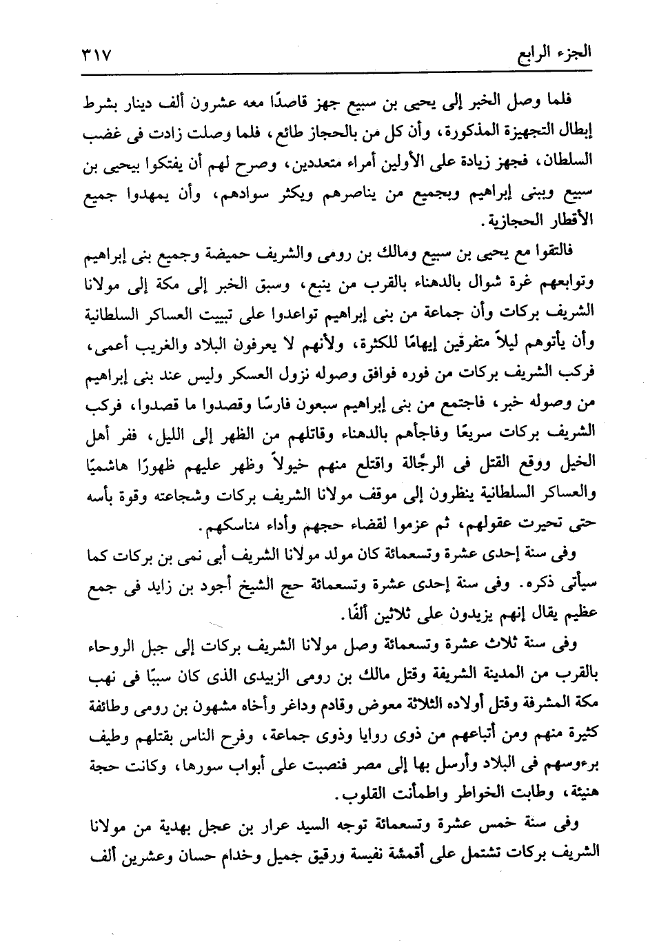 فَلَمَّا وصل الْخَبَر إِلَى يحيى بن سبيع جهز قَاصِدا مَعَه عشرُون ألف دِينَار بِشَرْط إبِْطَال التجهيزة الْمَذْكُورَة وَأَن كل من بالحجاز طائع فَلَمَّا وصلت زَادَت فِي غضب السُّلْطَان فَجهز زِيَادَة على الْأَوَّلين أُمَرَاء متعددين وَصرح لَهُم أَن يفتكوا بِيَحْيَى بن سبيع وبينى إِبْرَاهِيم وبجميع من يناصرهم وَيكثر سوادهم وَأَن يمهدوا جَمِيع الأقطار الحجازية فَالْتَقوا مَعَ يحيى بن سبيع وَمَالك بن رومي والشريف حميضة وَجَمِيع بني إِبْرَاهِيم وتوابعهم غرَّة شَوَّال بالدهناء بِالْقربِ من يَنْبع وَسبق الْخَبَر إِلَى مَكَّة إِلَى مَوْلَانَا الشريف بَرَكَات وَأَن جمَاعَة من بني إِبْرَاهِيم تواعدوا على تبييت العساكر السُّلْطَانِيَّة وَأَن يأتوهم لَيْلًا مُتَفَرّقين إيهاماً للكثرة وَلِأَنَّهُم لَا يعْرفُونَ الْبِلَاد والغريب أعمى فَركب الشريف بَرَكَات من فوره فَوَافَقَ وُصُوله نزُول الْعَسْكَر وَلَيْسَ عِنْد بني إِبْرَاهِيم من وُصُوله خبر فَاجْتمع من بني إِبْرَاهِيم سَبْعُونَ فَارِسًا وقصدوا مَا قصدُوا فَركب الشريف بَرَكَات سَرِيعا وفاجأهم بالدهناء وَقَاتلهمْ من الظّهْر إِلَى اللَّيْل ففر أهل الْخَيل وَوَقع الْقَتْل فِي الرجالة واقتلع مِنْهُم خيولاً وَظهر عَلَيْهِم ظهوراً هاشمياً والعساكر السُّلْطَانِيَّة ينظرُونَ إِلَى موقف مَوْلَانَا الشريف بَرَكَات وشجاعته وَقُوَّة بأسه حَتَّى تحيرت عُقُولهمْ ثمَّ عزموا لقَضَاء حجهم وَأَدَاء مناسكهم وَفِي سنة إِحْدَى عشرَة وَتِسْعمِائَة كَانَ مولد مَوْلَانَا الشريف أبي نمي بن بَرَكَات كَمَا سَيَأْتِي ذكره وَفِي سنة إِحْدَى عشرَة وَتِسْعمِائَة حج الشَّيْخ أَجود بن زايد فِي جمع عَظِيم يُقَال إِنَّهُم يزِيدُونَ على ثَلَاثِينَ ألفا وَفِي سنة ثَلَاث عشرَة وَتِسْعمِائَة وصل مَوْلَانَا الشريف بَرَكَات إِلَى جبل الروحاء بِالْقربِ من الْمَدِينَة الشَّرِيفَة وَقتل مَالك بن رومي الزبيدِيّ الَّذِي كَانَ سَببا فِي نهب مَكَّة المشرفة وَقتل أَوْلَاده الثَّلَاثَة معوض وقادم وداغر وأخاه مشهون بن رومي وَطَائِفَة كَثِيرَة مِنْهُم وَمن أتباعهم من ذَوي روايا وذوى جمَاعَة وَفَرح النَّاس بِقَتْلِهِم وطيف برءوسهم فِي الْبِلَاد وَأرْسل بهَا إِلَى مصر فَنصبت على أَبْوَاب سورها وَكَانَت حجَّة هنيئة وَطَابَتْ الخواطر واطمأنت الْقُلُوب وَفِي سنة خمس عشرَة وَتِسْعمِائَة توجه السَّيِّد عرار بن عجل بهدية من مَوْلَانَا الشريف بَرَكَات تشْتَمل على أقمشة نفيسة ورقيق جميل وخدام حسان وَعشْرين ألف