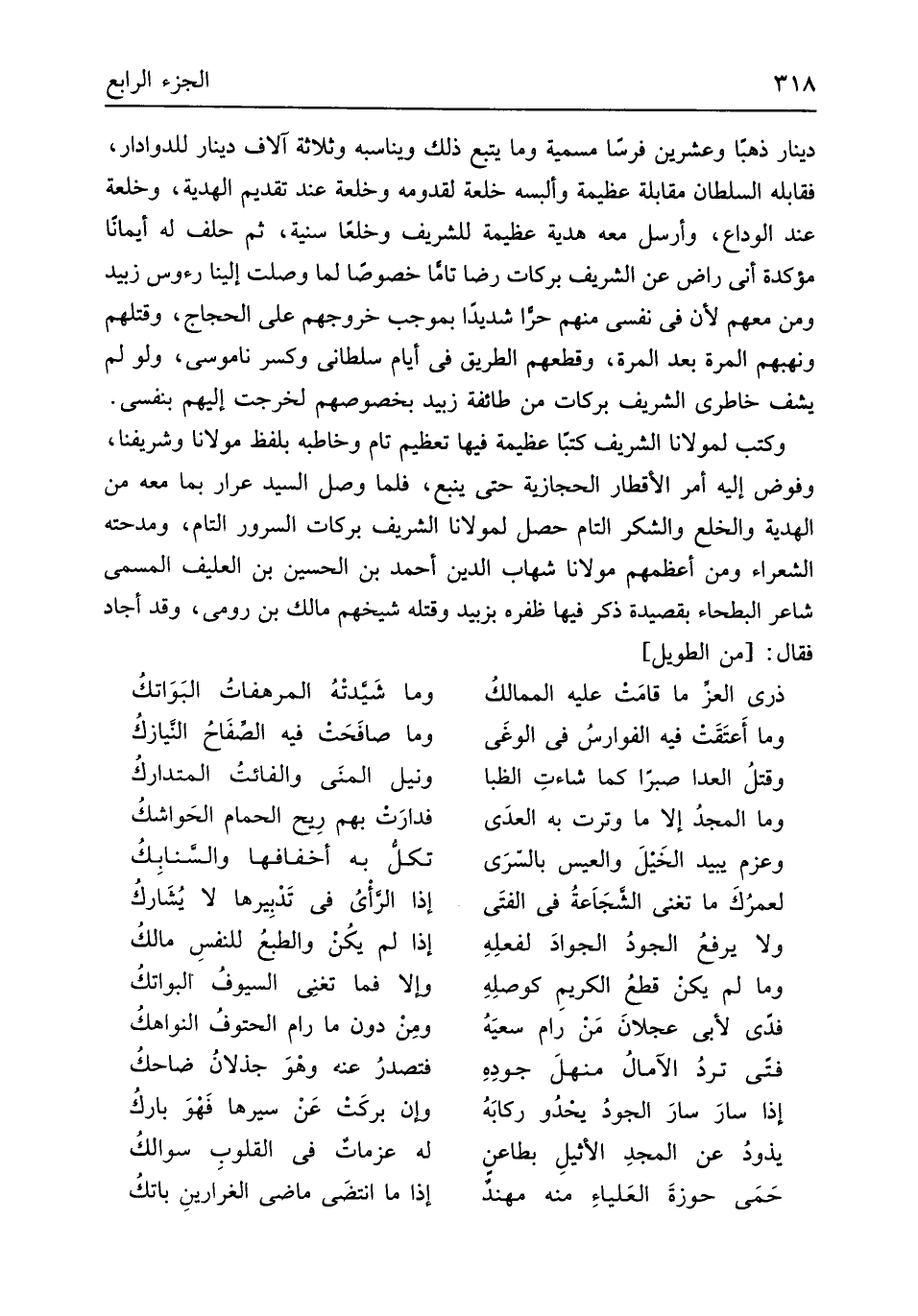 دِينَار ذَهَبا وَعشْرين فرسا مسمية وَمَا يتبع ذَلِك ويناسبه وَثَلَاثَة آلَاف دِينَار للدوادار فقابله السُّلْطَان مُقَابلَة عَظِيمَة وَألبسهُ خلعة لقدومه وخلعة عِنْد تَقْدِيم الْهَدِيَّة وخلعة عِنْد الْوَدَاع وَأرْسل مَعَه هَدِيَّة عَظِيمَة للشريف وخلعاً سنية ثمَّ حلف لَهُ أيماناً مُؤَكدَة أَنِّي رَاض عَن الشريف بَرَكَات رضَا تَاما خُصُوصا لما وصلت إِلَيْنَا رُءُوس زبيد وَمن مَعَهم لِأَن فِي نَفسِي مِنْهُم حرا شَدِيدا بِمُوجب خُرُوجهمْ على الْحجَّاج وقتلهم ونهبهم الْمرة بعد الْمرة وقطعهم الطَّرِيق فِي أَيَّام سلطاني وَكسر ناموسي وَلَو لم يشف خاطري الشريف بَرَكَات من طَائِفَة زبيد بخصوصهم لَخَرَجت إِلَيْهِم بنفسي وَكتب لمولانا الشريف كتبا عَظِيمَة فِيهَا تَعْظِيم تَامّ وخاطبه بِلَفْظ مَوْلَانَا وشريفنا وفوض إِلَيْهِ أَمر الأقطار الحجازية حَتَّى يَنْبع فَلَمَّا وصل السَّيِّد عرار بِمَا مَعَه من الْهَدِيَّة وَالْخلْع وَالشُّكْر التَّام حصل لمولانا الشريف بَرَكَات السرُور التَّام ومدحته الشُّعَرَاء وَمن أعظمهم مَوْلَانَا شهَاب الدّين أَحْمد بن الْحُسَيْن بن العليف الْمُسَمّى شَاعِر الْبَطْحَاء بقصيدة ذكر فِيهَا ظفره بزبيد وَقَتله شيخهم مَالك بن رومي وَقد أَجَاد فَقَالَ // (من الطَّوِيل) //