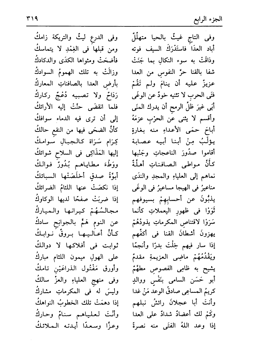 (وَفِي التاجِ غيثٌ بالحيا متهلِّلٌ ... وَفِي الدرعِ ليثٌ والتريكة زامكُ)