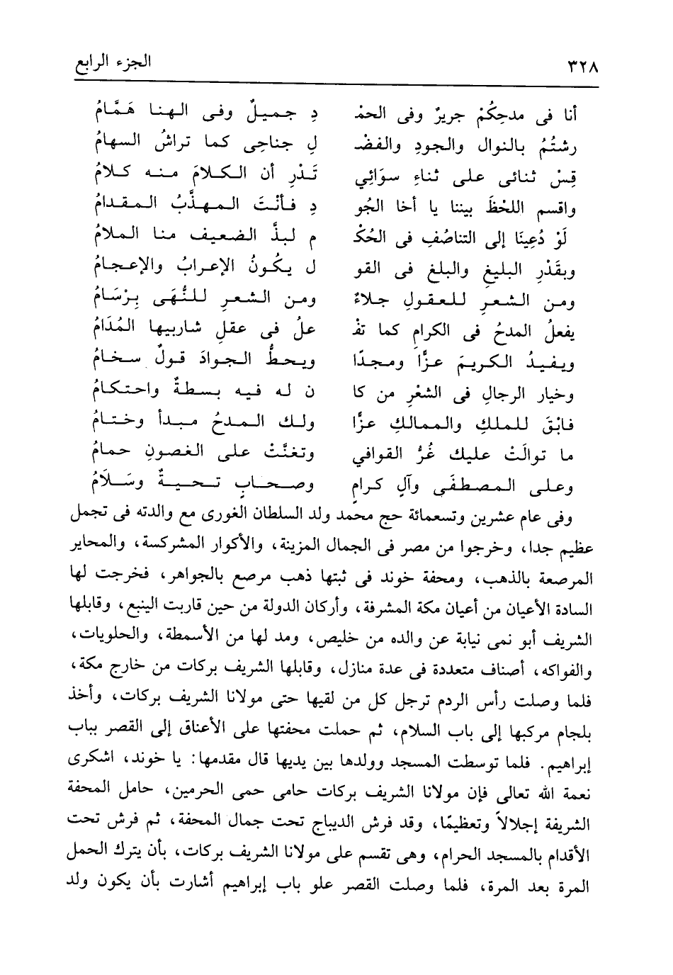 وَفِي عَام عشْرين وَتِسْعمِائَة حج مُحَمَّد ولد السُّلْطَان الغوري مَعَ والدته فِي تجمل عَظِيم جدا وَخَرجُوا من مصر فِي الْجمال المزينة والأكوار المشركسة والمحاير المرصعة بِالذَّهَب ومحفة خوند فِي ثبتها ذهب مرصع بالجواهر فَخرجت لَهَا السَّادة الْأَعْيَان من أَعْيَان مَكَّة المشرفة وأركان الدولة من حِين قاربت الينبع وقابلها الشريف أَبُو نمي نِيَابَة عَن وَالِده من خليص وَمد لَهَا من الأسمطة والحلويات والفواكه أَصْنَاف مُتعَدِّدَة فِي عدَّة منَازِل وقابلها الشريف بَرَكَات من خَارج مَكَّة فَلَمَّا وصلت رَأس الرَّدْم ترجل كل من لقيها حَتَّى مَوْلَانَا الشريف بَرَكَات وَأخذ بلجام مركبها إِلَى بَاب السَّلَام ثمَّ حملت محفتها على الْأَعْنَاق إِلَى الْقصر بِبَاب إِبْرَاهِيم فَلَمَّا توسطت الْمَسْجِد وَوَلدهَا بَين يَديهَا قَالَ مقدمها يَا خوند اشكري نعْمَة الله تَعَالَى فَإِن مَوْلَانَا الشريف بَرَكَات حامي حمى الْحَرَمَيْنِ حَامِل المحفة الشَّرِيفَة إجلالاً وتعظيماً وَقد فرش الديباج تَحت جمال المحفة ثمَّ فرش تَحت الْأَقْدَام بِالْمَسْجِدِ الْحَرَام وَهِي تقسم على مَوْلَانَا الشريف بَرَكَات بِأَن يتْرك الْحمل الْمرة بعد الْمرة فَلَمَّا وصلت الْقصر علو بَاب إِبْرَاهِيم أشارت بِأَن يكون ولد
