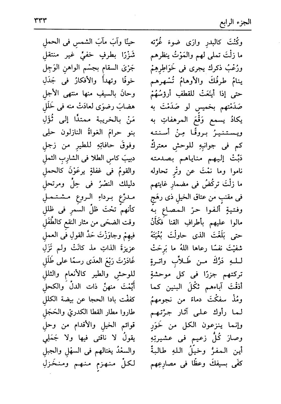 (كم فِي جوانبِهِ للوحشِ معتركٌ ... وفوقَ حافاتِهِ للطيرِ من زجلِ)