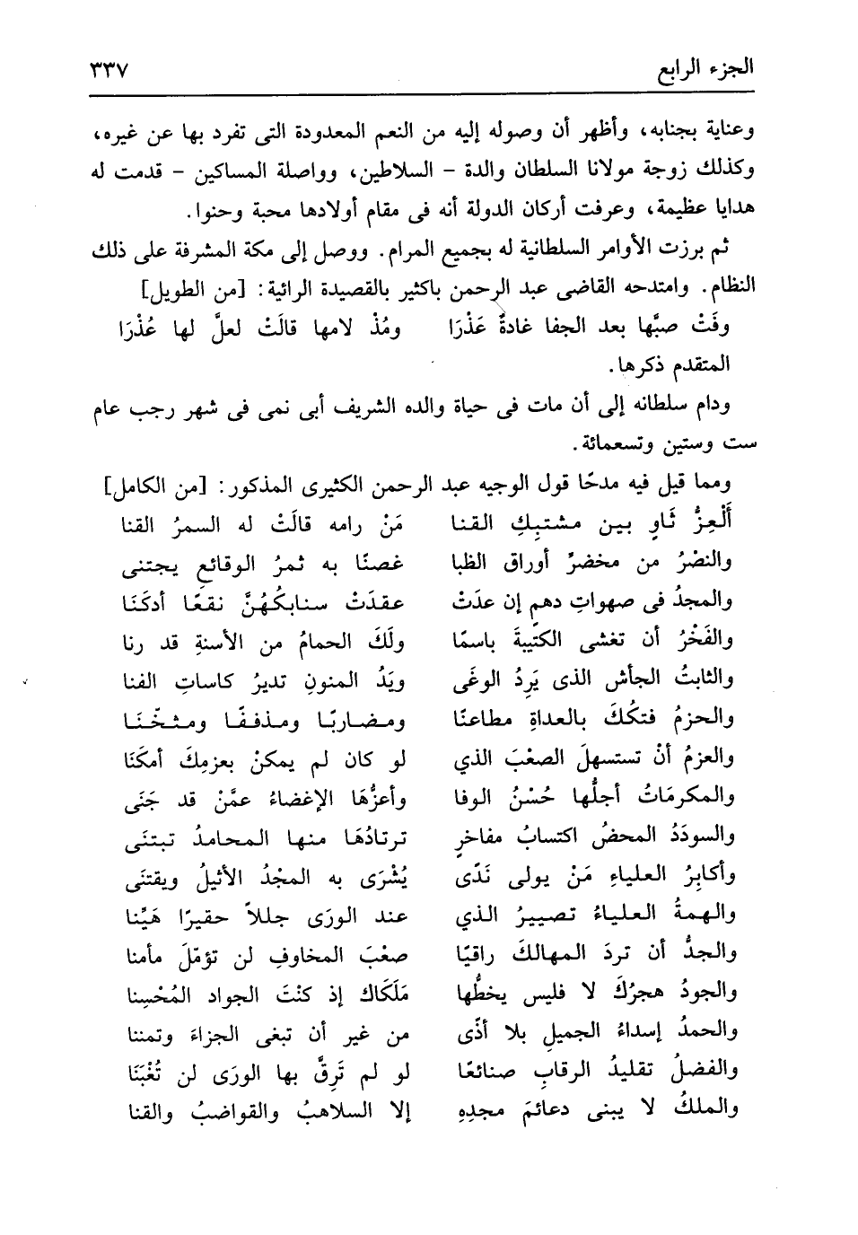 الْمُتَقَدّم ذكرهَا ودام سُلْطَانه إِلَى أَن مَاتَ فِي حَيَاة وَالِده الشريف أبي نمي فِي شهر رَجَب عَام سِتّ وَسِتِّينَ وَتِسْعمِائَة وَمِمَّا قيل فِيهِ مدحاً قَول الْوَجِيه عبد الرَّحْمَن الكثيرى الْمَذْكُور // (من الْكَامِل) //