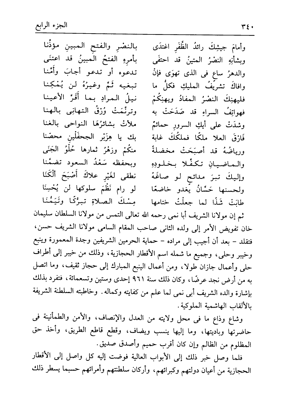 ثمَّ إِن مَوْلَانَا الشريف أَبَا نمي رَحمَه الله تَعَالَى التمس من مَوْلَانَا السُّلْطَان سُلَيْمَان خَان تَفْوِيض الْأَمر إِلَى وَلَده الثَّانِي صَاحب الْمقَام السَّامِي مَوْلَانَا الشريف حسن فتقلد بعد أَن أُجِيب إِلَى مُرَاده حماية الْحَرَمَيْنِ الشريفين وَجدّة المعمورة وينبع وخيبر وحلى وَجَمِيع مَا شَمله اسْم الأقطار الحجازية وَذَلِكَ من خَيْبَر إِلَى أَطْرَاف حلى وأعمال جازان طولا وَمن أَعمال الينبع الْمُبَارك إِلَى حجاز ثَقِيف وَمَا اتَّصل بِهِ من أَرض نجد عرضا وَكَانَ ذَلِك سنة 961 إِحْدَى وَسِتِّينَ وَتِسْعمِائَة فتفرد بذلك بِإِشَارَة وَالِده الشريف أبي نمي لما علم من كِفَايَته وكماله وخاطبته السلطنة الشَّرِيفَة بِالْأَلْقَابِ الهاشمية الملوكية وشاع وذاع مَا فِي مَحل ولَايَته من الْعدْل والإنصاف والأمن والطمأنينة فِي حاضرتها وباديتها وَمَا إِلَيْهَا ينْسب ويضاف وَقطع قَاطع الطَّرِيق وَأخذ حق الْمَظْلُوم من الظَّالِم وَإِن كَانَ أقرب حميم وأصدق صديق فَلَمَّا وصل خبر ذَلِك إِلَى الْأَبْوَاب الْعَالِيَة فوضت إِلَيْهِ كل وَاصل إِلَى الأقطار الحجازية من أَعْيَان دولتهم وكبرائهم وأركان سلطنتهم وأمرائهم حَسْبَمَا يسطر ذَلِك