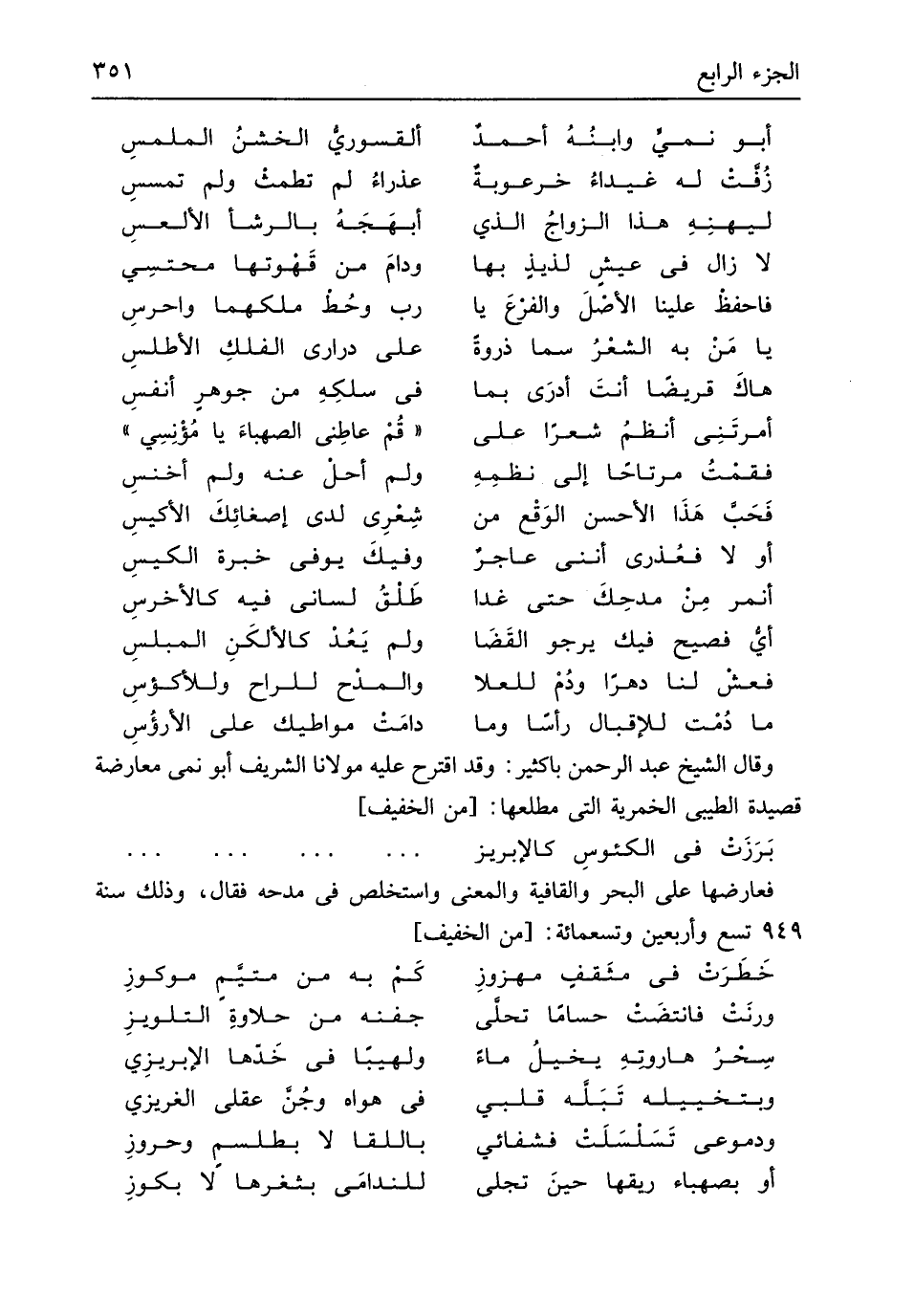 فعارضها على الْبَحْر والقافية وَالْمعْنَى واستخلص فِي مدحه فَقَالَ وَذَلِكَ سنة 949 تسع وَأَرْبَعين وَتِسْعمِائَة // (من الْخَفِيف) //