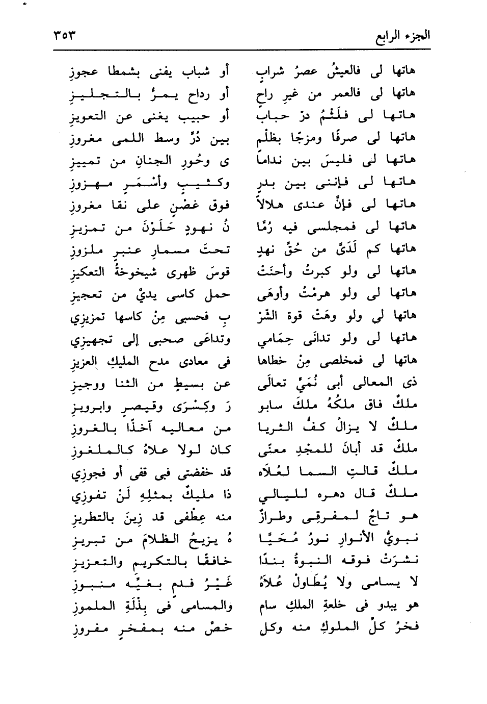 (ملكٌ فاق ملكُهُ ملكَ سابورَ ... وكِسْرَى وقيصرٍ وابرويزِ)