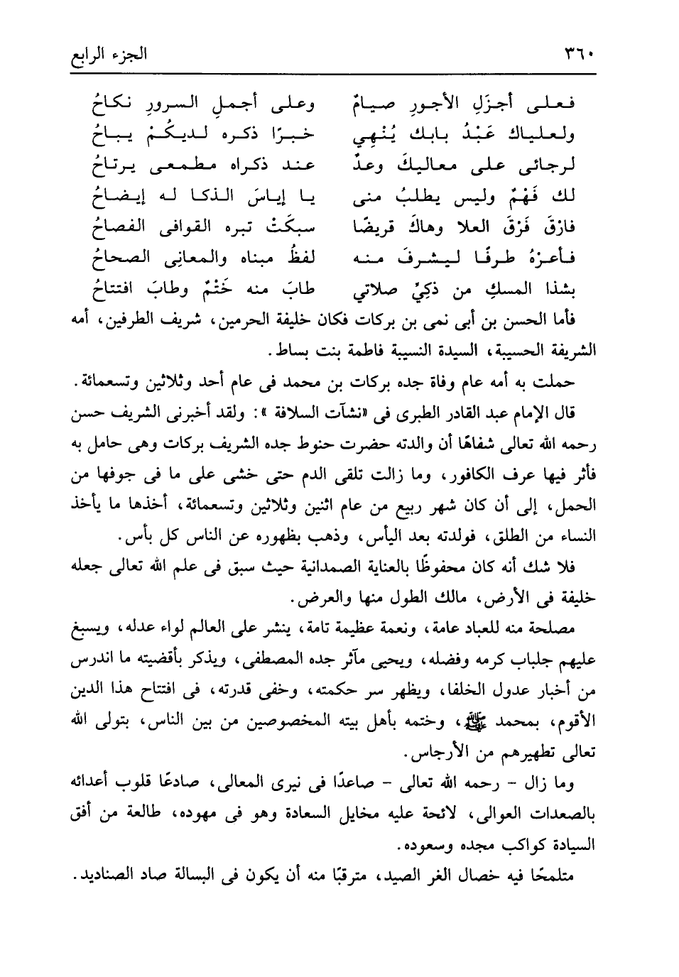 فَأَما الْحسن بن أبي نمي بن بَرَكَات فَكَانَ خَليفَة الْحَرَمَيْنِ شرِيف الطَّرفَيْنِ أمه الشَّرِيفَة الحسيبة السيدة النسيبة فَاطِمَة بنت بِسَاط حملت بِهِ أمه عَام وَفَاة جده بَرَكَات بن مُحَمَّد فِي عَام أحد وَثَلَاثِينَ وَتِسْعمِائَة قَالَ الإِمَام عبد الْقَادِر الطَّبَرِيّ فِي نشآت السلافة وَلَقَد أَخْبرنِي الشريف حسن رَحمَه الله تَعَالَى شفاهاً أَن والدته حضرت حنوط جده الشريف بَرَكَات وَهِي حَامِل بِهِ فأثر فِيهَا عرف الكافور وَمَا زَالَت تلقى الدَّم حَتَّى خشِي على مَا فِي جوفها من الْحمل إِلَى أَن كَانَ شهر ربيع من عَام اثْنَيْنِ وَثَلَاثِينَ وَتِسْعمِائَة أَخذهَا مَا يَأْخُذ النِّسَاء من الطلق فولدته بعد الْيَأْس وَذهب بظهوره عَن النَّاس كل بَأْس فَلَا شكّ أَنه كَانَ مَحْفُوظًا بالعناية الصمدانية حَيْثُ سبق فِي علم الله تَعَالَى جعله خَليفَة فِي الأَرْض مَالك الطول مِنْهَا وَالْعرض مصلحَة مِنْهُ للعباد عَامَّة ونعمة عَظِيمَة تَامَّة ينشر على الْعَالم لِوَاء عدله ويسبغ عَلَيْهِم جِلْبَاب كرمه وفضله وَيحيى مآثر جده الْمُصْطَفى وَيذكر بأقضيته مَا اندرس من أَخْبَار عدُول الخلفا وَيظْهر سر حكمته وخفي قدرته فى افْتِتَاح هَذَا الدّين الأقوم بِمُحَمد