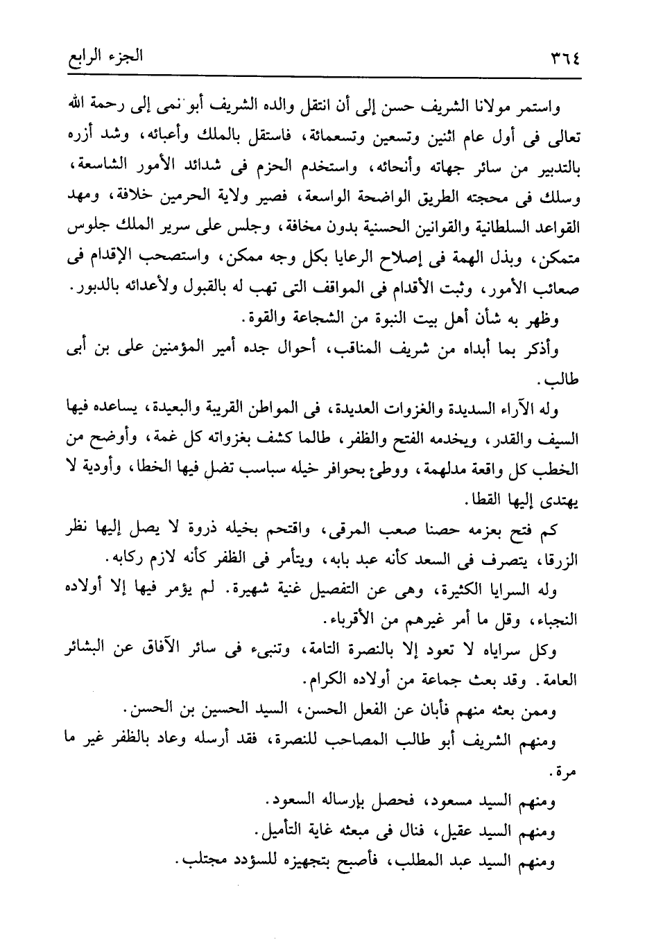 وَاسْتمرّ مَوْلَانَا الشريف حسن إِلَى أَن انْتقل وَالِده الشريف أَبُو نمي إِلَى رَحْمَة الله تَعَالَى فِي أول عَام اثْنَيْنِ وَتِسْعين وَتِسْعمِائَة فاستقل بِالْملكِ وأعبائه وَشد أزره بِالتَّدْبِيرِ من سَائِر جهاته وأنحائه واستخدم الحزم فِي شَدَائِد الْأُمُور الشاسعة وسلك فِي محجته الطَّرِيق الْوَاضِحَة الواسعة فصير ولَايَة الْحَرَمَيْنِ خلَافَة ومهد الْقَوَاعِد السُّلْطَانِيَّة والقوانين الحسنية بِدُونِ مَخَافَة وَجلسَ على سَرِير الْملك جُلُوس مُتَمَكن وبذل الهمة فِي إصْلَاح الرعايا بِكُل وَجه مُمكن واستصحب الْإِقْدَام فِي صعائب الْأُمُور وَثَبت الْأَقْدَام فِي المواقف الَّتِي تهب لَهُ بِالْقبُولِ ولأعدائه بالدبور وَظهر بِهِ شَأْن أهل بَيت النُّبُوَّة من الشجَاعَة وَالْقُوَّة وأذكر بِمَا أبداه من شرِيف المناقب أَحْوَال جده أَمِير الْمُؤمنِينَ عَليّ بن أبي طَالب وَله الاراء السديدة والغزوات العديدة فِي المواطن الْقَرِيبَة والبعيدة يساعده فِيهَا السَّيْف وَالْقدر ويخدمه الْفَتْح وَالظفر طالما كشف بغزواته كل غمَّة وأوضح من الْخطب كل وَاقعَة مدلهمة ووطئ بحوافر خيله سباسب تضل فِيهَا الخطا وأودية لَا يَهْتَدِي إِلَيْهَا القطا كم فتح بعزمه حصناً صَعب المرقى واقتحم بخيله ذرْوَة لَا يصل إِلَيْهَا نظر الزرقا يتَصَرَّف فِي السعد كَأَنَّهُ عبد بَابه ويتأمر فِي الظفر كَأَنَّهُ لَازم ركابه وَله السَّرَايَا الْكَثِيرَة وَهِي عَن التَّفْصِيل غنية شهيرة لم يُؤمر فِيهَا إِلَّا أَوْلَاده النجباء وَقل مَا أَمر غَيرهم من الأقرباء وكل سراياه لَا تعود إِلَّا بالنصرة التَّامَّة وتنبئ فِي سَائِر الْآفَاق عَن البشائر الْعَامَّة وَقد بعث جمَاعَة من أَوْلَاده الْكِرَام وَمِمَّنْ بَعثه مِنْهُم فأبان عَن الْفِعْل الْحسن السَّيِّد الْحُسَيْن بن الْحسن وَمِنْهُم الشريف أَبُو طَالب المصاحب للنصرة فقد أرْسلهُ وَعَاد بالظفر غير مَا مرّة وَمِنْهُم السَّيِّد مَسْعُود فَحصل بإرساله السُّعُود وَمِنْهُم السَّيِّد عقيل فنال فِي مبعثه غَايَة التأميل وَمِنْهُم السَّيِّد عبد الْمطلب فَأصْبح بتجهيزه للسؤدد مجتلب