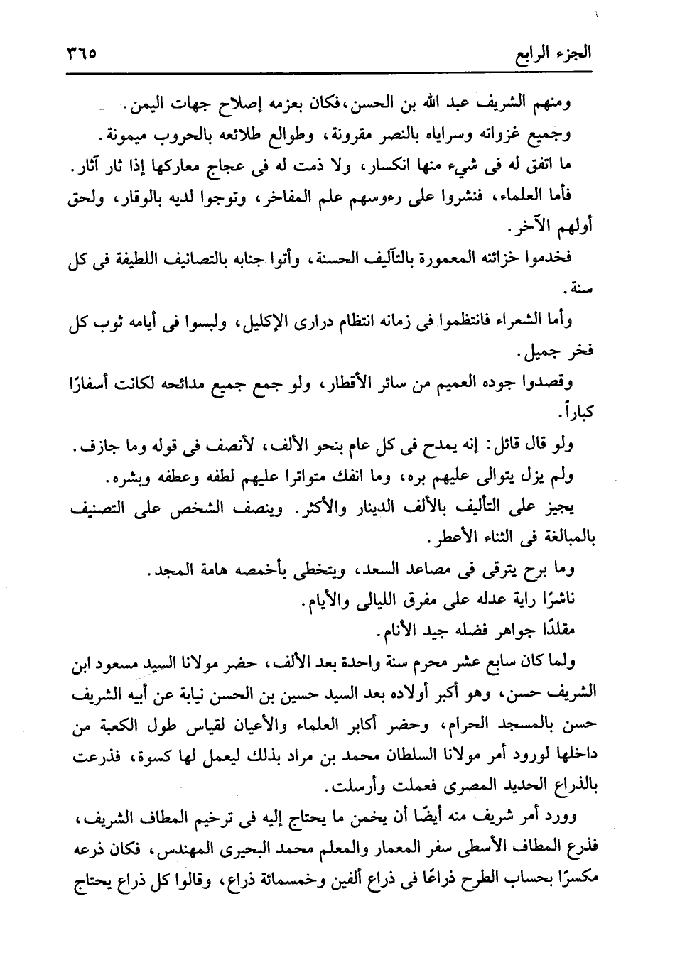 وَمِنْهُم الشريف عبد الله بن الْحسن فَكَانَ بعزمه إصْلَاح جِهَات الْيمن وَجَمِيع غَزَوَاته وسراياه بالنصر مقرونة وطوالع طلائعه بالحروب مَيْمُونَة مَا اتّفق لَهُ فِي شَيْء مِنْهَا انكسار وَلَا ذمت لَهُ فِي عجاج معاركها إِذا ثار آثَار فَأَما الْعلمَاء فنشروا على رُءُوسهم علم المفاخر وترجوا لَدَيْهِ بالوقار وَلحق أَوَّلهمْ الآخر فخدموا خزائنه المعمورة بالتآليف الْحَسَنَة وَأتوا جنابه بالتصانيف اللطيفة فِي كل سنة وَأما الشُّعَرَاء فانتظموا فِي زَمَانه انتظام دراري الإكليل ولبسوا فِي أَيَّامه ثوب كل فَخر جميل وقصدوا جوده العميم من سَائِر الأقطار وَلَو جمع جَمِيع مدائحه لكَانَتْ أسفاراً كبارًا وَلَو قَالَ قَائِل إِنَّه يمدح فِي كل عَام بِنَحْوِ الْألف لأنصف فِي قَوْله وَمَا جازف وَلم يزل يتوالى عَلَيْهِم بره وَمَا انْفَكَّ متواترا عَلَيْهِم لطفه وعظفه وبشره يُجِيز على التَّأْلِيف بِالْألف الدِّينَار وَالْأَكْثَر وينصف الشَّخْص على التصنيف بالمبالغة فِي الثَّنَاء الأعطر وَمَا برح يترقى فِي مصاعد السعد ويتخطى بأخمصه هَامة الْمجد ناشراً راية عدله على مفرق اللَّيَالِي وَالْأَيَّام مُقَلدًا جَوَاهِر فَضله جيد الْأَنَام وَلما كَانَ سَابِع عشر محرم سنة وَاحِدَة بعد الْألف حضر مَوْلَانَا السَّيِّد مَسْعُود ابْن الشريف حسن وَهُوَ أكبر أَوْلَاده بعد السَّيِّد حُسَيْن بن الْحسن نِيَابَة عَن أَبِيه الشريف حسن بِالْمَسْجِدِ الْحَرَام وَحضر أكَابِر الْعلمَاء والأعيان لقياس طول الْكَعْبَة من داخلها لوُرُود أَمر مَوْلَانَا السُّلْطَان مُحَمَّد بن مُرَاد بذلك ليعْمَل لَهَا كسْوَة فذرعت بالذراع الْحَدِيد الْمصْرِيّ فَعمِلت وَأرْسلت وَورد أَمر شرِيف مِنْهُ أَيْضا أَن يخمن مَا يحْتَاج إِلَيْهِ فِي ترخيم المطاف الشريف فذرع المطاف الأسطى سفر المعمار والمعلم مُحَمَّد الْبُحَيْرِي المهندس فَكَانَ ذرعه مكسراً بِحِسَاب الطرح ذِرَاعا فِي ذِرَاع أَلفَيْنِ وَخَمْسمِائة ذِرَاع وَقَالُوا كل ذِرَاع يحْتَاج