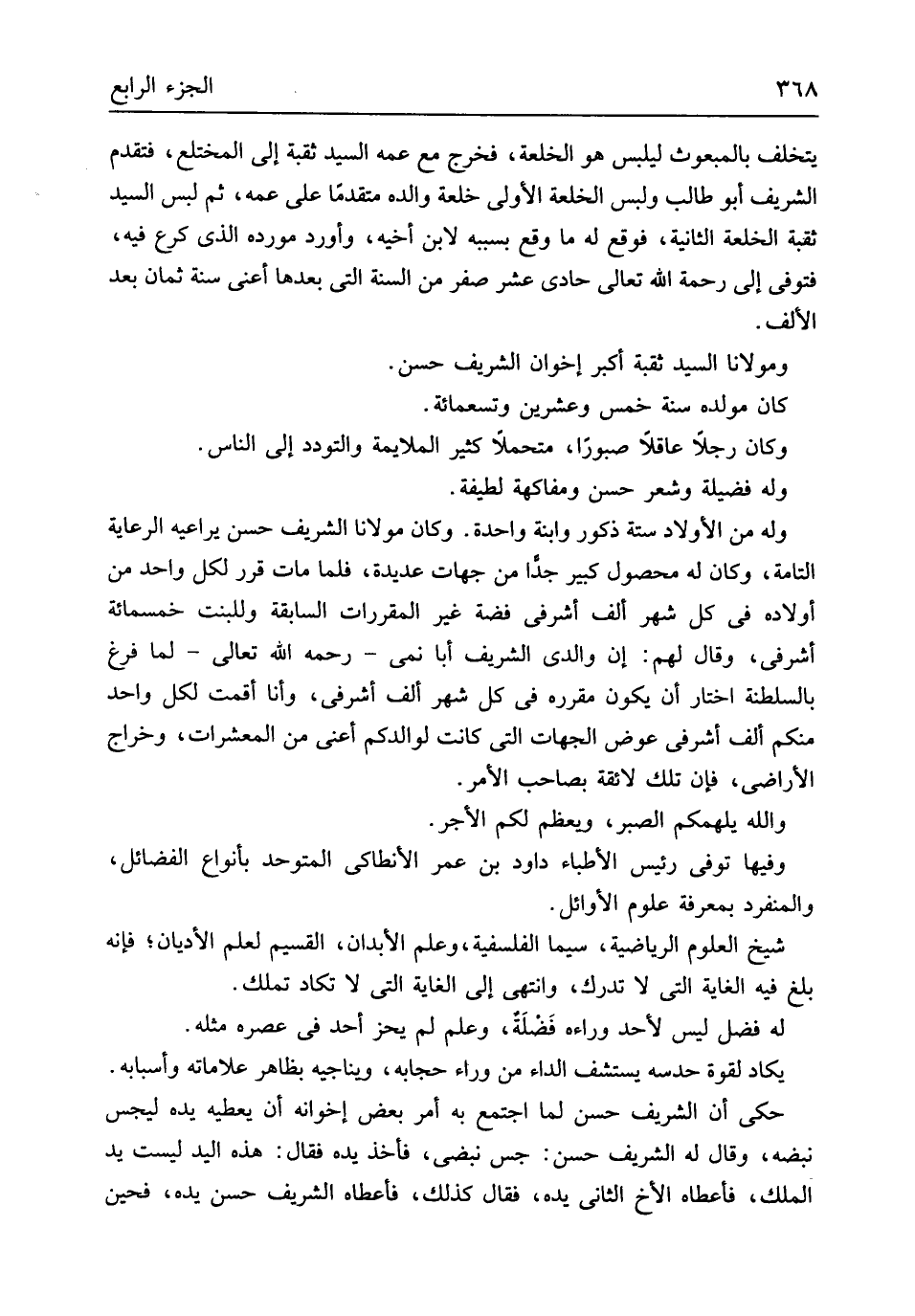 يتَخَلَّف بالمبعوث ليلبس هُوَ الخلعة فَخرج مَعَ عَمه السَّيِّد ثقبة إِلَى المختلغ فَتقدم الشريف أَبُو طَالب وَلبس الخلعة الأولى خلعة وَالِده مُتَقَدما على عَمه ثمَّ لبس السَّيِّد ثقبة الخلعة الثَّانِيَة فَوَقع لَهُ مَا وَقع بِسَبَبِهِ لِابْنِ أَخِيه وَأورد مورده الَّذِي كرع فِيهِ فَتوفي إِلَى رَحْمَة الله تَعَالَى حادي عشر صفر من السّنة الَّتِي بعْدهَا أَعنِي سنة ثَمَان بعد الْألف ومولانا السَّيِّد ثقبة أكبر إخْوَان الشريف حسن كَانَ مولده سنة خمس وَعشْرين وَتِسْعمِائَة وَكَانَ رجلا عَاقِلا صبوراً متحملاً كثير الملايمة والتودد إِلَى النَّاس وَله فَضِيلَة وَشعر حسن ومفاكهة لَطِيفَة وَله من الْأَوْلَاد سِتَّة ذُكُور وَابْنَة وَاحِدَة وَكَانَ مَوْلَانَا الشريف حسن يراعيه الرِّعَايَة التَّامَّة وَكَانَ لَهُ محصول كَبِير جدا من جِهَات عديدة فَلَمَّا مَاتَ قرر لكل وَاحِد من أَوْلَاده فِي كل شهر ألف أشرفي فضَّة غير المقررات السَّابِقَة وللبنت خَمْسمِائَة أشرفي وَقَالَ لَهُم إِن وَالِدي الشريف أَبَا نمي رَحمَه الله تَعَالَى لما فرغ بالسلطنة اخْتَار أَن يكون مقرره فِي كل شهر ألف أشرفي وَأَنا أَقمت لكل وَاحِد مِنْكُم ألف أشرفي عوض الْجِهَات الَّتِي كَانَت لوالدكم أَعنِي من المعشرات وخراج الْأَرَاضِي فَإِن تِلْكَ لائقة بِصَاحِب الْأَمر وَالله يلهمكم الصَّبْر ويعظم لكم الْأجر وفيهَا توفّي رَئِيس الْأَطِبَّاء دَاوُد بن عمر الْأَنْطَاكِي المتوحد بأنواع الْفَضَائِل وَالْمُنْفَرد بِمَعْرِِفَة عُلُوم الْأَوَائِل شيخ الْعُلُوم الرياضية سِيمَا الفلسفية وَعلم الْأَبدَان القسيم لعلم الْأَدْيَان فَإِنَّهُ بلغ فِيهِ الْغَايَة الَّتِي لَا تدْرك وانْتهى إِلَى الْغَايَة الَّتِي لَا تكَاد تملك لَهُ فضل لَيْسَ لأحد وَرَاءه فَضلَة وَعلم لم يحز أحد فِي عصره مثله يكَاد لقُوَّة حدسه يسْتَشف الدَّاء من وَرَاء حجابه ويناجيه بِظَاهِر علاماته وأسبابه حكى أَن الشريف حسن لما اجْتمع بِهِ أَمر بعض إخْوَته أَن يُعْطِيهِ يَده ليجس نبضه وَقَالَ لَهُ الشريف حسن جس نبضي فَأخذ يَده فَقَالَ هَذِه الْيَد لَيست يَد الْملك فَأعْطَاهُ الْأَخ الثانى يَده فَقَالَ كَذَلِك فَأعْطَاهُ الْأَخ الثَّانِي يَده فَقَالَ كَذَلِك فَأعْطَاهُ الشريف حسن يَده فحين