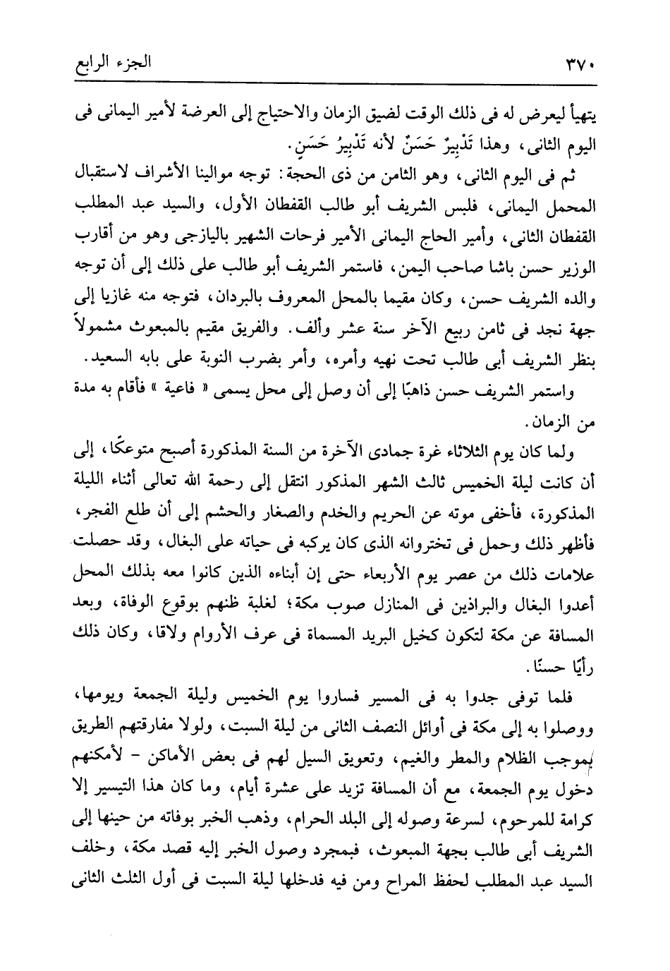 يتهيأ ليعرض لَهُ فِي ذَلِك الْوَقْت لضيق الزَّمَان والاحتياج إِلَى العرضة لأمير الْيَمَانِيّ فِي الْيَوْم الثانى وَهَذَا تَدْبِير حَسَنٌ لِأَنَّهُ تَدْبِيرُ حَسَنٍ ثمَّ فِي الْيَوْم الثَّانِي وَهُوَ الثَّامِن من ذِي الْحجَّة توجه موالينا الْأَشْرَاف لاستقبال الْمحمل الْيَمَانِيّ فَلبس الشريف أَبُو طَالب القفطان الأول وَالسَّيِّد عبد الْمطلب القفطان الثَّانِي وأمير الْحَاج الْيَمَانِيّ الْأَمِير فرحات الشهير باليازجي وَهُوَ من أقَارِب الْوَزير حسن باشا صَاحب الْيمن فاستمر الشريف أَبُو طَالب على ذَلِك إِلَى أَن توجه وَالِده الشريف حسن وَكَانَ مُقيما بِالْمحل الْمَعْرُوف بالبردان فتوجة مِنْهُ غازياً إِلَى جِهَة نجد فِي ثامن ربيع الآخر سنة عشرَة وَألف والفريق مُقيم بالمبعوث مشمولاً بِنَظَر الشريف أبي طَالب تَحت نَهْيه وَأمره وَأمر بِضَرْب النّوبَة على بَابه السعيد وَاسْتمرّ الشريف حسن ذَاهِبًا إِلَى أَن وصل إِلَى مَحل يُسمى فاعية فَأَقَامَ بِهِ مُدَّة من الزَّمَان وَلما كَانَ يَوْم الثُّلَاثَاء غرَّة جُمَادَى الْآخِرَة من السّنة الْمَذْكُورَة أصبح متوعكاً إِلَى أَن كَانَت لَيْلَة الْخَمِيس ثَالِث الشَّهْر الْمَذْكُور انْتقل إِلَى رَحْمَة الله تَعَالَى أثْنَاء اللَّيْلَة الْمَذْكُورَة فأخفى مَوته عَن الْحَرِيم والخدم وَالصغَار والحشم إِلَى أَن طلع الْفجْر فأظهر ذَلِك وَحمل فِي تختروانه الَّذِي كَانَ يركبه فِي حَيَاته على البغال وَقد حصلت عَلَامَات ذَلِك من عصر يَوْم الْأَرْبَعَاء حَتَّى إِن أبناءه الَّذين كَانُوا مَعَه بذلك الْمحل أعدُّوا البغال والبراذين فِي الْمنَازل صوب مَكَّة لغَلَبَة ظنهم بِوُقُوع الْوَفَاة وَبعد الْمسَافَة عَن مَكَّة لتَكون كخيل الْبَرِيد الْمُسَمَّاة فِي عرف الأروام ولاقاً وَكَانَ ذَلِك رَأيا حسنا فَلَمَّا توفّي جدوا بِهِ فِي الْمسير فَسَارُوا يَوْم الْخَمِيس وَلَيْلَة الْجُمُعَة ويومها ووصلوا بِهِ إِلَى مَكَّة فِي أَوَائِل النّصْف الثَّانِي من لَيْلَة السبت وَلَوْلَا مفارقتهم الطَّرِيق بِمُوجب الظلام والمطر والغيم وتعويق السَّيْل لَهُم فى بعض الْأَمَاكِن لأمكنهم دُخُول يَوْم الْجُمُعَة مَعَ أَن الْمسَافَة تزيد على عشرَة أَيَّام وَمَا كَانَ هَذَا التَّيْسِير إِلَّا كَرَامَة للمرحوم لسرعة وُصُوله إِلَى الْبَلَد الْحَرَام وَذهب الْخَبَر بوفاته من حينها إِلَى الشريف أَبى طَالب بِجِهَة الْمَبْعُوث فبمجرد وصل الْخَبَر إِلَيْهِ قصد مَكَّة وَخلف السَّيِّد عبد الْمطلب لحفظ المراح وَمن فِيهِ فَدَخلَهَا لَيْلَة السبت فِي أول الثُّلُث الثَّانِي