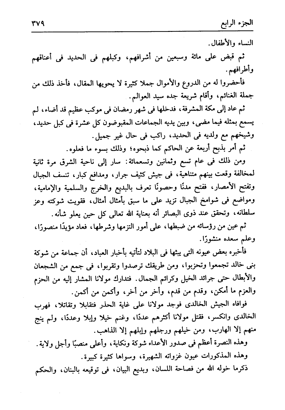 النِّسَاء والأطفال ثمَّ قبض على مائَة وَسبعين من أَشْرَافهم وكبلهم فِي الْحَدِيد فِي أَعْنَاقهم وأطرافهم فأحضروا لَهُ من الدروع وَالْأَمْوَال جملا كَثِيرَة لَا يحويها الْمقَام فَأخذ ذَلِك من جملَة الْغَنَائِم وَأقَام شَرِيعَة جده سيد العوالم ثمَّ عَاد إِلَى مَكَّة المشرفة فَدَخلَهَا فِي شهر رَمَضَان فِي موكب عَظِيم قد أَضَاء لم يسمع بِمثلِهِ فِيمَا مضى وَبَين يَدَيْهِ الْجَمَاعَات المقبوضون كل عشرَة فِي كبل حَدِيد وشيخهم مَعَ ولديه فِي الْحَدِيد رَاكب فِي حَال غير جميل ثمَّ أَمر بِذبح أَرْبَعَة عَن الْحَاكِم كَمَا ذبحوه وَذَلِكَ بِسوء مَا فَعَلُوهُ وَمن ذَلِك فِي عَام تسع وَثَمَانِينَ وَتِسْعمِائَة سَار إِلَى نَاحيَة الشرق مرّة ثَانِيَة لمُخَالفَة وَقعت بَينهم متناهية فِي جَيش كثيف جرار ومدافع كبار تنسف الْجبَال وتفتح الْأَمْصَار فَفتح مدناً وحصوناً تعرف بالبديع والخرج والسلمية والإمامية ومواضع فِي شوامخ الْجبَال تزيد على مَا سبق بأمثال أَمْثَال فَقَوِيت شوكته وَعز سُلْطَانه وَتحقّق عِنْد ذَوي البصائر أَنه بعناية الله تَعَالَى كل حِين يَعْلُو شَأْنه ثمَّ عين من رؤسائه من ضَبطهَا على أُمُور التزمها وَشَرطهَا فَعَاد مؤيداً منصوراً وَعلم سعده منشوراً فَأخْبرهُ بعض عيونه الَّتِي يبثها فِي الْبِلَاد لتأتيه بأخبار الْعباد أَن جمَاعَة من شَوْكَة بني خَالِد تجمعُوا وتحزبوا وَمن طريقك ترصدوا وتقربوا فِي جمع من الشجعان والأبطال حَتَّى جرائد الْخَيل وكرائم الْجمال فتدارك مَوْلَانَا الْمشَار إِلَيْهِ من الحزم والعزم مَا أمكن وَقدم من قدم وَأخر من أخر وأكمن من أكمن فوافاه الْجَيْش الخالدي فَوجدَ مَوْلَانَا على غَايَة الحذر فتقابلا وتقاتلا فهرب الخالدي وانكسر فَقتل مَوْلَانَا أَكْثَرهم عددا وغنم خيلا وإبلا وعددا وَلم ينج مِنْهُم إِلَّا الهارب وَمن خيلهم ورجلهم وإبلهم إِلَّا الذَّاهِب وَهَذِه النُّصْرَة أعظم فِي صُدُور الْأَعْدَاء شَوْكَة ونكاية وَأَعْلَى منصباً وَأجل ولَايَة وَهَذِه الْمَذْكُورَات عُيُون غَزَوَاته الشهيرة وسواها كَثِيرَة كَبِيرَة ذكرما خوله الله من فصاحة اللِّسَان وبديع الْبَيَان فِي توقيعه بالبنان وَالْحكم