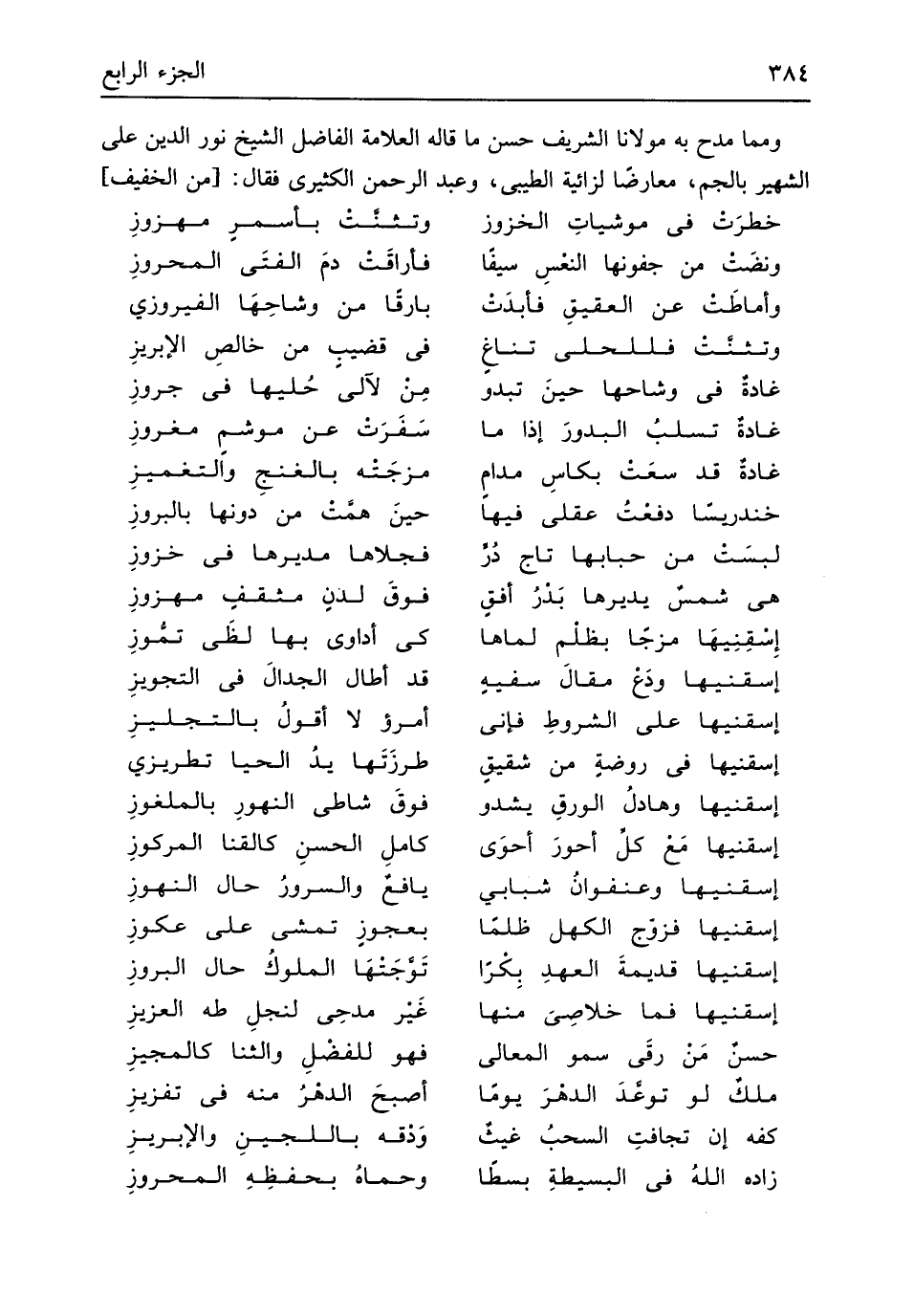 وَمِمَّا مدح بِهِ مَوْلَانَا الشريف حسن مَا قَالَه الْعَلامَة الْفَاضِل الشَّيْخ نور الدّين عَليّ الشهير بالجم مُعَارضا لزائية الطَّيِّبِيّ وَعبد الرَّحْمَن الكثيري فَقَالَ // (من الْخَفِيف) //