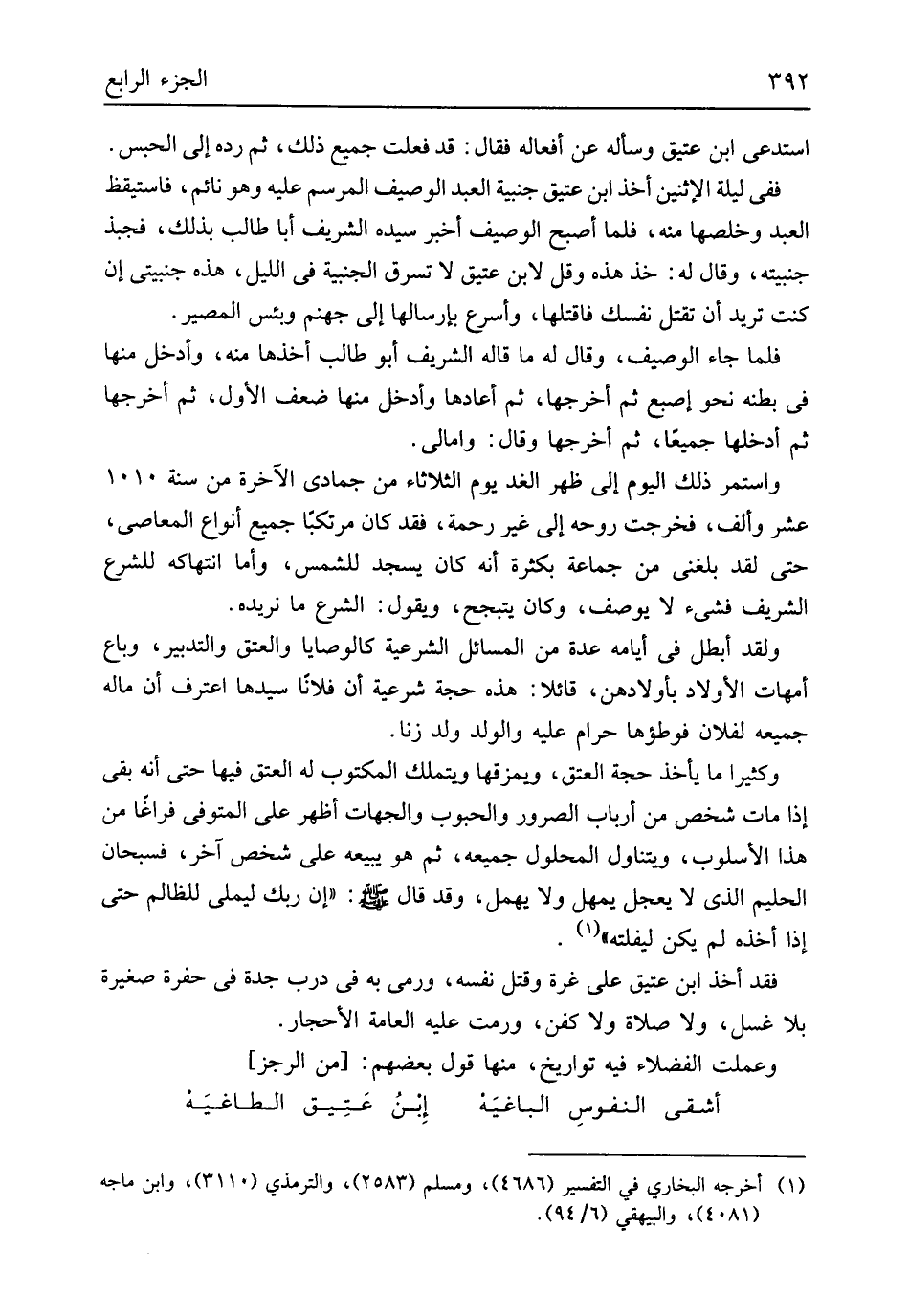 استدعي ابْن عَتيق وَسَأَلَهُ عَن أَفعاله فَقَالَ قد فعلت جَمِيع ذَلِك ثمَّ رده إِلَى الْحَبْس فَفِي لَيْلَة الْإِثْنَيْنِ أَخذ ابْن عَتيق جنبية العَبْد الوصيف المرسم عَلَيْهِ وَهُوَ نَائِم فَاسْتَيْقَظَ العَبْد وخلصها مِنْهُ فَلَمَّا أصبح الوصيف أخبر سَيّده الشريف أَبَا طَالب بذلك فجبذ جنبيته وَقَالَ لَهُ خُذ هَذِه وَقل لِابْنِ عَتيق لَا تسرق الجنبية فِي اللَّيْل هَذِه جنبيتي إِن كنت تُرِيدُ أَن تقتل نَفسك فَاقْتُلْهَا وأسرع بإرسالها إِلَى جَهَنَّم وَبئسَ الْمصير فَلَمَّا جَاءَ الوصيف وَقَالَ لَهُ مَا قَالَه الشريف أَبُو طَالب أَخذهَا مِنْهُ وَأدْخل مِنْهَا فِي بَطْنه نَحْو إِصْبَع ثمَّ أخرجهَا ثمَّ أَعَادَهَا وَأدْخل مِنْهَا ضعف الأول ثمَّ أخرجهَا ثمَّ أدخلها جَمِيعًا ثمَّ أخرجهَا وَقَالَ وامالى وَاسْتمرّ ذَلِك الْيَوْم إِلَى ظهر الْغَد يَوْم الثُّلَاثَاء من جُمَادَى الْآخِرَة من سنة 1010 عشر وَألف فَخرجت روحه إِلَى غير رَحْمَة فقد كَانَ مرتكباً جَمِيع أَنْوَاع الْمعاصِي حَتَّى لقد بَلغنِي من جمَاعَة بِكَثْرَة أَنه كَانَ يسْجد للشمس وَأما انتهاكه للشَّرْع الشريف فشئ لَا يُوصف وَكَانَ يتبجح وَيَقُول الشَّرْع مَا نريده وَلَقَد أبطل فِي أَيَّامه عدَّة من الْمسَائِل الشَّرْعِيَّة كالوصايا وَالْعِتْق وَالتَّدْبِير وَبَاعَ أُمَّهَات الْأَوْلَاد بأولادهن قَائِلا هَذِه حجَّة شَرْعِيَّة أَن فلَانا سَيِّدهَا اعْترف أَن مَاله جَمِيعه لفُلَان فوطؤها حرَام عَلَيْهِ وَالْولد ولد زنا وَكَثِيرًا مَا يَأْخُذ حجَّة الْعتْق ويمزقها ويتملك الْمَكْتُوب لَهُ الْعتْق فِيهَا حَتَّى أَنه بَقِي إِذا مَاتَ شخص من أَرْبَاب الصرور والحبوب والجهات أظهر على المتوفي فراغاً من هَذَا الأسلوب ويتناول المحلول جَمِيعه ثمَّ هُوَ يَبِيعهُ على شخص آخر فسبحان الْحَلِيم الَّذِي لَا يعجل يُمْهل وَلَا يهمل وَقد قَالَ