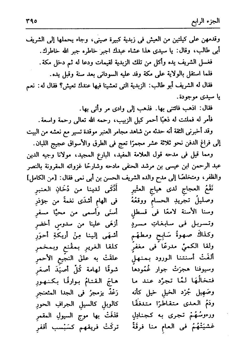 وقدمهن على كيلتين من الْعَيْش فِي زبدية كَبِيرَة صيني وَجَاء يحملهَا إِلَى الشريف أبي طَالب وَقَالَ يَا سَيِّدي هَذَا عشَاء عَبدك اجبر خاطره جبر الله خاطرك فَغسل الشريف يَده وَأكل من تِلْكَ الزبدية لقيمات ودعا لَهُ ثمَّ دخل مَكَّة فَلَمَّا اسْتَقل بِالْولَايَةِ على مَكَّة وَفد عَلَيْهِ السوداني بعد سنة وَقبل يَده فَقَالَ لَهُ الشريف أَبُو طَالب الزبدية الَّتِي تعشينا فِيهَا عنْدك تعيش فَقَالَ لَهُ نعم يَا سَيِّدي مَوْجُودَة فَقَالَ اذْهَبْ فائتني بهَا فَذهب إِلَى وَادي مر وأتى بهَا فَأمر لَهُ فملئت لَهُ ذَهَبا أَحْمَر كيل الزَّبِيب رَحمَه الله تَعَالَى رَحْمَة وَاسِعَة وَقد أَخْبرنِي الثِّقَة أَنه حَدثهُ من شَاهد مجامر العنبر موقدة تسير مَعَ نعشه من الْبَيْت إِلَى فرَاغ الدّفن نَحْو ثَلَاثَة عشر مجمرا تعج فى الطَّرِيق والأسواق عجيج اللبان وَمِمَّا قيل فِي مدحه قَول الْعَلامَة الْمُفِيد البارع الْمجِيد مَوْلَانَا وجيه الدّين عبد الرَّحْمَن ابْن عِيسَى بن مرشد الْحَنَفِيّ مادحه وشارحاً غَزَوَاته المقرونة بالنصر وَالظفر ومتخلصاً إِلَى مدح وَالِده الشريف الْحسن بن أبي نمي فَقَالَ // (من الْكَامِل) //