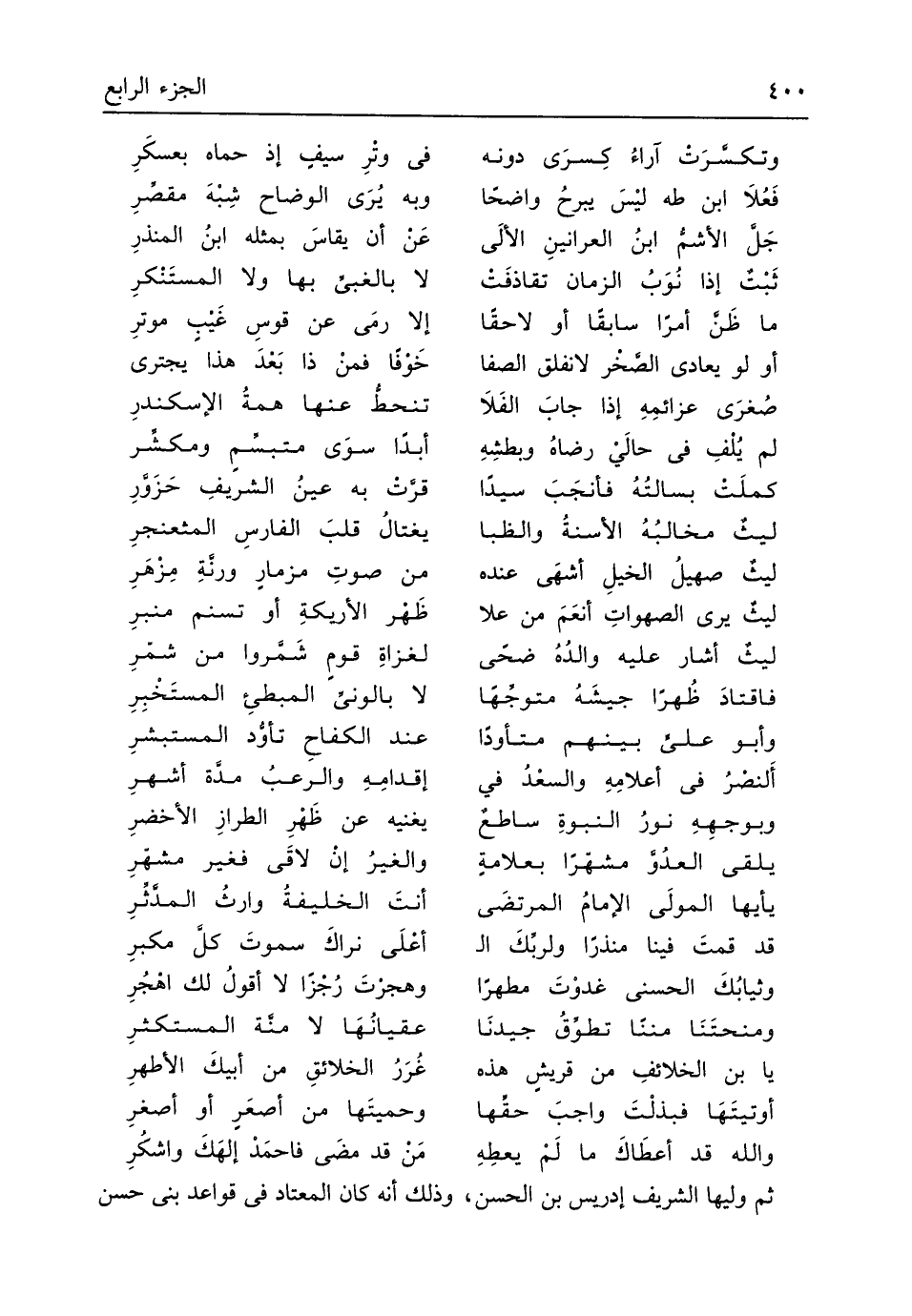 ثمَّ وَليهَا الشريف إِدْرِيس بن الْحسن وَذَلِكَ أَنه كَانَ الْمُعْتَاد فِي قَوَاعِد بني حسن