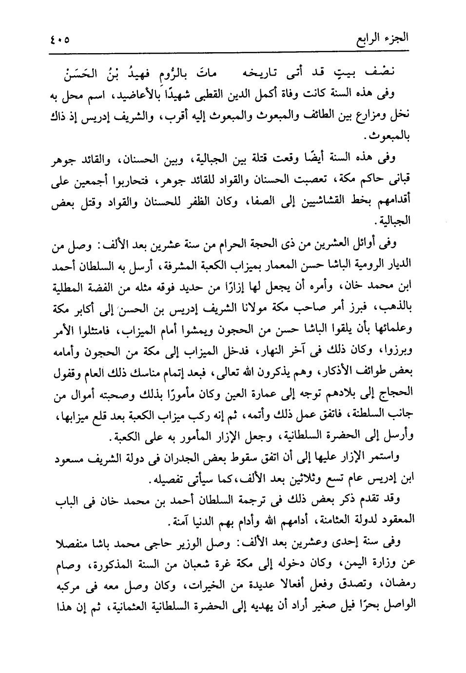 وَفِي هَذِه السّنة كَانَت وَفَاة أكمل الدّين القطبي شَهِيدا بالأعاضيد اسْم مَحل بِهِ نخل ومزارع بَين الطَّائِف والمبعوث والمبعوث إِلَيْهِ أقرب والشريف إِدْرِيس إِذا ذَاك بالمبعوث وَفِي هَذِه السّنة أَيْضا وَقعت قتلة بَين الجبالية وَبَين الحسنان والقائد جَوْهَر قباني حَاكم مَكَّة تعصبت الحسنان والقواد للقائد جَوْهَر فتحاربوا أَجْمَعِينَ على أَقْدَامهم بِخَط القشاشيين إِلَى الصَّفَا وَكَانَ الظفر للحسنان والقواد وَقتل بعض الجبالية وَفِي أَوَائِل الْعشْرين من ذِي الْحجَّة الْحَرَام من سنة عشْرين بعد الْألف وصل من الديار الرومية الباشا حسن المعمار بميزاب الْكَعْبَة المشرفة أرسل بِهِ السُّلْطَان أَحْمد ابْن مُحَمَّد خَان وَأمره أَن يَجْعَل لَهَا إزاراً من حَدِيد فَوْقه مثله من الْفضة المطلية بِالذَّهَب فبرز أَمر صَاحب مَكَّة مَوْلَانَا الشريف إِدْرِيس بن الْحسن إِلَى أكَابِر مَكَّة وعلمائها بِأَن يلْقوا الباشا حسن من الْحجُون ويمشوا أَمَام الْمِيزَاب فامتثلوا الْأَمر وبرزوا وَكَانَ ذَلِك فِي آخر النَّهَار فَدخل الْمِيزَاب إِلَى مَكَّة من الْحجُون وأمامه بعض طوائف الْأَذْكَار وهم يذكرُونَ الله تَعَالَى فَبعد إتْمَام مَنَاسِك ذَلِك الْعَام وقفول الْحجَّاج إِلَى بِلَادهمْ توجه إِلَى عمَارَة الْعين وَكَانَ مَأْمُورا بذلك وصحبته أَمْوَال من جَانب السلطنة فاتفق عمل ذَلِك وأتمه ثمَّ إِنَّه ركب ميزاب الْكَعْبَة بعد قلع ميزابها وَأرْسل إِلَى الحضرة السُّلْطَانِيَّة وَجعل الْإِزَار الْمَأْمُور بِهِ على الْكَعْبَة وَاسْتمرّ الْإِزَار عَلَيْهَا إِلَى أَن اتّفق سُقُوط بعض الجدران فِي دولة الشريف مَسْعُود ابْن إِدْرِيس عَام تسع وَثَلَاثِينَ بعد الْألف كَمَا سَيَأْتِي تَفْصِيله وَقد تقدم ذكر بعض ذَلِك فِي تَرْجَمَة السُّلْطَان أَحْمد بن مُحَمَّد خَان فِي الْبَاب الْمَعْقُود لدولة العثامنة أدامهم الله وأدام بهم الدُّنْيَا آمِنَة وَفِي سنة إِحْدَى وَعشْرين بعد الْألف وصل الْوَزير حاجي مُحَمَّد باشا مُنْفَصِلا عَن وزارة الْيمن وَكَانَ دُخُوله إِلَى مَكَّة غرَّة شعْبَان من السّنة الْمَذْكُورَة وَصَامَ رَمَضَان وَتصدق وَفعل أفعالاً عديدة من الْخيرَات وَكَانَ وصل مَعَه فِي مركبه الْوَاصِل بحراً فيل صَغِير أَرَادَ أَن يهديه إِلَى الحضرة السُّلْطَانِيَّة العثمانية ثمَّ إِن هَذَا