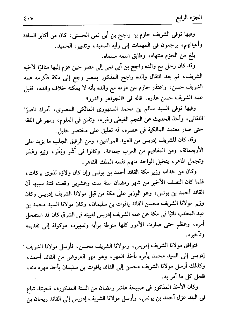 وفيهَا توفّي الشريف حَازِم بن رَاجِح بن أبي نمي الحسني كَانَ من أكَابِر السَّادة وأعيانهم يرجعُونَ فِي الْمُهِمَّات إِلَى رَأْيه السعيد وتدبيره الحميد بلغ من الحزم منتهاه وطابق اسْمه مُسَمَّاهُ وَقد كَانَ رَحل مَعَ وَالِده رَاجِح بن أبي نمي إِلَى مصر حِين عزم إِلَيْهَا منافراً لِأَخِيهِ الشريف ثمَّ بعد انْتِقَال وَالِده رَاجِح الْمَذْكُور بِمصْر رَجَعَ إِلَى مَكَّة فَأكْرمه عَمه الشريف حسن وَاعْتذر حَازِم عَن عزمه مَعَ وَالِده بِأَنَّهُ لَا يُمكنهُ خلاف وَالِده فَقبل عَمه الشريف حسن عذره قَالَه فِي الْجَوَاهِر والدرر وفيهَا توفّي السَّيِّد سَالم بن مُحَمَّد السنهوري الْمَالِكِي الْمصْرِيّ أدْرك ناصراً اللَّقَّانِيّ وَأخذ الحَدِيث عَن النَّجْم الغيطي وَغَيره وتفنن فِي الْعُلُوم وَمهر فِي الْفِقْه حتىّ صَار مُعْتَمد الْمَالِكِيَّة فِي عصره لَهُ تَعْلِيق على مُخْتَصر خَلِيل وَقد كَانَ للشريف إِدْرِيس من العبيد المولدين وَمن الرَّقِيق الجلب مَا يزِيد على الأربعمائة وَمن المقاديم من الْعَرَب جمَاعَة وَكَانُوا فِي أَشَر وبَطَر وتِيهٍ وعَسَر وتجمل ظَاهر يتخيل الْوَاحِد مِنْهُم نَفسه الْملك القاهر وَكَانَ من خُدَّامه وَزِير مَكَّة الْقَائِد أَحْمد بن يُونُس وَإِن كَانَ وَلَاؤُه لِذَوي بَرَكَات فَلَمَّا كَانَ النّصْف الْأَخير من شهر رَمَضَان سنة سِتّ وَعشْرين وَقعت فتْنَة سَببهَا أَن الْقَائِد أَحْمد بن يُونُس وَهُوَ الْوَزير على مَكَّة من قبل مَوْلَانَا الشريف إِدْرِيس وَكَانَ وَزِير مَوْلَانَا الشريف محسن الْقَائِد ياقوت بن سُلَيْمَان وَكَانَ مَوْلَانَا السَّيِّد مُحَمَّد بن عبد الْمطلب نَائِبا فِي مَكَّة عَن عَمه الشريف إِدْرِيس لغيبته فى الشرق كَانَ قد استفحل أمره وَعظم حَتَّى صَارَت الْأُمُور كلهَا منوطة بِرَأْيهِ وتدبيره موكولة إِلَى تَقْدِيمه وتأخيره فتوافق مَوْلَانَا الشريف إِدْرِيس ومولانا الشريف محسن فَأرْسل مَوْلَانَا الشريف إِدْرِيس إِلَى السَّيِّد مُحَمَّد يَأْمُرهُ بِأخذ الْمهْر وَهُوَ مهر الْعرُوض من الْقَائِد أَحْمد وَكَذَلِكَ أرسل مَوْلَانَا الشريف محسن إِلَى الْقَائِد ياقوت بن سُلَيْمَان بِأخذ مهره مِنْهُ فَفعل كل مَا أَمر بِهِ وَكَانَ الْأَخْذ الْمَذْكُور فِي صَبِيحَة عَاشر رَمَضَان من السّنة الْمَذْكُورَة فَحِينَئِذٍ شاع فِي الْبَلَد عزل أَحْمد بن يُونُس وَأرْسل مَوْلَانَا الشريف إِدْرِيس إِلَى الْقَائِد ريحَان بن