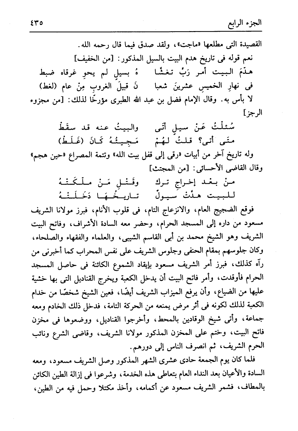 القصيدة الَّتِي مطْلعهَا ماجت وَلَقَد صدق فِيمَا قَالَ رَحمَه الله نعم قَوْله فِي تَارِيخ هدم الْبَيْت بالسيل الْمَذْكُور // (من الْخَفِيف) //