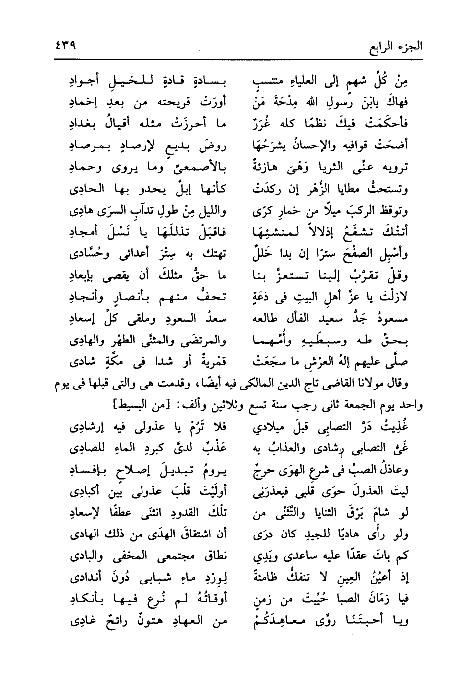 وَقَالَ مَوْلَانَا القَاضِي تَاج الدّين الْمَالِكِي فِيهِ أَيْضا وقدمت هِيَ والتى قبلهَا فِي يَوْم وَاحِد يَوْم الْجُمُعَة ثَانِي رَجَب سنة تسع وَثَلَاثِينَ وَألف // (من الْبَسِيط) //
