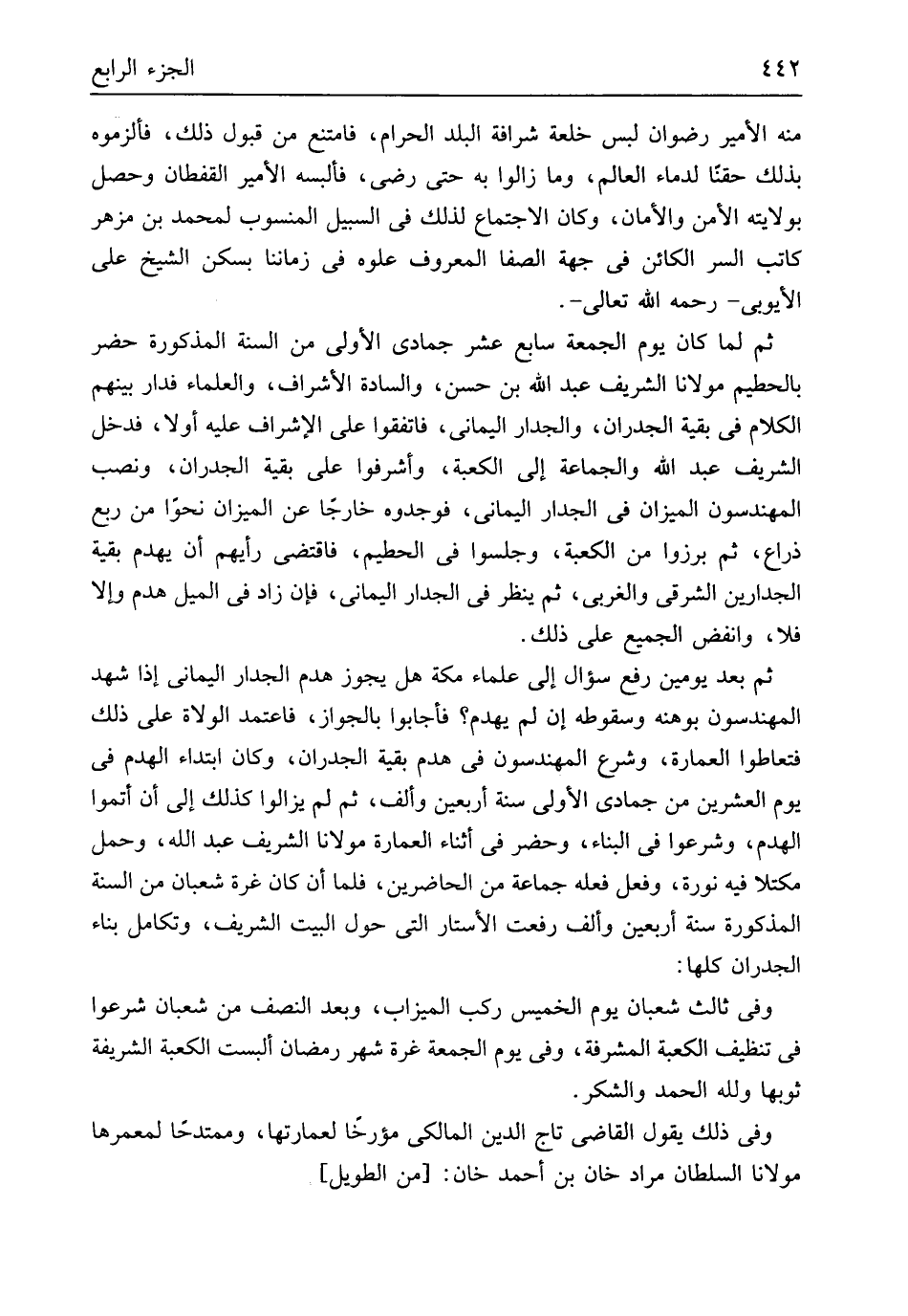 مِنْهُ الْأَمِير رضوَان لبس خلعة شرافة الْبَلَد الْحَرَام فَامْتنعَ من قبُول ذَلِك فألزموه بذلك حَقنا لدماء الْعَالم وَمَا زَالُوا بِهِ حَتَّى رَضِي فألبسه الْأَمِير القفطان وَحصل بولايته الْأَمْن والأمان وَكَانَ الِاجْتِمَاع لذَلِك فى السَّبِيل المسنوب لمُحَمد بن مزهر كَاتب السِّرّ الْكَائِن فِي جِهَة الصَّفَا الْمَعْرُوف علوه فِي زَمَاننَا بسكن الشَّيْخ عَليّ الأيوبي رَحمَه الله تَعَالَى ثمَّ لما كَانَ يَوْم الْجُمُعَة سَابِع عشر جُمَادَى الأولى من السّنة الْمَذْكُورَة حضر بِالْحَطِيمِ مَوْلَانَا الشريف عبد الله بن حسن والساده الْأَشْرَاف وَالْعُلَمَاء فدار بَينهم الْكَلَام فِي بَقِيَّة الجدران والجدار الْيَمَانِيّ فاتفقوا على الإشراف عَلَيْهِ أَولا فَدخل الشريف عبد الله وَالْجَمَاعَة إِلَى الْكَعْبَة وأشرفوا على بَقِيَّة الجدران وَنصب المهندسون الْمِيزَان فِي الْجِدَار الْيَمَانِيّ فوجدوه خَارِجا عَن الْمِيزَان نَحوا من ربع ذِرَاع ثمَّ برزوا من الْكَعْبَة وجلسوا فِي الْحطيم فَاقْتضى رَأْيهمْ أَن يهدم بَقِيَّة الجدارين الشَّرْقِي والغربي ثمَّ ينظر فِي الْجِدَار الْيَمَانِيّ فَإِن زَاد فِي الْميل هدم وَإِلَّا فَلَا وانفض الْجَمِيع على ذَلِك ثمَّ بعد يَوْمَيْنِ رفع سُؤال إِلَى عُلَمَاء مَكَّة هَل بجوز هدم الْجِدَار الْيَمَانِيّ إِذا شهد المهندسون بوهنه وسقوطه إِن لم يهدم فَأَجَابُوا بِالْجَوَازِ فاعتمد الْوُلَاة على ذَلِك فتعاطوا الْعِمَارَة وَشرع المهندسون فِي هدم بَقِيَّة الجدران وَكَانَ ابْتِدَاء الْهدم فِي يَوْم الْعشْرين من جُمَادَى الأولى سنة أَرْبَعِينَ وَألف ثمَّ لم يزَالُوا كَذَلِك إِلَى أَن أَتموا الْهدم وشرعوا فِي الْبناء وَحضر فِي أثْنَاء الْعِمَارَة مَوْلَانَا الشريف عبد الله وَحمل مكتلاً فِيهِ نورة وَفعل فعله جمَاعَة من الْحَاضِرين فَلَمَّا أَن كَانَ غرَّة شعْبَان من السّنة الْمَذْكُورَة سنة أَرْبَعِينَ وَألف رفعت الأستار الَّتِي حول الْبَيْت الشريف وتكامل بِنَاء الجدران كلهَا وَفِي ثَالِث شعْبَان يَوْم الْخَمِيس ركب الْمِيزَاب وَبعد النّصْف من شعْبَان شرعوا فِي تنظيف الْكَعْبَة المشرفة وَفِي يَوْم الْجُمُعَة غرَّة شهر رَمَضَان ألبست الْكَعْبَة الشَّرِيفَة ثوبها وَللَّه الْحَمد وَالشُّكْر وَفِي ذَلِك يَقُول القَاضِي تَاج الدّين الْمَالِكِي مؤرخاً لعمارتها وممتدحاً لمعمرها مَوْلَانَا السُّلْطَان مُرَاد خَان بن أَحْمد خَان // (من الطَّوِيل) //