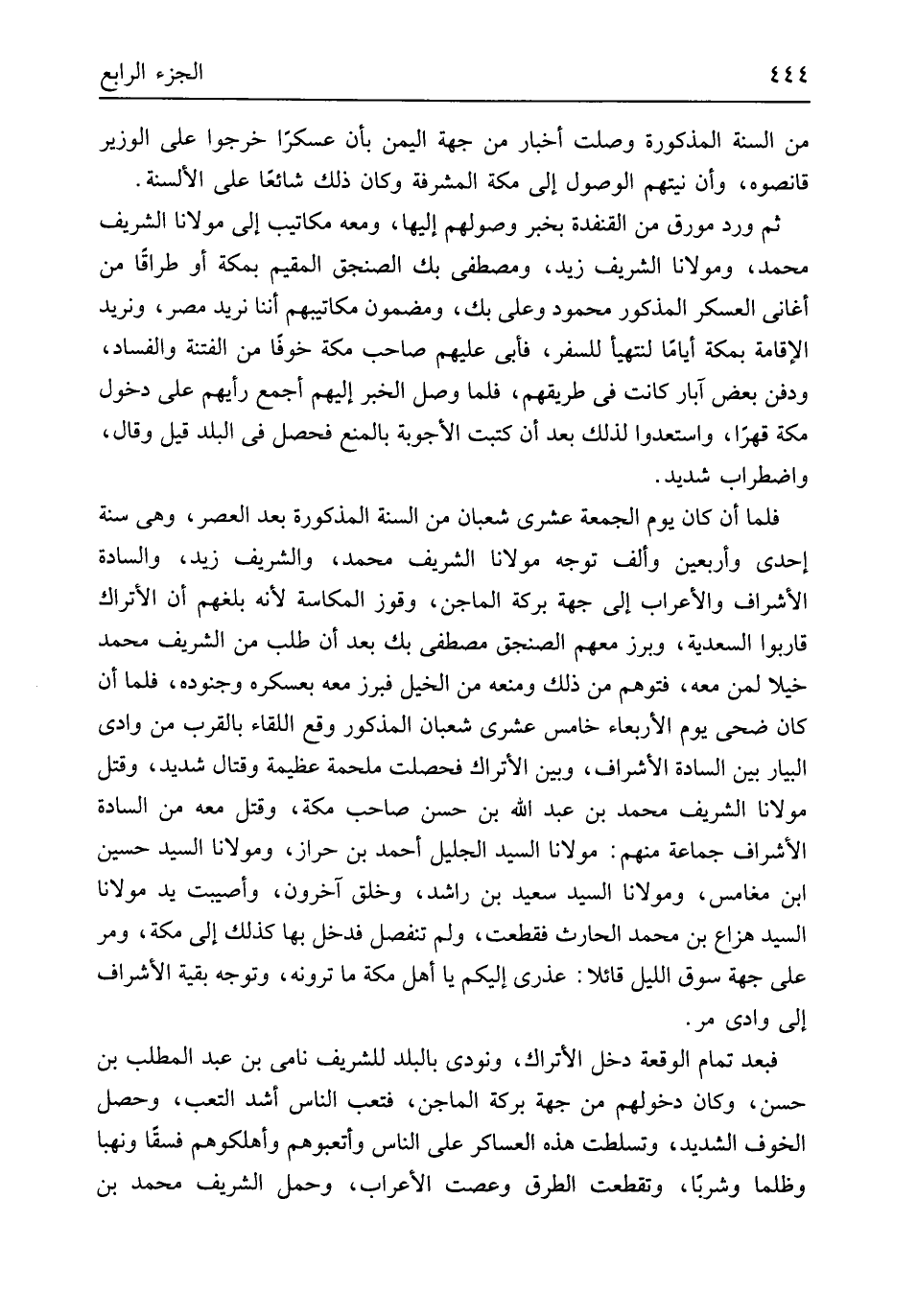 من السّنة الْمَذْكُورَة وصلت أَخْبَار من جِهَة الْيمن بِأَن عسكراً خَرجُوا على الْوَزير قانصوه وَأَن نيتهم الْوُصُول إِلَى مَكَّة المشرفة وَكَانَ ذَلِك شَائِعا على الْأَلْسِنَة ثمَّ ورد مُورق من القنفدة بِخَبَر وصولهم إِلَيْهَا وَمَعَهُ مكاتيب إِلَى مَوْلَانَا الشريف مُحَمَّد ومولانا الشريف زيد ومصطفى بك الصنجق الْمُقِيم بِمَكَّة أَو طراقاً من أغاني الْعَسْكَر الْمَذْكُور مَحْمُود وَعلي بك ومضمون مكاتيبهم أننا نُرِيد مصر ونريد الْإِقَامَة بِمَكَّة أَيَّامًا لنتهيأ للسَّفر فَأبى عَلَيْهِم صَاحب مَكَّة خوفًا من الْفِتْنَة وَالْفساد وَدفن بعض آبار كَانَت فِي طريقهم فَلَمَّا وصل الْخَبَر إِلَيْهِم أجمع رآيهم على دُخُول مَكَّة قهرا واستعدوا لذَلِك بعد أَن كتبت الْأَجْوِبَة بِالْمَنْعِ فَحصل فِي الْبَلَد قيل وَقَالَ واضطراب شَدِيد فَلَمَّا أَن كَانَ يَوْم الْجُمُعَة عشري شعْبَان من السّنة الْمَذْكُورَة بعد الْعَصْر وَهِي سنة إِحْدَى وَأَرْبَعين وَألف توجه مَوْلَانَا الشريف مُحَمَّد والشريف زيد والسادة الْأَشْرَاف والأعراب إِلَى جِهَة بركَة الماجن وقوز المكاسة لِأَنَّهُ بَلغهُمْ أَن الأتراك قاربوا السعدية وبرز مَعَهم الصنجق مصطفى بك بعد أَن طلب من الشريف مُحَمَّد خيلاً لمن مَعَه فَتوهم من ذَلِك وَمنعه من الْخَيل فبرز مَعَه بعسكره وَجُنُوده فَلَمَّا أَن كَانَ ضحى يَوْم الْأَرْبَعَاء خَامِس عشري شعْبَان الْمَذْكُور وَقع اللِّقَاء بِالْقربِ من وَادي البيار بَين السَّادة الْأَشْرَاف وَبَين الأتراك فحصلت ملحمة عَظِيمَة وقتال شَدِيد وَقتل مَوْلَانَا الشريف مُحَمَّد بن عبد الله بن حسن صَاحب مَكَّة وَقتل مَعَه من السَّادة الْأَشْرَاف جمَاعَة مِنْهُم مَوْلَانَا السَّيِّد الْجَلِيل أَحْمد بن حراز ومولانا السَّيِّد حُسَيْن ابْن مغامس ومولانا السَّيِّد سعيد بن رَاشد وَخلق آخَرُونَ وَأُصِيبَتْ يَد مَوْلَانَا السَّيِّد هزاع بن مُحَمَّد الْحَارِث فَقطعت وَلم تنفصل فَدخل بهَا كَذَلِك إِلَى مَكَّة وَمر على جِهَة سوق اللَّيْل قَائِلا عُذْري إِلَيْكُم يَا أهل مَكَّة مَا تَرَوْنَهُ وَتوجه بَقِيَّة الْأَشْرَاف إِلَى وَادي مر فَبعد تَمام الْوَقْعَة دخل الأتراك وَنُودِيَ بِالْبَلَدِ للشريف نامي بن عبد الْمطلب بن حسن وَكَانَ دُخُولهمْ من جِهَة بركَة الماجن فتعب النَّاس أَشد التَّعَب وَحصل الْخَوْف الشَّديد وتسلطت هَذِه العساكر على النَّاس وأتعبوهم وأهلكوهم فسقاً ونهباً وظلماً وشرباً وتقطعت الطّرق وعصت الْأَعْرَاب وَحمل الشريف مُحَمَّد بن