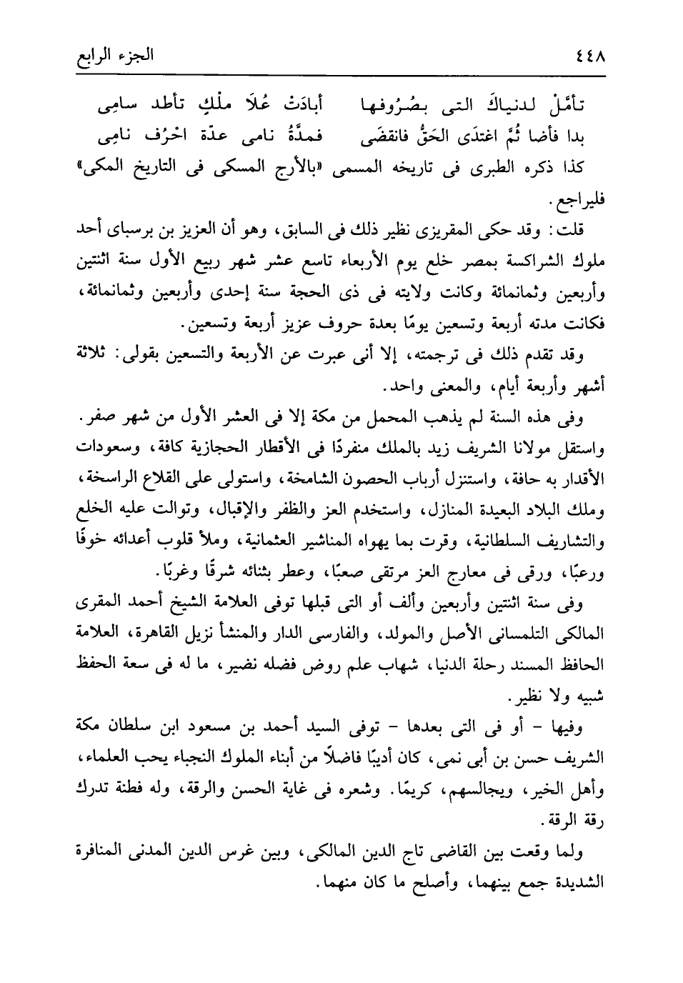 كَذَا ذكره الطبرى فِي تَارِيخه الْمُسَمّى بالأرج المسكى فِي التَّارِيخ الْمَكِّيّ فَليُرَاجع قلت وَقد حكى المقريزي نَظِير ذَلِك فِي السَّابِق وَهُوَ أَن الْعَزِيز بن برسباي أحد مُلُوك الشراكسة بِمصْر خلع يَوْم الْأَرْبَعَاء تَاسِع عشر شهر ربيع الأول سنة اثْنَتَيْنِ وَأَرْبَعين وَثَمَانمِائَة وَكَانَت ولَايَته فى ذى الْحجَّة سنة إِحْدَى وَأَرْبَعين وَثَمَانمِائَة فَكَانَت مدَّته أَرْبَعَة وَتِسْعين يَوْمًا بعدة حُرُوف عَزِيز أَرْبَعَة وَتِسْعين وَقد تقدم ذَلِك فِي تَرْجَمته إِلَّا إِنِّي عبرت عَن الْأَرْبَعَة وَالتسْعين بِقَوْلِي ثَلَاثَة أشهر وَأَرْبَعَة أَيَّام الْمَعْنى وَاحِد وَفِي هَذِه السّنة لم يذهب الْمحمل من مَكَّة إِلَّا فِي الْعشْر الأول من شهر صفر واستقل مَوْلَانَا الشريف زيد بِالْملكِ مُنْفَردا فِي الأقطار الحجازية كَافَّة وسعودات الأقدار بِهِ حافة واستنزل أَرْبَاب الْحُصُون الشامخة وَاسْتولى على القلاع الراسخة وَملك الْبِلَاد الْبَعِيدَة الْمنَازل واستخدم الْعِزّ وَالظفر والإقبال وتوالت عَلَيْهِ الْخلْع والتشاريف السُّلْطَانِيَّة وقرت بِمَا يهواه المناشير العثمانية وملأ قُلُوب أعدائه خوفًا ورعباً ورقى فِي معارج الْمعز مرتقى صعباً وعطر بثنائه شرقاً وغرباً وَفِي سنة اثْنَتَيْنِ وَأَرْبَعين وَألف أَو الَّتِي قبلهَا توفّي الْعَلامَة الشَّيْخ أَحْمد الْمقري الْمَالِكِي التلمساني الأَصْل والمولد والفارسي الدَّار والمنشأ نزيل الْقَاهِرَة الْعَلامَة الْحَافِظ الْمسند رحْلَة الدُّنْيَا شهَاب علم روض فَضله نضير مَا لَهُ فِي سَعَة الْحِفْظ شَبيه وَلَا نَظِير وفيهَا أَو فِي الَّتِي بعْدهَا توفّي السَّيِّد أَحْمد بن مَسْعُود ابْن سُلْطَان مَكَّة الشريف حسن بن أبي نمي كَانَ أديباً فَاضلا من أَبنَاء الْمُلُوك النجباء يحب الْعلمَاء وَأهل الْخَيْر ويجالسهم كَرِيمًا وشعره فِي غَايَة الْحسن والرقة وَله فطنة تدْرك رقة الرقة وَلما وَقعت بَين القَاضِي تَاج الدّين الْمَالِكِي وَبَين غرس الدّين الْمدنِي المنافرة الشَّدِيدَة جمع بَينهمَا وَأصْلح مَا كَانَ مِنْهُمَا