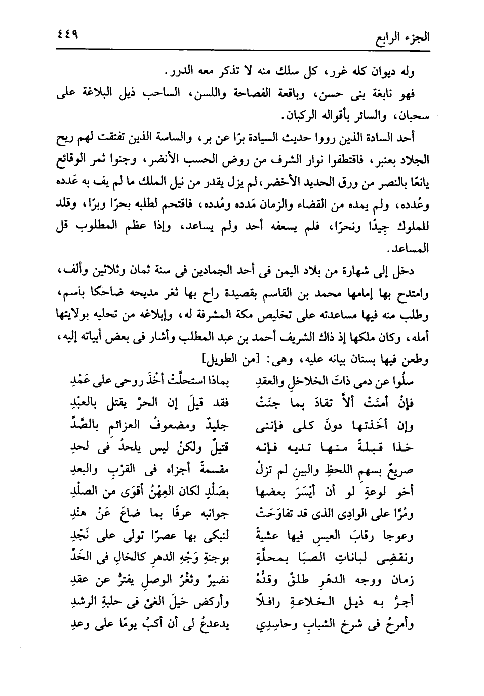 وَله ديوَان كُله غرر كل سلك مِنْهُ لَا تذكر مَعَه الدُّرَر فَهُوَ نَابِغَة بني حسن وباقعة الفصاحة واللسن الساحب ذيل البلاغة على سحبان والسائر بأقواله الركْبَان أحد السَّادة الَّذين رووا حَدِيث السِّيَادَة برا عَن بر والساسة الَّذين تفتقت لَهُم ريح الجلاد بعنبر فاقتطفوا نوار الشّرف من روض الْحسب الأنضر وجنوا ثَمَر الوقائع يانعاً بالنصر من ورق الْحَدِيد الْأَخْضَر لم يزل يقدر من نيل الْملك مَا لم يَفِ بِهِ عَدده وعُدده وَلم يمده من الْقَضَاء وَالزَّمَان مَدده ومُدده فاقتحم لطلبه بحراً وَبرا وقلد للملوك جِيداً ونحراً فَلم يسعفه أحد وَلم يساعد وَإِذا عظم الْمَطْلُوب قل المساعد دخل إِلَى شهارة من بِلَاد الْيمن فِي أحد الجمادين فِي سنة ثَمَان وَثَلَاثِينَ وَألف وامتدح بهَا إمامها مُحَمَّد بن الْقَاسِم بقصيدة رَاح بهَا ثغر مديحه ضَاحِكا باسم وَطلب مِنْهُ فِيهَا مساعدته على تَخْلِيص مَكَّة المشرفة لَهُ وإبلاغه من تحليه بولايتها أمله وَكَانَ ملكهَا إِذْ ذَاك الشريف أَحْمد بن عبد الْمطلب وَأَشَارَ فِي بعض أبياته إِلَيْهِ وَطعن فِيهَا بسنان بَيَانه عَلَيْهِ وَهِي // (من الطَّوِيل) //