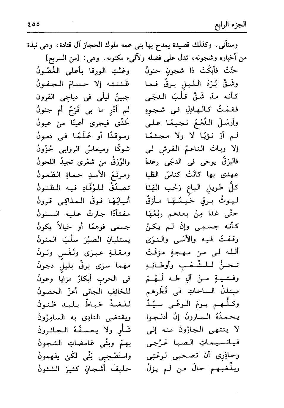 وَسَتَأْتِي وَكَذَلِكَ قصيدة يمدح بهَا بني عَمه مُلُوك الْحجاز آل قَتَادَة وَهِي نبذة من أخباره وشجونه تدل على فَضله ولآلىء مكنونه وَهِي // (من السَّرِيع)