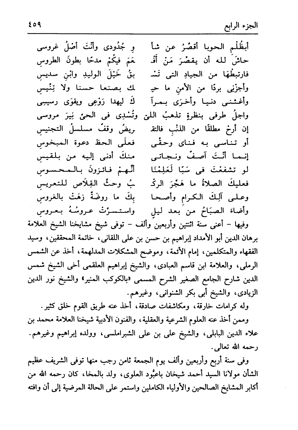 وفيهَا أَعنِي سنة اثْنَتَيْنِ وَأَرْبَعين وَألف توفّي شيخ مَشَايِخنَا الشَّيْخ الْعَلامَة برهَان الدّين أَبُو الأمداد إِبْرَاهِيم بن حسن بن عَليّ اللَّقَّانِيّ خَاتِمَة الْمُحَقِّقين وَسيد الْفُقَهَاء والمتكلمين إِمَام الْأَئِمَّة وموضح المشكلات المدلهمة أَخذ عَن الشَّمْس الرَّمْلِيّ والعلامة ابْن قَاسم العبادى وَالشَّيْخ إِبْرَاهِيم العلقمي أخي الشَّيْخ شمس الدّين شَارِح الْجَامِع الصَّغِير الشَّرْح الْمُسَمّى بالكوكب الْمُنِير وَالشَّيْخ نور الدّين الزيادى وَالشَّيْخ أَبى بكر الشنواني وَغَيرهم وَله كرامات خارقة ومكاشفات صَادِقَة أَخذ عَنهُ طَرِيق الْقَوْم خلق كثير وَمِمَّنْ أَخذ عَنهُ الْعُلُوم الشَّرْعِيَّة والعقلية والفنون الأدبية شَيخنَا الْعَلامَة مُحَمَّد بن عَلَاء الدّين البابلي وَالشَّيْخ عَليّ بن عَليّ الشبراملسي وَولده إِبْرَاهِيم وَغَيرهم رَحمَه الله تَعَالَى وَفِي سنة أَربع وَأَرْبَعين وَألف يَوْم الْجُمُعَة ثامن رَجَب مِنْهَا توفّي الشريف عَظِيم الشَّأْن مَوْلَانَا السَّيِّد أَحْمد شَيْخَانِ باعبود الْعلوِي ولد بالمخا كَانَ رَحمَه الله من أكَابِر الْمَشَايِخ الصَّالِحين والأولياء الكاملين وَاسْتمرّ على الْحَالة المرضية إِلَى أَن وافته