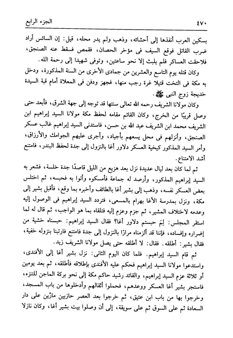 وَكَانَ مَوْلَانَا الشريف رَحمَه الله تَعَالَى سنتها قد توجه إِلَى جِهَة الشرق فأبعد حَتَّى وصل قَرِيبا من الخرج وَكَانَ الْقَائِم مقَامه لحفظ مَكَّة مَوْلَانَا السَّيِّد إِبْرَاهِيم ابْن الشريف مُحَمَّد ابْن الشريف عبد الله بن حسن فاستدنى السَّيِّد إِبْرَاهِيم غَالب عَسْكَر الصنجق وأنزلهم فِي مَحل يسعهم بأجياد وأجرى عَلَيْهِم الجوامك والأرزاق وَأمر السَّيِّد الْمَذْكُور كيخية الْعَسْكَر دلاور أغا بالنزول إِلَى جدة لحفظ البندر فَامْتنعَ أَشد الِامْتِنَاع ثمَّ لما كَانَ بعد لَيَال عديدة نزل بعد هزيع من اللَّيْل قَاصِدا جدة خلسة فشعر بِهِ السَّيِّد إِبْرَاهِيم الْمَذْكُور وأرصد لَهُ جمَاعَة فأمسكوه وَأتوا بِهِ فحبسه ثمَّ اختلس بعض الْعَسْكَر نَفسه وَذهب إِلَى بشير أغا بشير أغا بِالطَّائِف وَأخْبرهُ بِمَا وَقع فَأقبل بشير إِلَى مَكَّة وَنزل بمدرسة الأغا بهْرَام بالمسعى فتردد السَّيِّد إِبْرَاهِيم فِي الْوُصُول إِلَيْهِ وَعَدَمه لاخْتِلَاف المشير ثمَّ جزم وعزم إِلَيْهِ فَتَلقاهُ بِمَا هُوَ الْوَاجِب ثمَّ قَالَ لَهُ لما اسْتَقر الْمجْلس لِمَ حبستم دلاور آغا فَقَالَ السَّيِّد إِبْرَاهِيم حبسناه خشيَة من إضراره وإفساده فإننا قد ألزمناه مرَارًا بالنزول إِلَى جدة فَامْتنعَ فارتينا بنزوله خُفْيَة فَقَالَ بشير أطلقهُ فَقَالَ لَا أطلقهُ حَتَّى يصل مَوْلَانَا الشريف زيد ثمَّ قَامَ السَّيِّد إِبْرَاهِيم فَلَمَّا كَانَ الْيَوْم الثَّانِي نزل بشير أغا إِلَى الأفندي واستدعوا مَوْلَانَا السَّيِّد إِبْرَاهِيم فَحكم عَلَيْهِ الأفندي بِإِطْلَاقِهِ فَأَطْلقهُ ثمَّ بعد يَوْمَيْنِ أَو ثَلَاثَة عزم السَّيِّد إِبْرَاهِيم والقائد رشيد حَاكم مَكَّة إِلَى نَحْو بركَة الماجن للتنزه فاستجر بشير أغا الْعَسْكَر وَوَعدهمْ فحملوا أثقالهم وأدخلوها من بَاب الْمَسْجِد وَخَرجُوا بهَا من بَاب ابْن عَتيق ثمَّ خَرجُوا بعد الْعَصْر حازبين مارين على دَار السَّعَادَة ثمَّ على السُّوق ثمَّ على سويقة إِلَى أَن وصلوا بَيت بشير أغا وَكَانَ نازلا