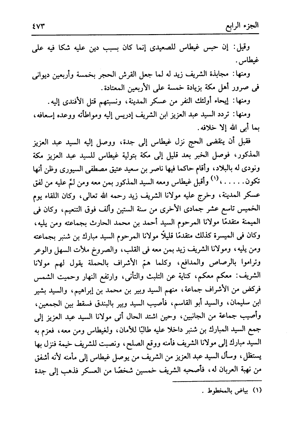 4 - وَقيل إِن حبس غيطاس للصعيدي إِنَّمَا كَانَ بِسَبَب دين عَلَيْهِ شكا فِيهِ على غيطاس وَمِنْهَا مجابذة الشريف زيد لَهُ لما جعل القرش الْحجر بِخَمْسَة وَأَرْبَعين ديواني فِي صرور أهل مَكَّة بِزِيَادَة خَمْسَة على الْأَرْبَعين الْمُعْتَادَة وَمِنْهَا إيحاء أُولَئِكَ النَّفر من عَسْكَر الْمَدِينَة ونسبتهم قتل الأفندي إِلَيْهِ وَمِنْهَا تردد السَّيِّد عبد الْعَزِيز ابْن الشريف إِدْرِيس إِلَيْهِ ومواطأته ووعده إسعافه بِمَا أَبى الله إِلَّا خِلَافه فَقبل أَن يَنْقَضِي الْحَج نزل غيطاس إِلَى جدة وَوصل إِلَيْهِ السَّيِّد عبد الْعَزِيز الْمَذْكُور فوصل الْخَبَر بعد قَلِيل إِلَى مَكَّة بتولية غيطاس للسَّيِّد عبد الْعَزِيز مَكَّة وَنُودِيَ لَهُ بالبلاد وَأقَام حَاكما فِيهَا نَاصِر بن سعيد عَتيق مصطفى السيوري وَظن أَنَّهَا تكون وَأَقْبل غيطاس وَمَعَهُ السَّيِّد الْمَذْكُور بِمن مَعَه وَمن لمَّ عَلَيْهِ من لفق عَسْكَر الْمَدِينَة وَخرج عَلَيْهِ مَوْلَانَا الشريف زيد رَحمَه الله تَعَالَى وَكَانَ اللِّقَاء يَوْم الْخَمِيس تَاسِع عشر جُمَادَى الْأُخْرَى من سنة السِّتين وَألف فَوق التَّنْعِيم وَكَانَ فِي الميمنة مُتَقَدما مَوْلَانَا المرحوم السَّيِّد أَحْمد بن مُحَمَّد الْحَارِث بجماعته وَمن يَلِيهِ وَكَانَ فِي الميسرة كَذَلِك مُتَقَدما قَلِيلا مَوْلَانَا المورحوم السَّيِّد مبارك بن شنبر بجماعته وَمن يَلِيهِ ومولانا الشريف زيد بِمن مَعَه فِي الْقلب والصروخ مَلَأت السهل والوعر وتراموا بالرصاص والمدافع وَكلما هم الْأَشْرَاف بالحملة يَقُول لَهُم مَوْلَانَا الشريف مَعكُمْ مَعكُمْ كِنَايَة عَن التلبث والتاني وارتفع النَّهَار وحميت الشَّمْس فركض من الْأَشْرَاف جمَاعَة مِنْهُم السَّيِّد وبير بن مُحَمَّد بن إِبْرَاهِيم وَالسَّيِّد بشير ابْن سُلَيْمَان وَالسَّيِّد أَبُو الْقَاسِم فأصيب السَّيِّد زبير بالبندق فَسقط بَين الجمعين وَأُصِيب جمَاعَة من الْجَانِبَيْنِ وَحين اشْتَدَّ الْحَال أَتَى مَوْلَانَا السَّيِّد عبد الْعَزِيز إِلَى جمع السَّيِّد الْمُبَارك بن شنبر دَاخِلا عَلَيْهِ طَالبا للأمان ولغيطاس وَمن مَعَه فعزم بِهِ السَّيِّد مبارك إِلَى مَوْلَانَا الشريف فَأَمنهُ وَوَقع الصُّلْح ونصبت للشريف حيمة فَنزل بهَا يستظل وَسَأَلَ السَّيِّد عبد الْعَزِيز من الشريف من يُوصل غيطاس إِلَى مأمنه لِأَنَّهُ أشْفق من نهبة العربان لَهُ فأصحبه الشريف خمسين شخصا من الْعَسْكَر فَذهب إِلَى جدة