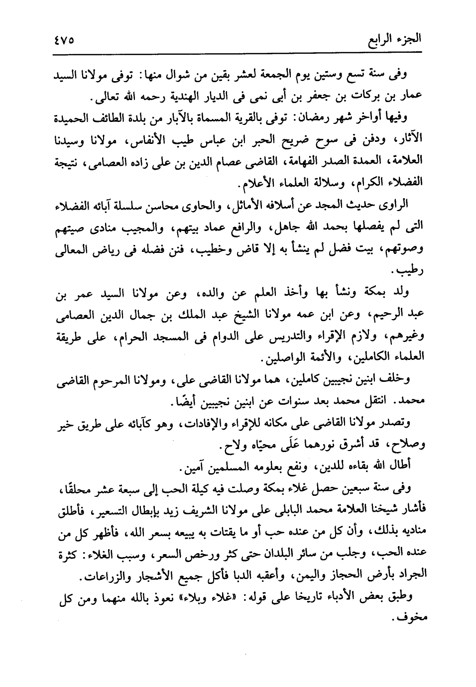 وَفِي سنة تسع وَسِتِّينَ يَوْم الْجُمُعَة لعشر بَقينَ من شَوَّال مِنْهَا توفّي مَوْلَانَا السَّيِّد عمار بن بَرَكَات بن جَعْفَر بن أبي نمي فِي الديار الْهِنْدِيَّة رَحمَه الله تَعَالَى وفيهَا أَوَاخِر شهر رَمَضَان توفّي بالقرية الْمُسَمَّاة بالآبار من بَلْدَة الطَّائِف الحميدة الْآثَار وَدفن فِي سوح ضريح الحبر ابْن عَبَّاس طيب الأنفاس مَوْلَانَا وَسَيِّدنَا الْعَلامَة الْعُمْدَة الصَّدْر الفهامة القَاضِي عِصَام الدّين بن عَليّ زَاده العصامي نتيجة الْفُضَلَاء الْكِرَام وسلالة الْعلمَاء الْأَعْلَام الرَّاوِي حَدِيث الْمجد عَن أسلافه الأماثل وَالْحَاوِي محَاسِن سلسلة آبَائِهِ الْفُضَلَاء الَّتِي لم يفصلها بِحَمْد الله جَاهِل والرافع عماد بَيتهمْ والمجيب منادى صيتهم وصوتهم بَيت فضل لم ينشأ بِهِ إِلَّا قَاض وخطيب فنن فَضله فِي رياض الْمَعَالِي رطيب ولد بِمَكَّة وَنَشَأ بهَا وَأخذ الْعلم عَن وَالِده وَعَن مَوْلَانَا السَّيِّد عمر بن عبد الرَّحِيم وَعَن ابْن عَمه مَوْلَانَا الشَّيْخ عبد الْملك بن جمال الدّين العصامي وَغَيرهم ولازم الإقراء والتدريس على الدَّوَام فِي الْمَسْجِد الْحَرَام على طَريقَة الْعلمَاء الكاملين وَالْأَئِمَّة الواصلين وَخلف ابْنَيْنِ نجيبين كَامِلين هما مَوْلَانَا القَاضِي عَليّ ومولانا المرحوم القَاضِي مُحَمَّد انْتقل مُحَمَّد بعد سنوات عَن ابْنَيْنِ نجيبين أَيْضا وتصدر مَوْلَانَا القَاضِي على مَكَانَهُ للإقراء والإفادات وَهُوَ كآبائه على طَرِيق خير وَصَلَاح قد أشرق نورهما عَلَى محياه ولاح أَطَالَ الله بَقَاءَهُ للدّين ونفع بِعُلُومِهِ الْمُسلمين آمين وَفِي سنة سبعين حصل غلاء بِمَكَّة وصلت فِيهِ كيلة الْحبّ إِلَى سَبْعَة عشر محلقاً فَأَشَارَ شَيخنَا الْعَلامَة مُحَمَّد البابلي على مَوْلَانَا الشريف زيد بِإِبْطَال التسعير فَأطلق مناديه بذلك وَأَن كل من عِنْده حب أَو مَا يقتات بِهِ يَبِيعهُ بِسعْر الله فأظهر كل من عِنْده الْحبّ وجلب من سَائِر الْبلدَانِ حَتَّى كثر وَرخّص السّعر وَسبب الغلاء كَثْرَة الْجَرَاد بِأَرْض الْحجاز واليمن وأعقبه الدبا فَأكل جَمِيع الْأَشْجَار والزراعات وطبق بعض الأدباء تَارِيخا على قَوْله غلاء وبلاء نَعُوذ بِاللَّه مِنْهُمَا وَمن كل مخوف