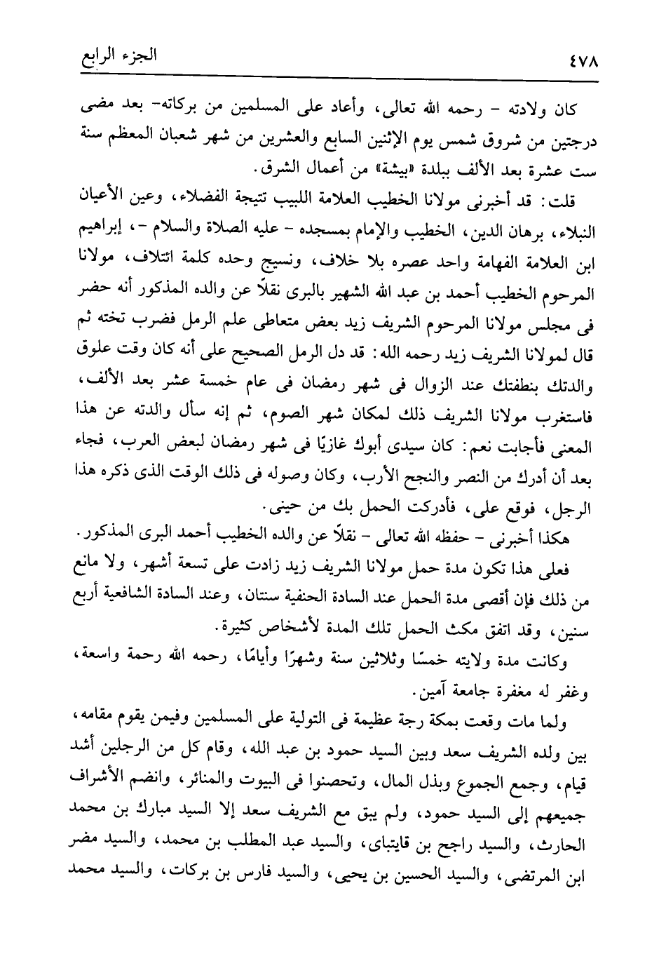 كَانَ وِلَادَته رَحمَه الله تَعَالَى وَأعَاد على الْمُسلمين من بركانه بعد مُضِيّ دَرَجَتَيْنِ من شروق شمس يَوْم الْإِثْنَيْنِ السَّابِع وَالْعِشْرين من شهر شعْبَان الْمُعظم سنة سِتّ عشرَة بعد الْألف ببلدة بيشة من أَعمال الشرق قلت قد أَخْبرنِي مَوْلَانَا الْخَطِيب الْعَلامَة اللبيب تتيجة الْفُضَلَاء وَعين الْأَعْيَان النبلاء برهَان الدّين الْخَطِيب وَالْإِمَام بمسجده عَلَيْهِ الصَّلَاة وَالسَّلَام إِبْرَاهِيم ابْن الْعَلامَة الفهامة وَاحِد عصره بِلَا خلاف ونسيج وَحده كلمة ائتلاف مَوْلَانَا المرحوم الْخَطِيب أَحْمد بن عبد الله الشهير بالبري نقلا عَن وَالِده الْمَذْكُور أَنه حضر فِي مجْلِس مَوْلَانَا المرحوم الشريف زيد بعض متعاطي علم الرمل فَضرب تخته ثمَّ قَالَ لمولانا الشريف زيد رَحمَه الله قد دلّ الرمل الصَّحِيح على أَنه كَانَ وَقت علوق والدتك بنطفتك عِنْد الزَّوَال فِي شهر رَمَضَان فِي عَام خَمْسَة عشر بعد الْألف فاستغرب مَوْلَانَا الشريف ذَلِك لمَكَان شهر الصَّوْم ثمَّ إِنَّه سَأَلَ والدته عَن هَذَا الْمَعْنى فأجابت نعم كَانَ سَيِّدي أَبوك غازياً فِي شهر رَمَضَان لبَعض الْعَرَب فجَاء بعد أَن أدْرك من النَّصْر والنجح الأرب وَكَانَ وُصُوله فِي ذَلِك الْوَقْت الَّذِي ذكره هَذَا الرجل فَوَقع عَليّ فأدركت الْحمل بك من حيني هَكَذَا أَخْبرنِي حفظه الله تَعَالَى نقلا عَن وَالِده الْخَطِيب أَحْمد الْبري الْمَذْكُور فعلى هَذَا تكون مُدَّة حمل مَوْلَانَا الشريف زيد زَادَت على تِسْعَة أشهر وَلَا مَانع من ذَلِك فَإِن أقْصَى مُدَّة الْحمل عِنْد السَّادة الْحَنَفِيَّة سنتَانِ وَعند السَّادة الشَّافِعِيَّة أَربع سِنِين وَقد اتّفق مكث الْحمل تِلْكَ الْمدَّة لأشخاص كَثِيرَة وَكَانَت مُدَّة ولَايَته خمْسا وَثَلَاثِينَ سنة وشهراً وأياماً رَحمَه الله رَحْمَة وَاسِعَة وَغفر لَهُ مغْفرَة جَامِعَة آمين وَلما مَاتَ وَقعت بِمَكَّة رجة عَظِيمَة فِي التَّوْلِيَة على الْمُسلمين وفيمن يقوم مقَامه بَين وَلَده الشريف سعد وَبَين السَّيِّد حمود بن عبد الله وَقَامَ كل من الرجلَيْن أَشد قيام وَجمع الجموع وبذل المَال وتحصنوا فِي الْبيُوت والمنائر وانضم الْأَشْرَاف جَمِيعهم إِلَى السَّيِّد حمود وَلم يبْق مَعَ الشريف سعد إِلَّا السَّيِّد مبارك بن مُحَمَّد الْحَارِث وَالسَّيِّد رَاجِح بن قايتباي وَالسَّيِّد عبد الْمطلب بن مُحَمَّد وَالسَّيِّد مُضر ابْن المرتضى وَالسَّيِّد الْحُسَيْن بن يحيى وَالسَّيِّد فَارس بن بَرَكَات وَالسَّيِّد مُحَمَّد