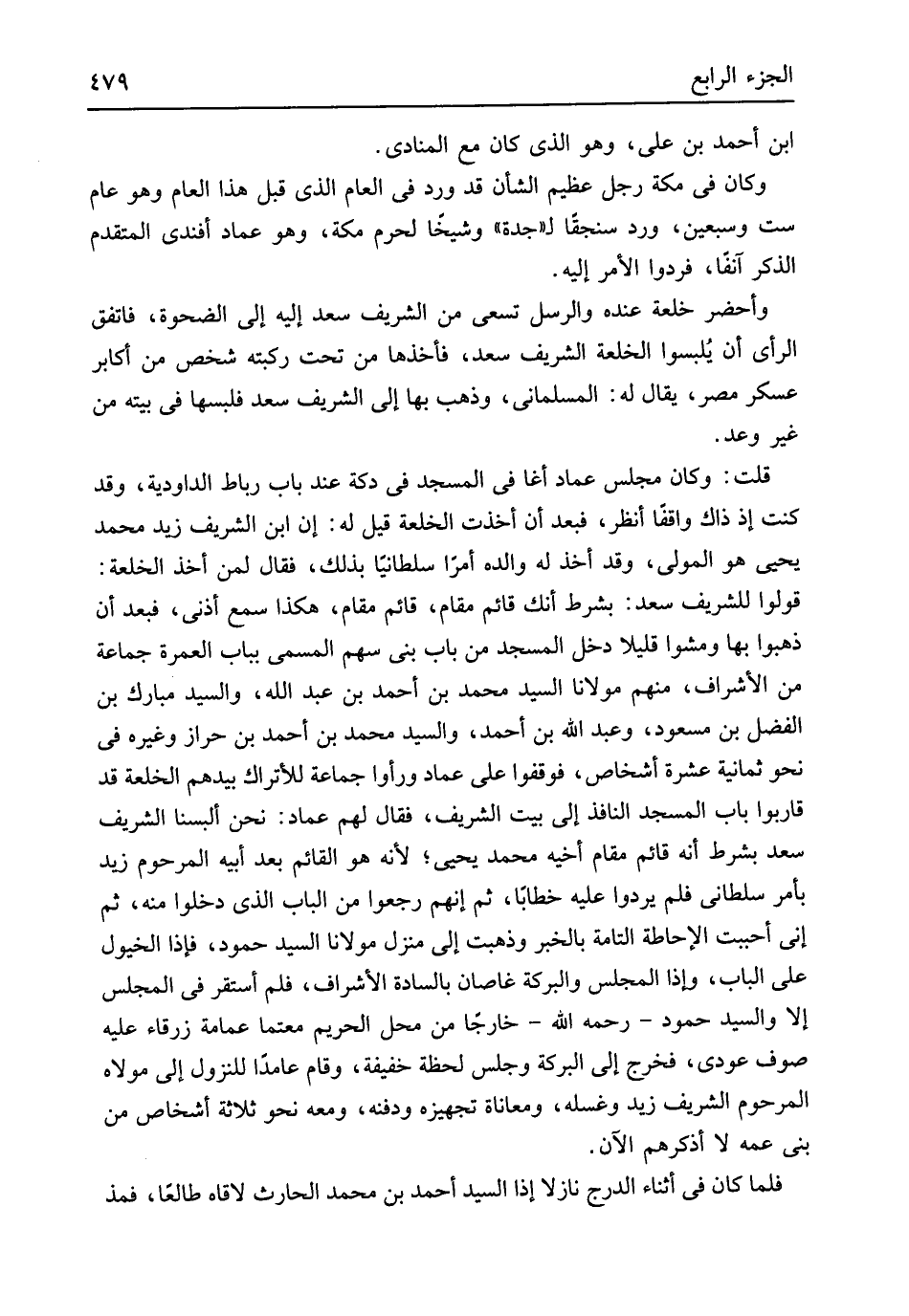 ابْن أَحْمد بن عَليّ وَهُوَ الَّذِي كَانَ مَعَ الْمُنَادِي وَكَانَ فِي مَكَّة رجل عَظِيم الشَّأْن قد ورد فِي الْعَام الَّذِي قبل هَذَا الْعَام وَهُوَ عَام سِتّ وَسبعين ورد سنجقا ل جدة وشيخاً لحرم مَكَّة وَهُوَ عماد أَفَنْدِي الْمُتَقَدّم الذّكر أنفًا فَردُّوا الْأَمر إِلَيْهِ وأحضر خلعة عِنْده وَالرسل تسْعَى من الشريف سعد إِلَيْهِ إِلَى الضحوة فاتفق الرَّأْي أَن يُلبسوا الخلعة الشريف سعد فَأَخذهَا من تَحت ركبته شخص من أكَابِر عَسْكَر مصر يُقَال لَهُ المسلماني وَذهب بهَا إِلَى الشريف سعد فلبسها فِي بَيته من غير وعد قلت وَكَانَ مجْلِس عماد أغا فِي الْمَسْجِد فِي دكة عِنْد بَاب رِبَاط الداودية وَقد كنت إِذْ ذَاك وَاقِفًا أنظر فَبعد أَن أخذت الخلعة قيل لَهُ إِن ابْن الشريف زيد مُحَمَّد يحيى هُوَ الْمولى وَقد أَخذ لَهُ وَالِده أمرا سلطانياً بذلك فَقَالَ لمن أَخذ الخلعة قُولُوا للشريف سعد بِشَرْط أَنَّك قَائِم مقَام قَائِم مقَام هَكَذَا سمع أُذُنِي فَبعد أَن ذَهَبُوا بهَا وَمَشوا قَلِيلا دخل الْمَسْجِد من بَاب بني سهم الْمُسَمّى بِبَاب الْعمرَة جمَاعَة من الْأَشْرَاف مِنْهُم مَوْلَانَا السَّيِّد مُحَمَّد بن أَحْمد بن عبد الله وَالسَّيِّد مبارك بن الْفضل بن مَسْعُود وَعبد الله بن أَحْمد وَالسَّيِّد مُحَمَّد بن أَحْمد بن حراز وَغَيره فِي نَحْو ثَمَانِيَة عشرَة أشخاص فوقفوا على عماد وَرَأَوا جمَاعَة للأتراك بيدهم الخلعة قد قاربوا بَاب الْمَسْجِد النَّافِذ إِلَى بَيت الشريف فَقَالَ لَهُم عماد نَحن ألبسنا الشريف سعد بِشَرْط أَنه قَائِم مقَام أَخِيه مُحَمَّد يحيى لِأَنَّهُ هُوَ الْقَائِم بعد أَبِيه المرحوم زيد بِأَمْر سلطاني فَلم يردوا عَلَيْهِ خطابا ثمَّ إِنَّهُم رجعُوا من الْبَاب الَّذِي دخلُوا مِنْهُ ثمَّ إِنِّي أَحْبَبْت الْإِحَاطَة التَّامَّة بالْخبر وَذَهَبت إِلَى منزل مَوْلَانَا السَّيِّد حمود فَإِذا الْخُيُول على الْبَاب وَإِذا الْمجْلس وَالْبركَة غاصان بالسادة الْأَشْرَاف فَلم أستقر فِي الْمجْلس إِلَّا وَالسَّيِّد حمود رَحمَه الله خَارِجا من مَحل الْحَرِيم معتماً عِمَامَة زرقاء عَلَيْهِ صوف عودي فَخرج إِلَى الْبركَة وَجلسَ لَحْظَة خَفِيفَة وَقَامَ عَامِدًا للنزول إِلَى مَوْلَاهُ المرحوم الشريف زيد وغسله ومعاناة تَجْهِيزه وَدَفنه وَمَعَهُ نَحْو ثَلَاثَة أشخاص من بني عَمه لَا أذكرهم الْآن فَلَمَّا كَانَ فِي أثْنَاء الدرج نازلاً إِذا السَّيِّد أَحْمد بن مُحَمَّد الْحَارِث لاقاه طالعاً فمذ