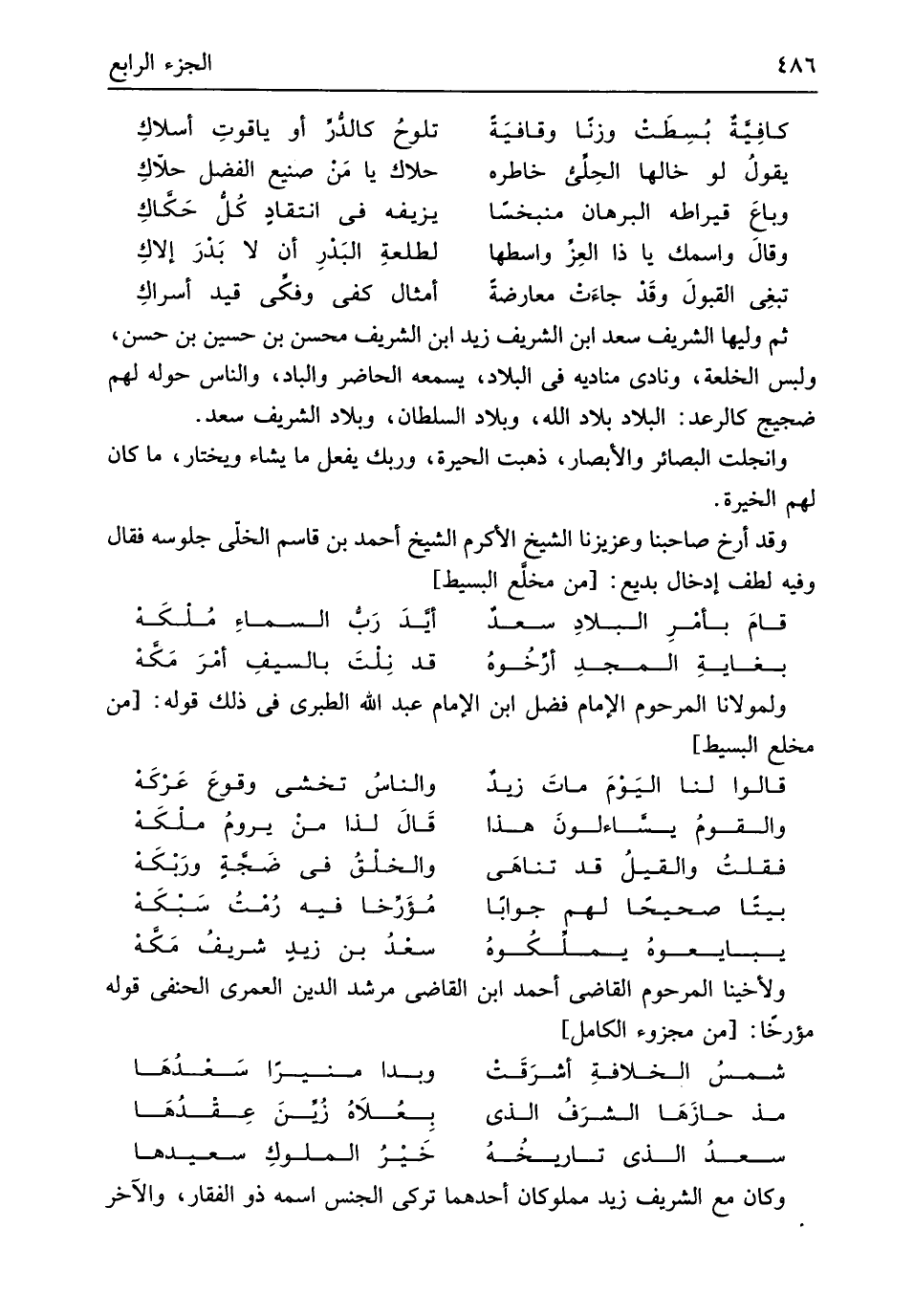ثمَّ وَليهَا الشريف سعد ابْن الشريف زيد ابْن الشريف محسن بن حُسَيْن بن حسن وَلبس الخلعة ونادي مناديه فِي الْبِلَاد يسمعهُ الْحَاضِر والباد وَالنَّاس حوله لَهُم ضجيج كالرعد الْبِلَاد بِلَاد الله وبلاد السُّلْطَان وبلاد الشريف سعد وانجلت البصائر والأبصار ذهبت الْحيرَة وَرَبك يفعل مَا يَشَاء ويختار مَا كَانَ لَهُم الْخيرَة وَقد أرخ صاحبنا وعزيزنا الشَّيْخ الأكرم الشَّيْخ أَحْمد بن قَاسم الخلي جُلُوسه فَقَالَ وَفِيه لطف إِدْخَال بديع // (من مخلَع الْبَسِيط) //